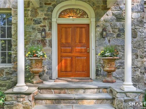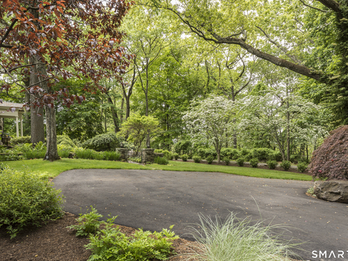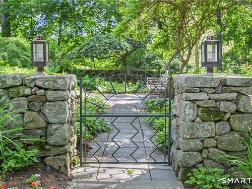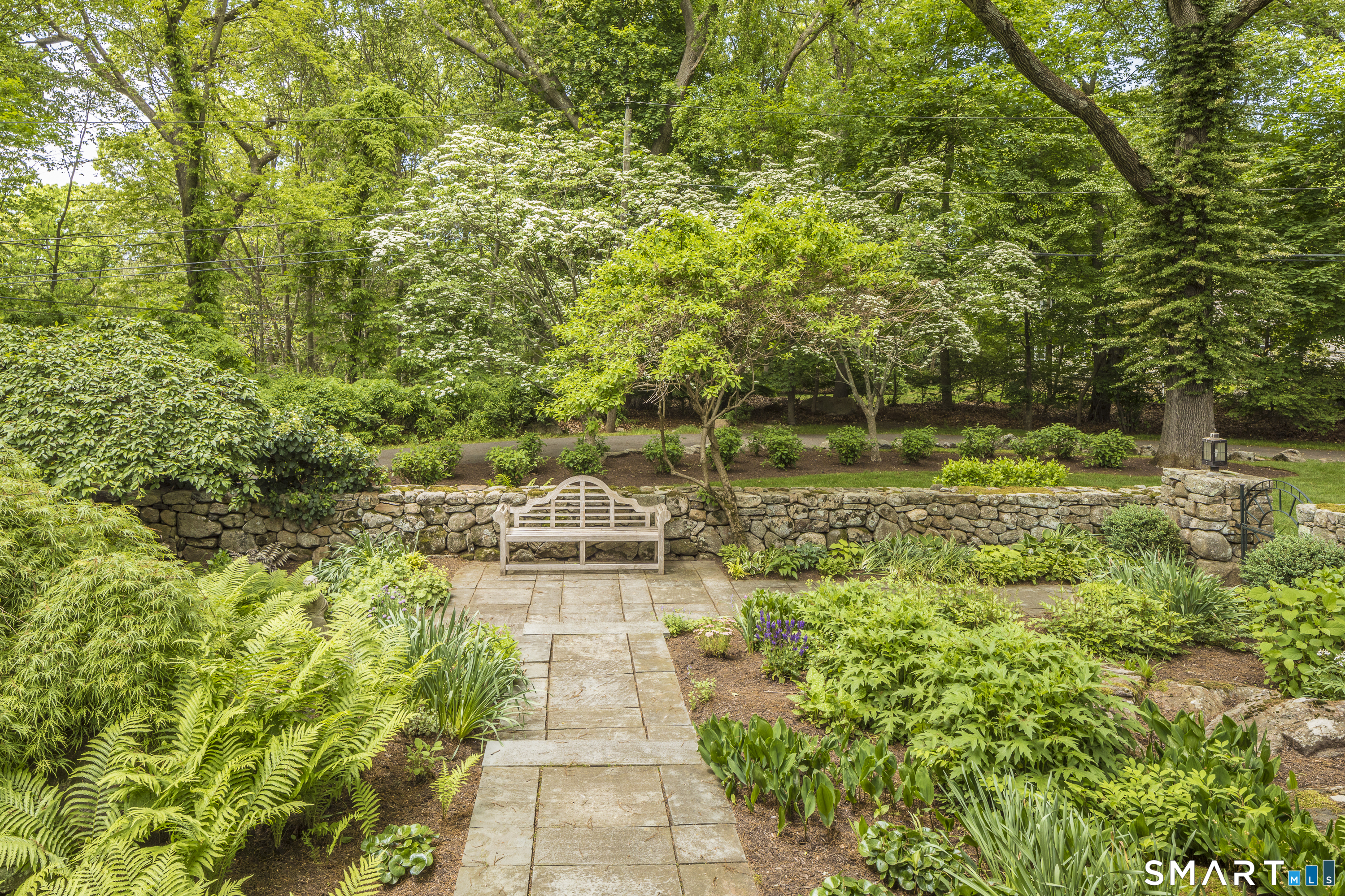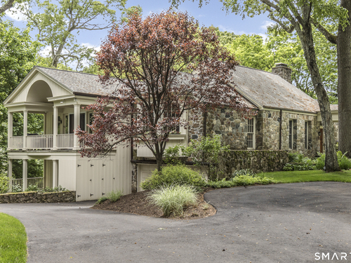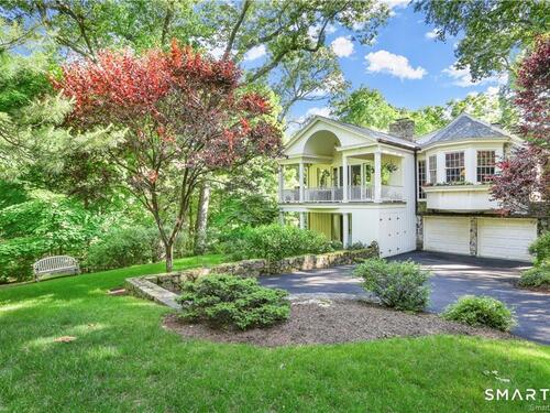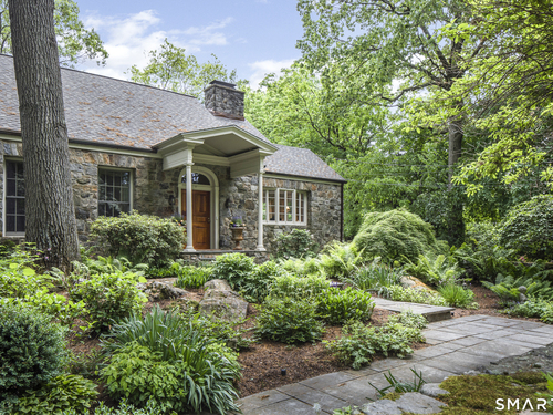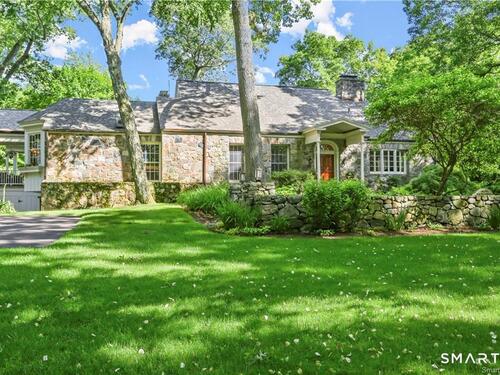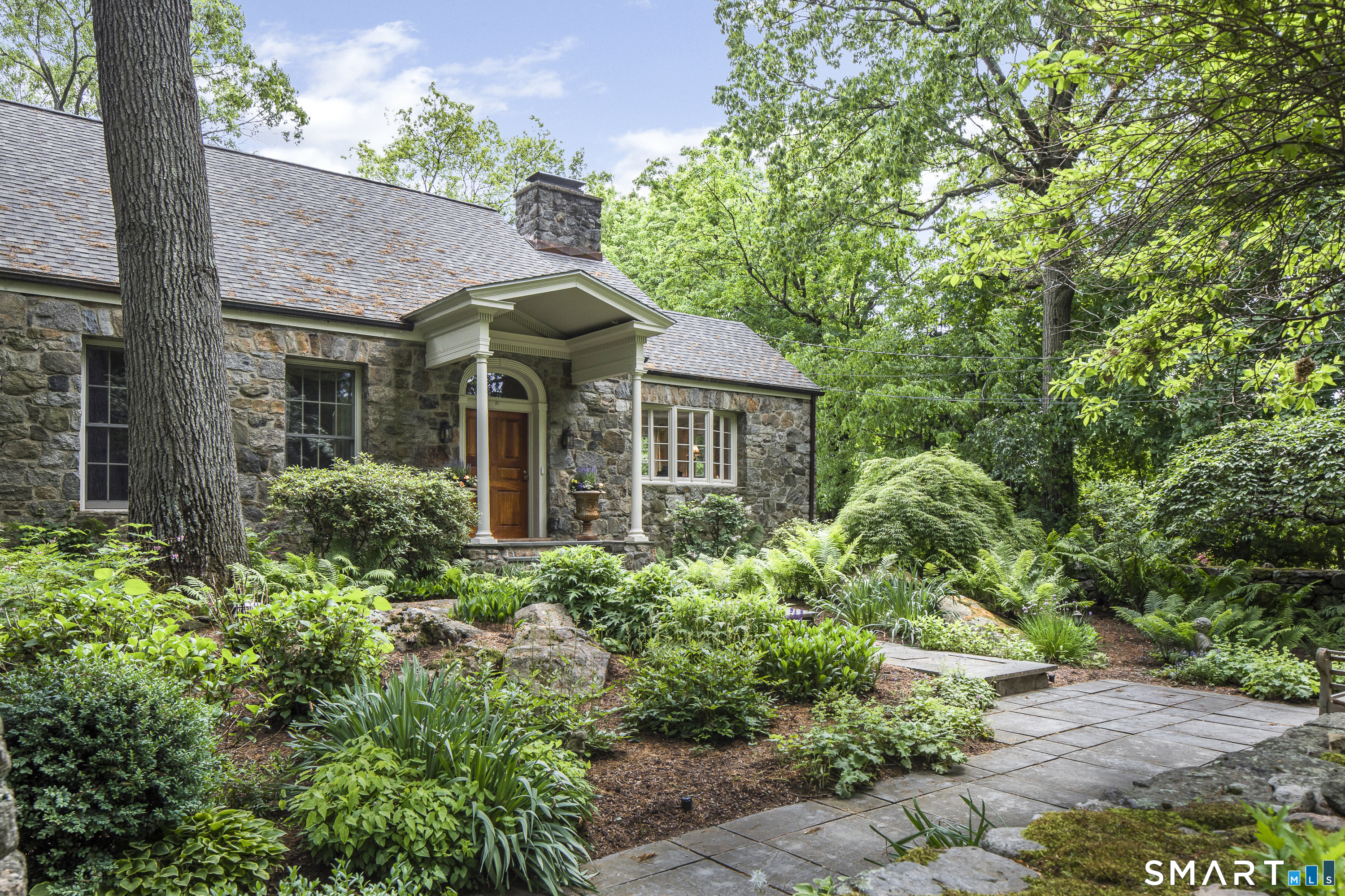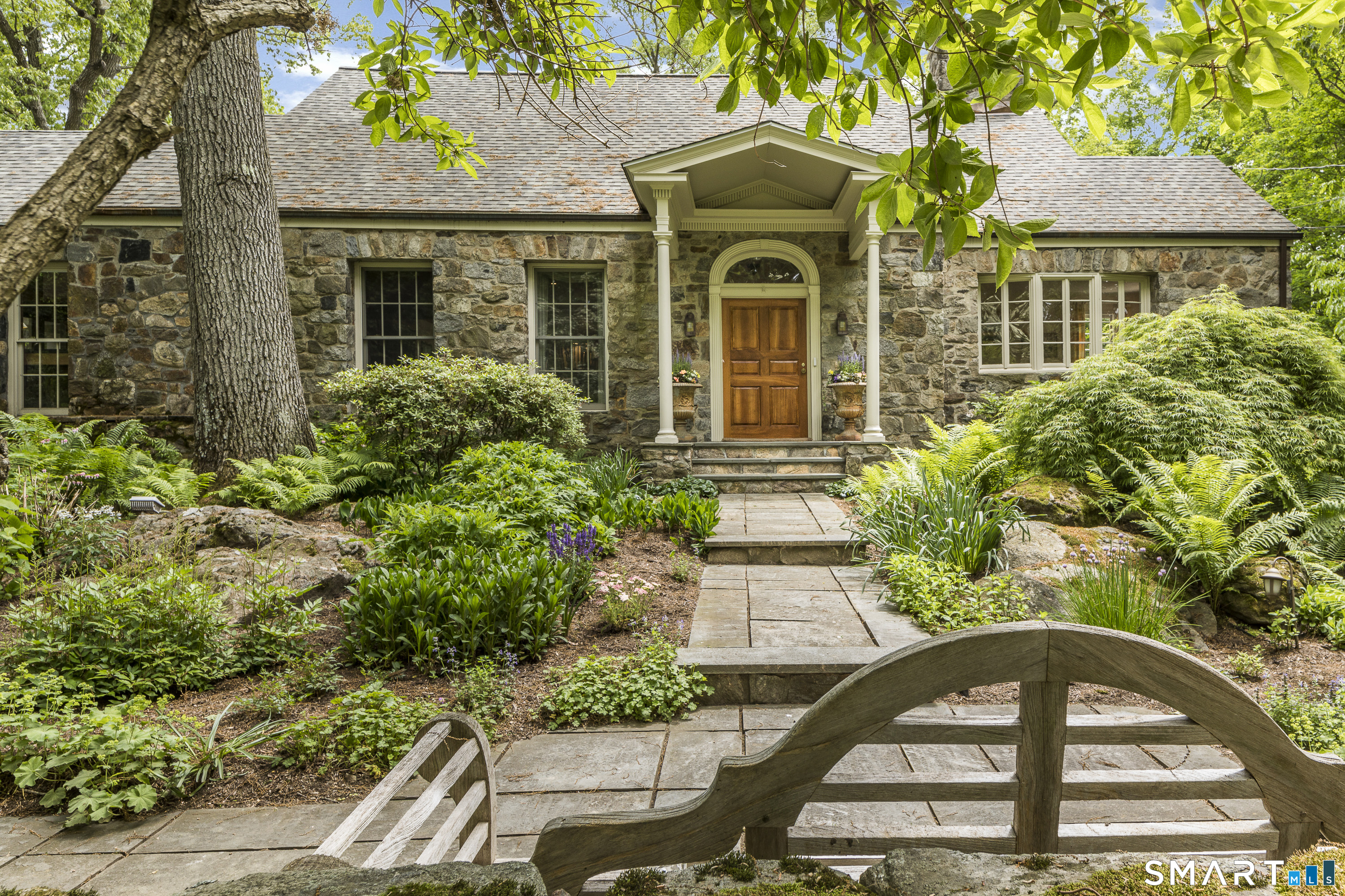 A rare opportunity to live on Topping Lane, a private wooded enclave Rowayton adjacent. Set atop a gentle rise on 1.35 bucolic acres, this gracious stone-and-shingle residence offers five bedrooms and three and one-half baths in a serene, storybook setting defined by privacy, craftsmanship, and natural beauty. A circular drive winds through mature perennial gardens and English-style plantings to a substantial cherry front door, opening into an elegant foyer with wide-plank wood floors. The main level features a formal living room with fireplace, a formal dining room, a cherry-paneled library with fireplace, and a music room that anchors the home with warmth and character. At the heart of the residence is a spectacular kitchen-family room combination, renovated in the 1990s, unified by custom cherry millwork and soaring, chapel-like ceilings-ideal for both everyday living and entertaining. The chef's kitchen is exceptionally well equipped with Sub-Zero refrigeration, a commercial walk-in, a 60-inch Viking range, dual convection ovens, two dishwashers, and a convenient dumbwaiter to the garage. French doors open to a vaulted deck overlooking wooded grounds, ravine, and brook beyond. The primary suite occupies a private ground-level position, featuring warm maple finishes and a recently renovated spa-like bath with an oversized shower, soaking tub, and expansive alabaster countertops. A truly special offering in one of Norwalk's most coveted locations!