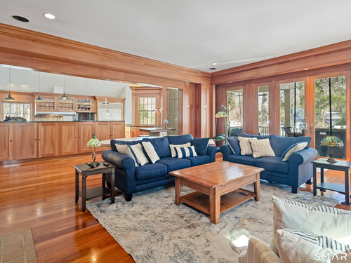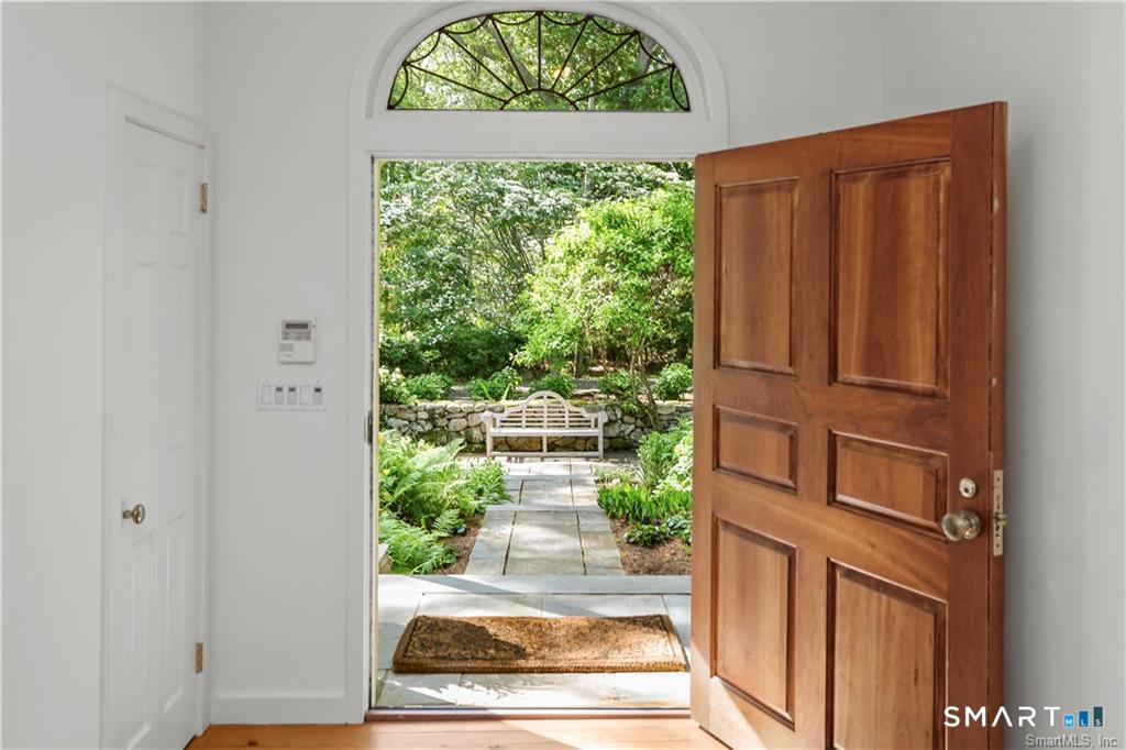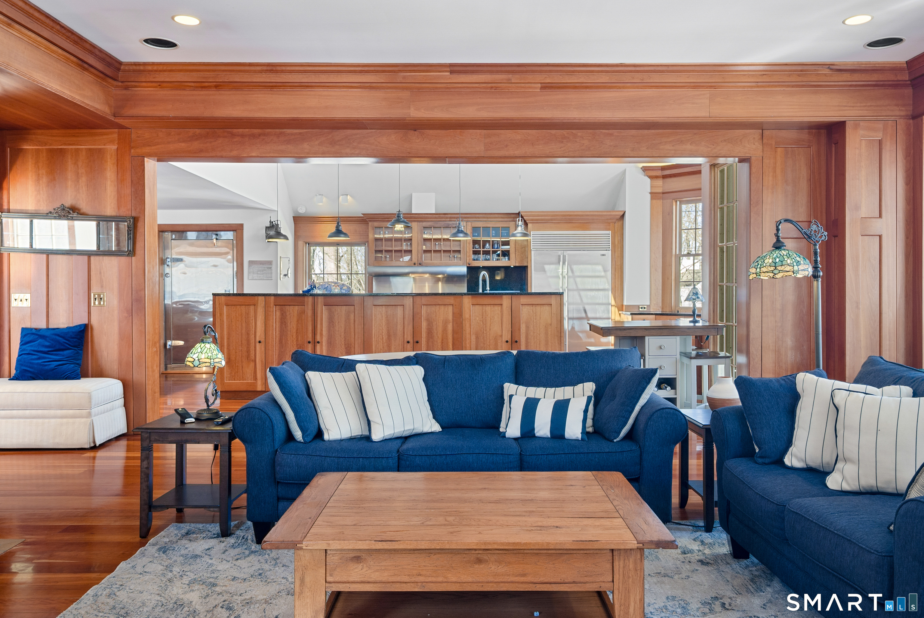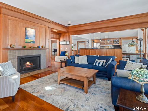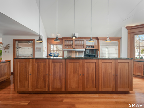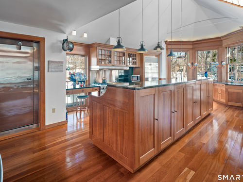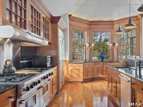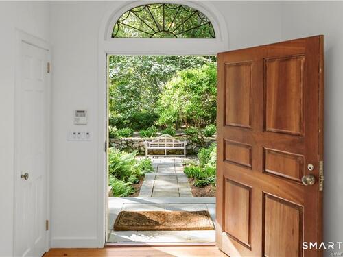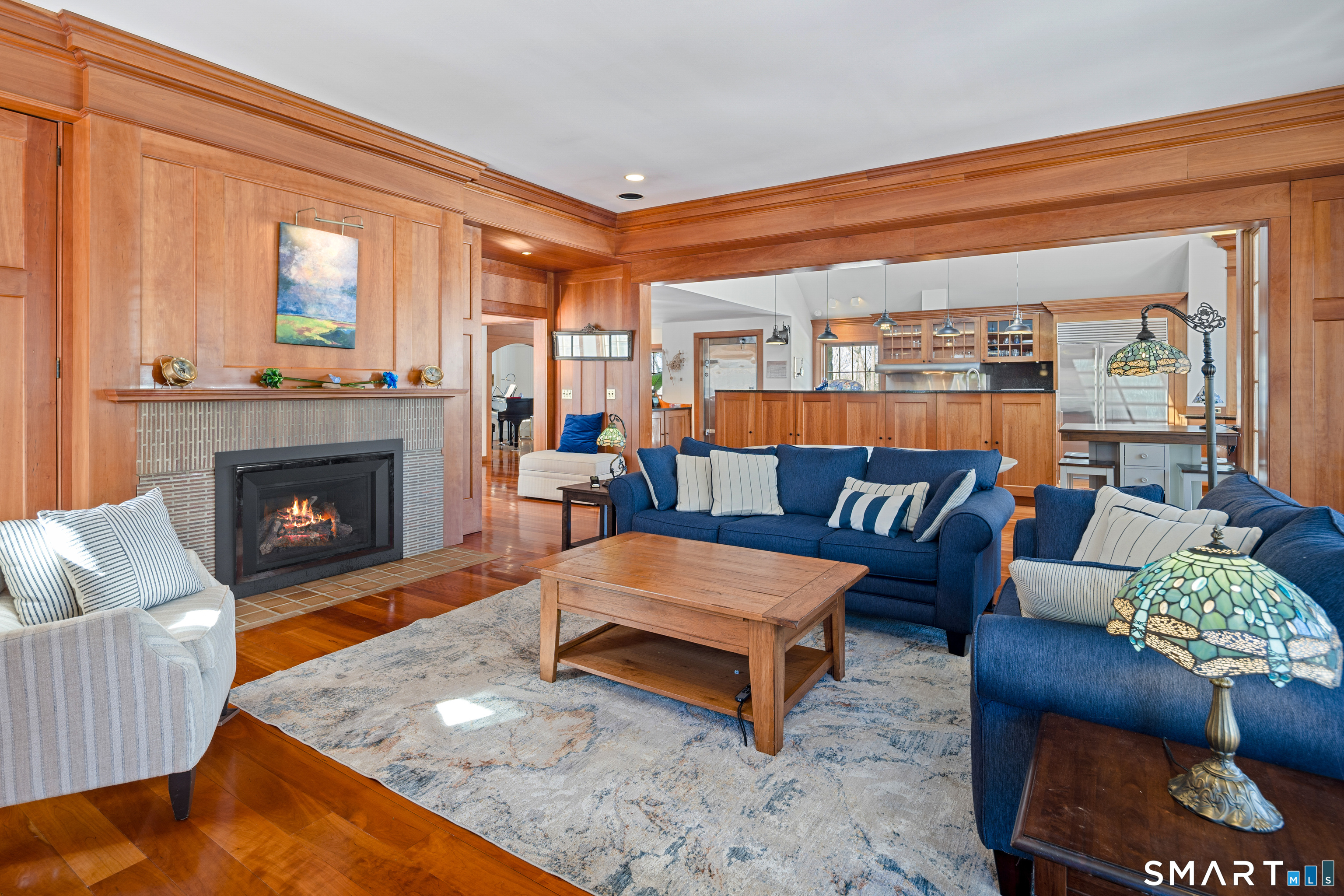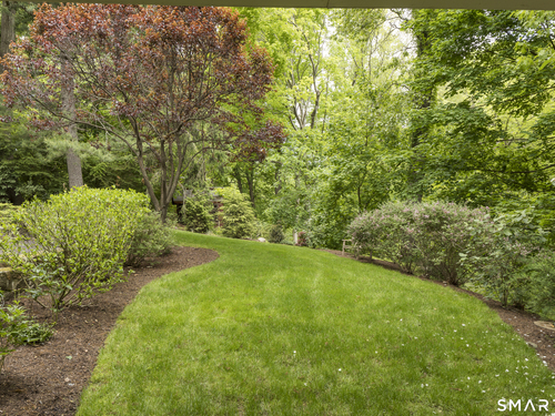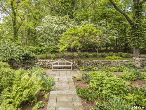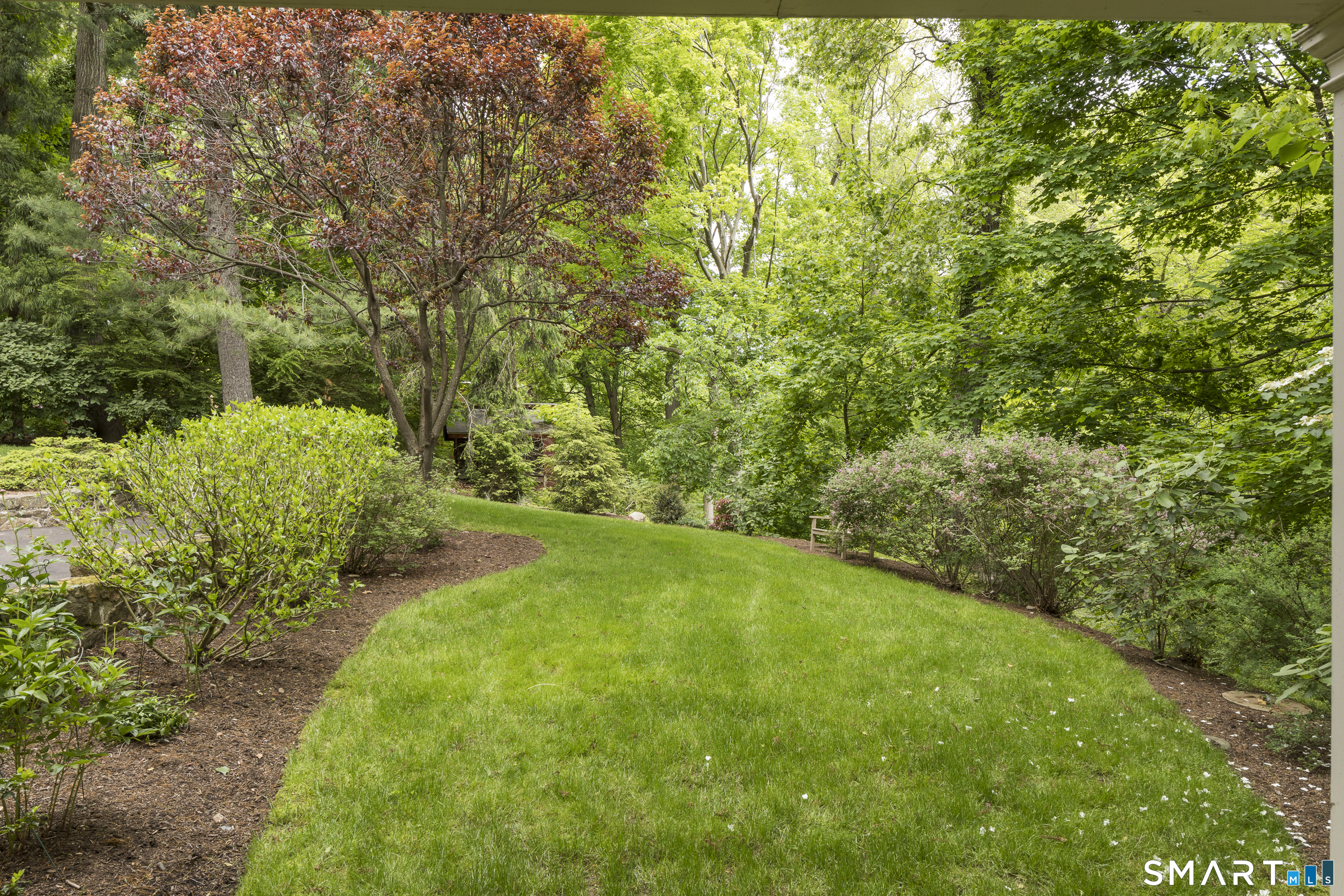 A rare opportunity to live on Topping Lane, a private wooded enclave Rowayton adjacent. Set atop a gentle rise on 1.35 bucolic acres, this gracious stone-and-shingle residence offers five bedrooms and three and one-half baths in a serene, storybook setting defined by privacy, craftsmanship, and natural beauty. A circular drive winds through mature perennial gardens and English-style plantings to a substantial cherry front door, opening into an elegant foyer with wide-plank wood floors. The main level features a formal living room with fireplace, a formal dining room, a cherry-paneled library with fireplace, and a music room that anchors the home with warmth and character. At the heart of the residence is a spectacular kitchen-family room combination, renovated in the 1990s, unified by custom cherry millwork and soaring, chapel-like ceilings-ideal for both everyday living and entertaining. The chef's kitchen is exceptionally well equipped with Sub-Zero refrigeration, a commercial walk-in, a 60-inch Viking range, dual convection ovens, two dishwashers, and a convenient dumbwaiter to the garage. French doors open to a vaulted deck overlooking wooded grounds, ravine, and brook beyond. The primary suite occupies a private ground-level position, featuring warm maple finishes and a recently renovated spa-like bath with an oversized shower, soaking tub, and expansive alabaster countertops. A truly special offering in one of Norwalk's most coveted locations!