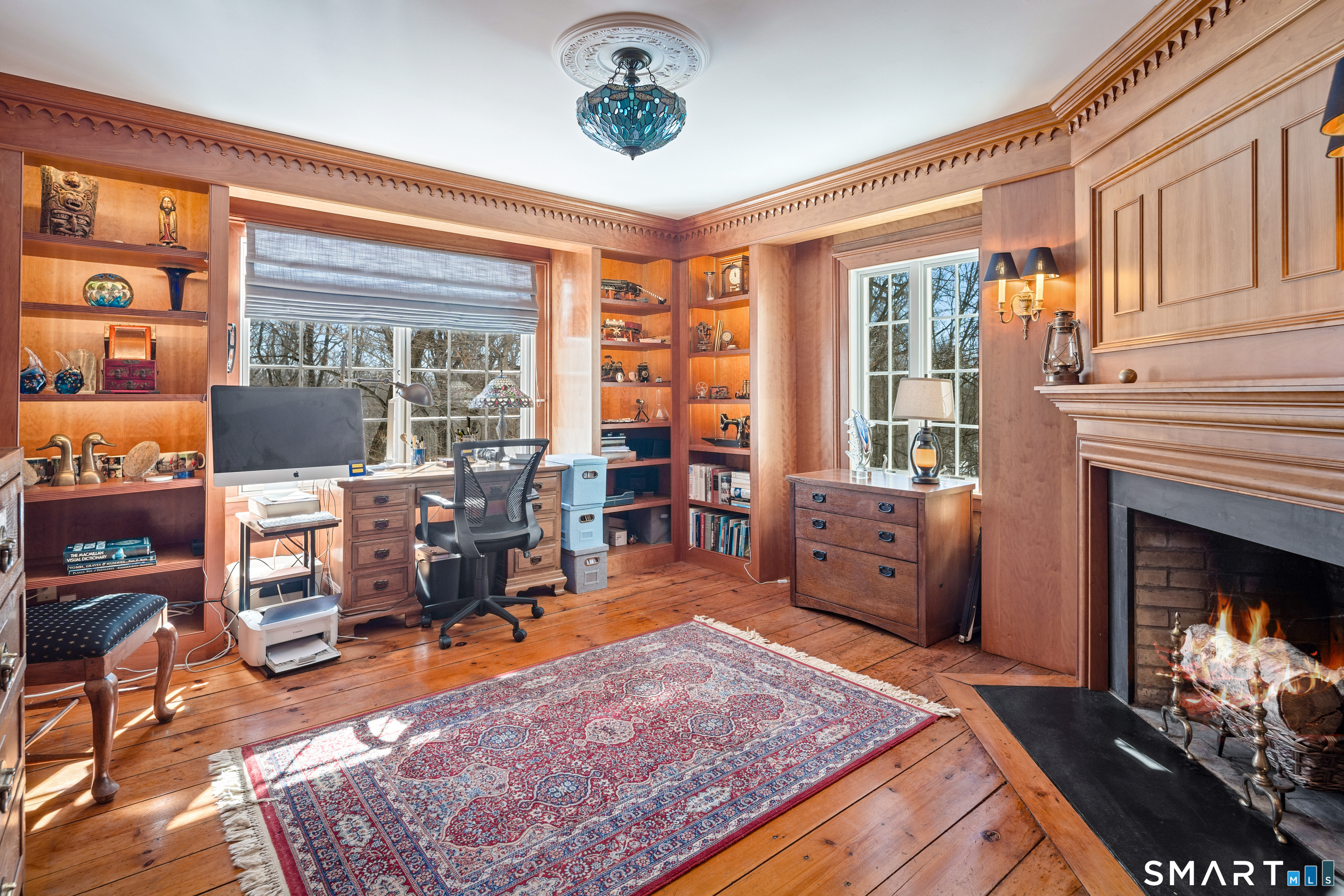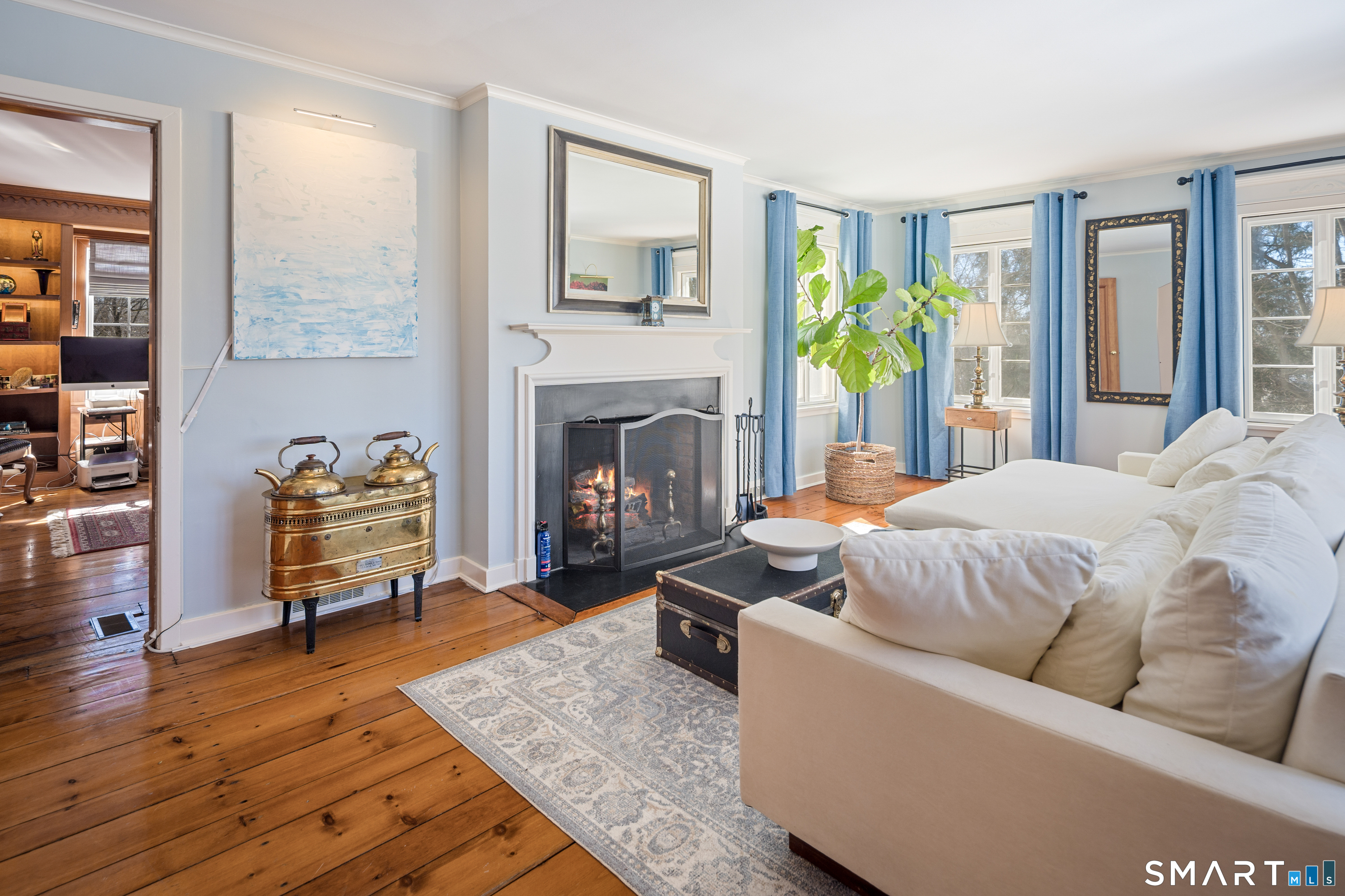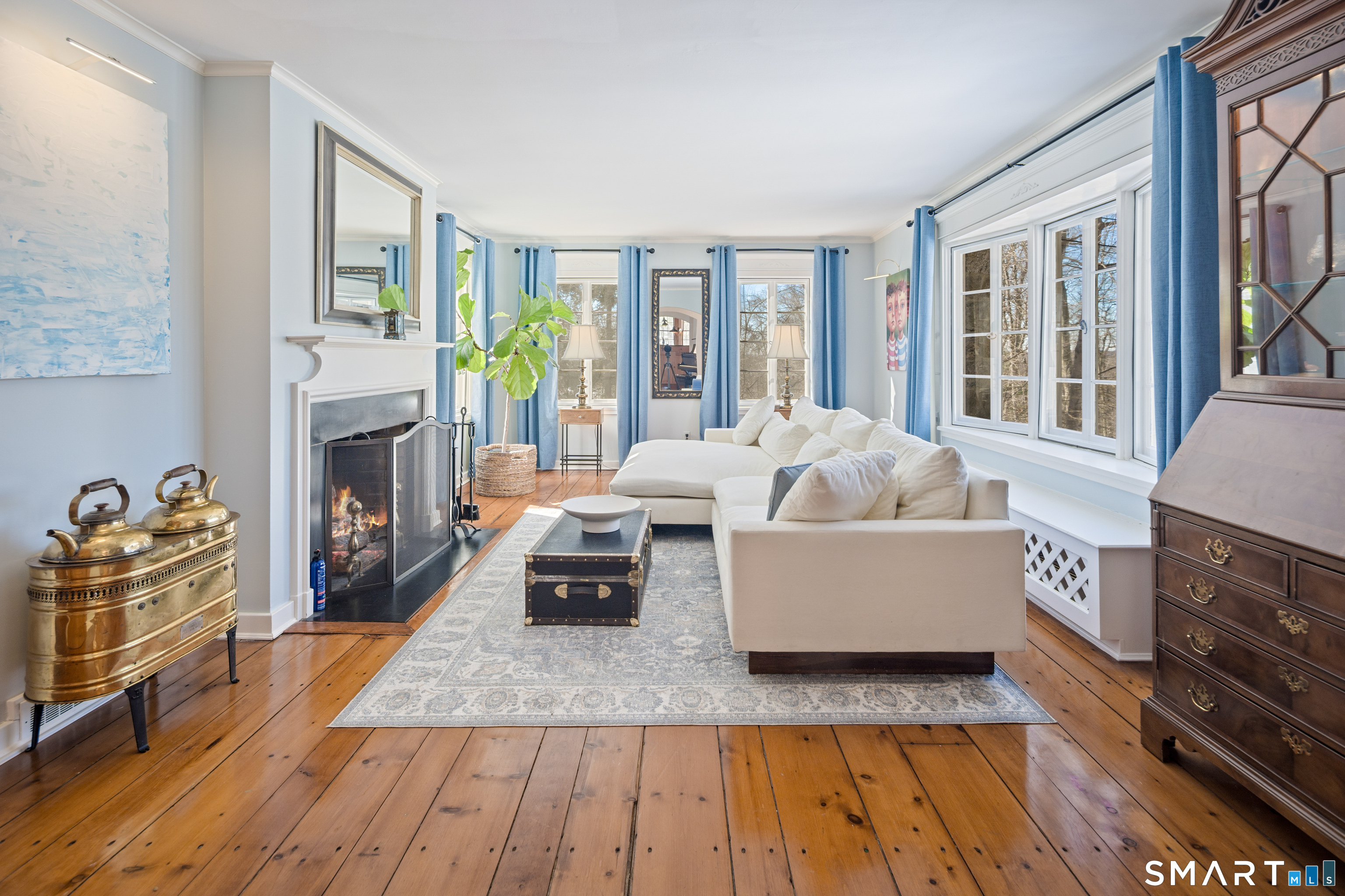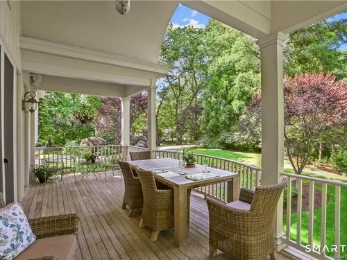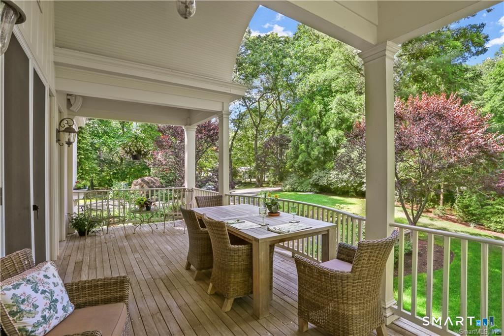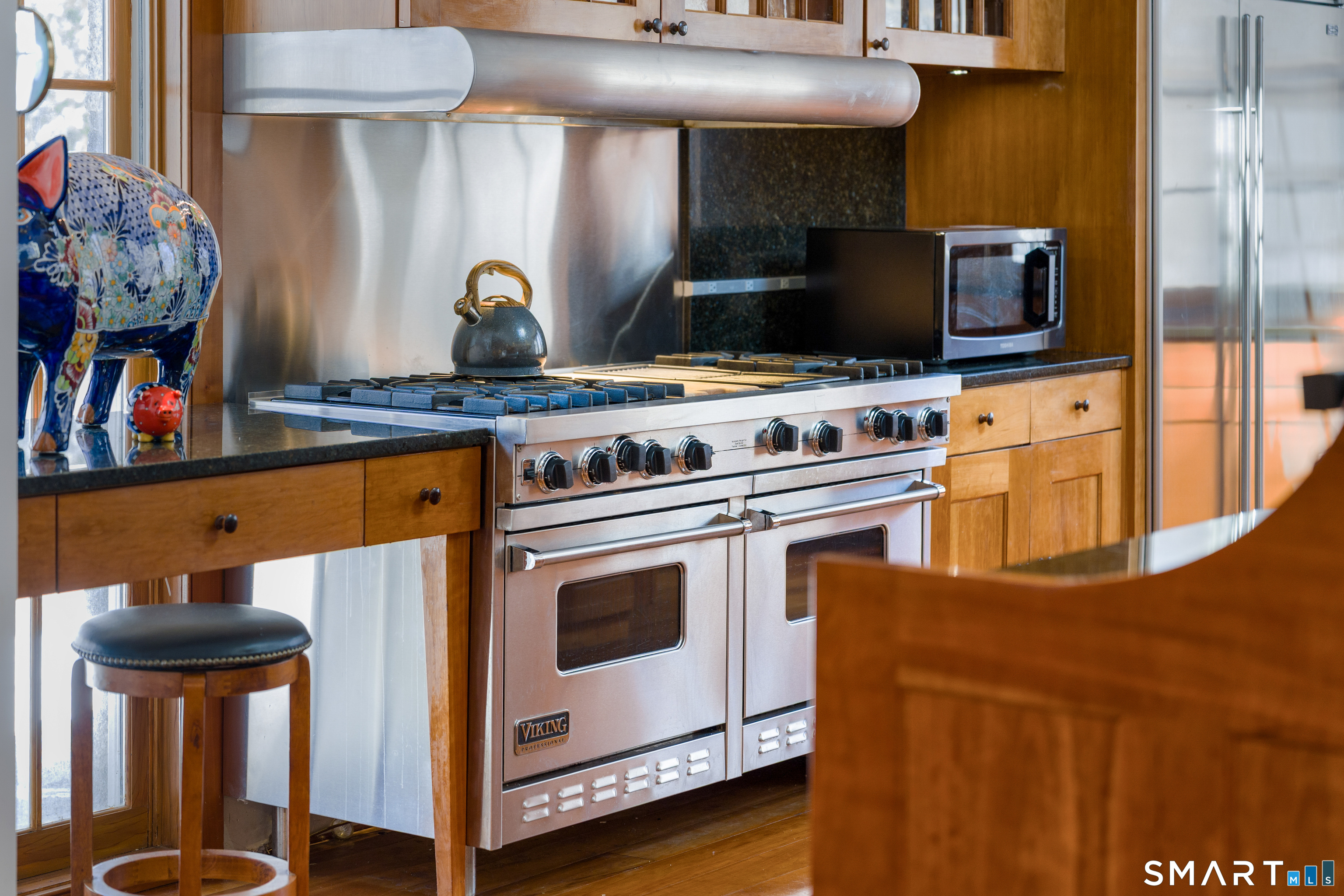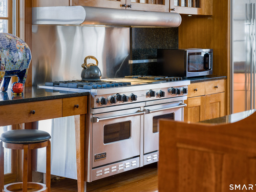 A rare opportunity to live on Topping Lane, a private wooded enclave Rowayton adjacent. Set atop a gentle rise on 1.35 bucolic acres, this gracious stone-and-shingle residence offers five bedrooms and three and one-half baths in a serene, storybook setting defined by privacy, craftsmanship, and natural beauty. A circular drive winds through mature perennial gardens and English-style plantings to a substantial cherry front door, opening into an elegant foyer with wide-plank wood floors. The main level features a formal living room with fireplace, a formal dining room, a cherry-paneled library with fireplace, and a music room that anchors the home with warmth and character. At the heart of the residence is a spectacular kitchen-family room combination, renovated in the 1990s, unified by custom cherry millwork and soaring, chapel-like ceilings-ideal for both everyday living and entertaining. The chef's kitchen is exceptionally well equipped with Sub-Zero refrigeration, a commercial walk-in, a 60-inch Viking range, dual convection ovens, two dishwashers, and a convenient dumbwaiter to the garage. French doors open to a vaulted deck overlooking wooded grounds, ravine, and brook beyond. The primary suite occupies a private ground-level position, featuring warm maple finishes and a recently renovated spa-like bath with an oversized shower, soaking tub, and expansive alabaster countertops. A truly special offering in one of Norwalk's most coveted locations!