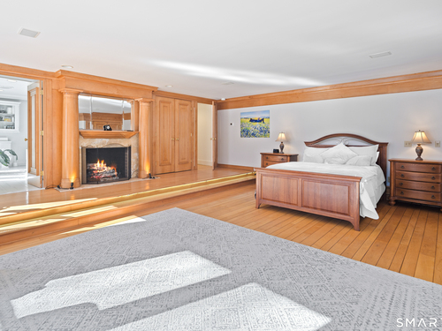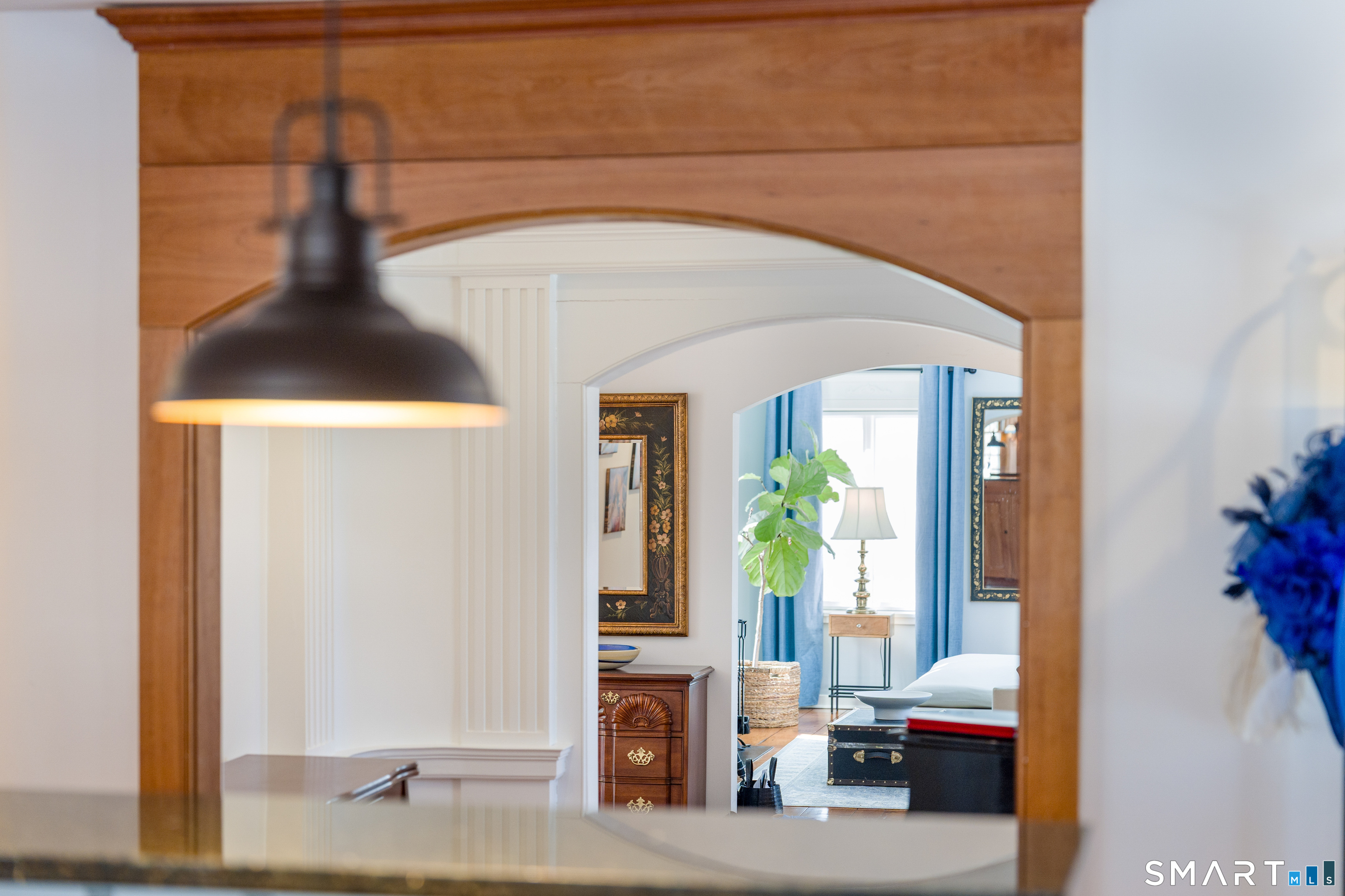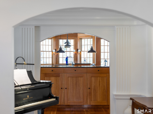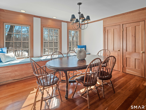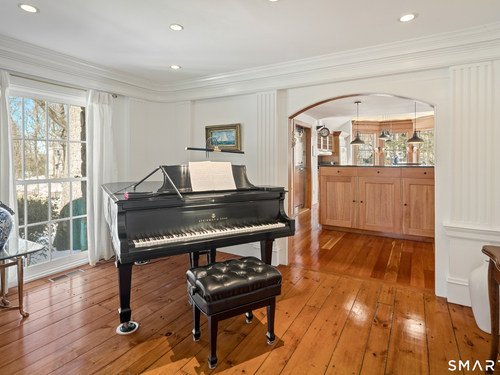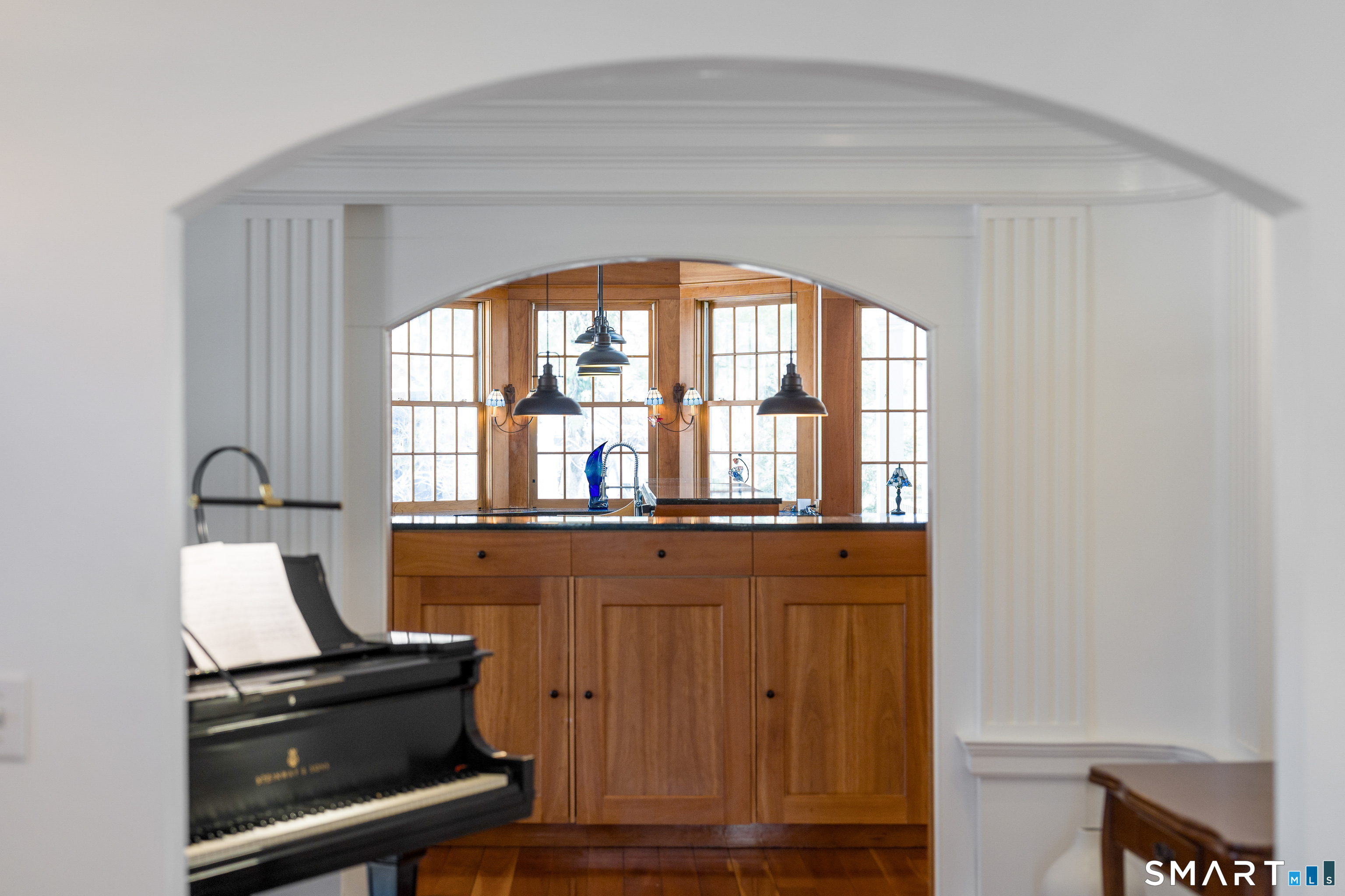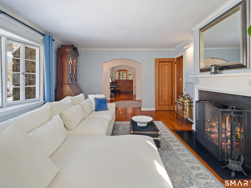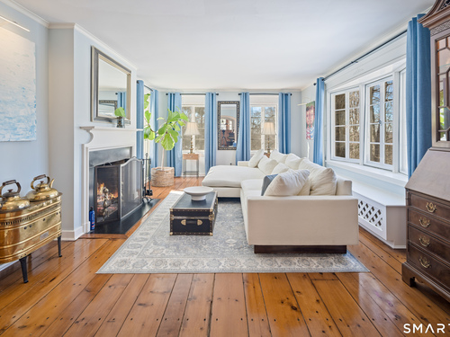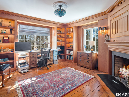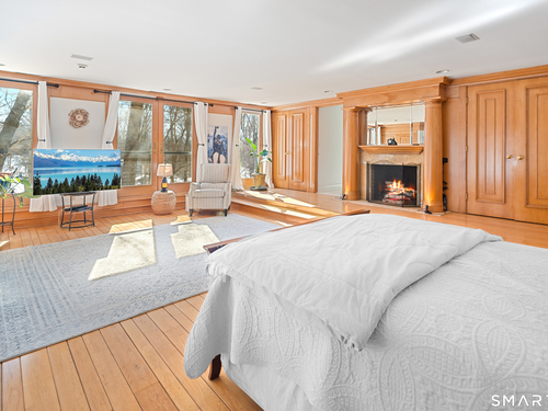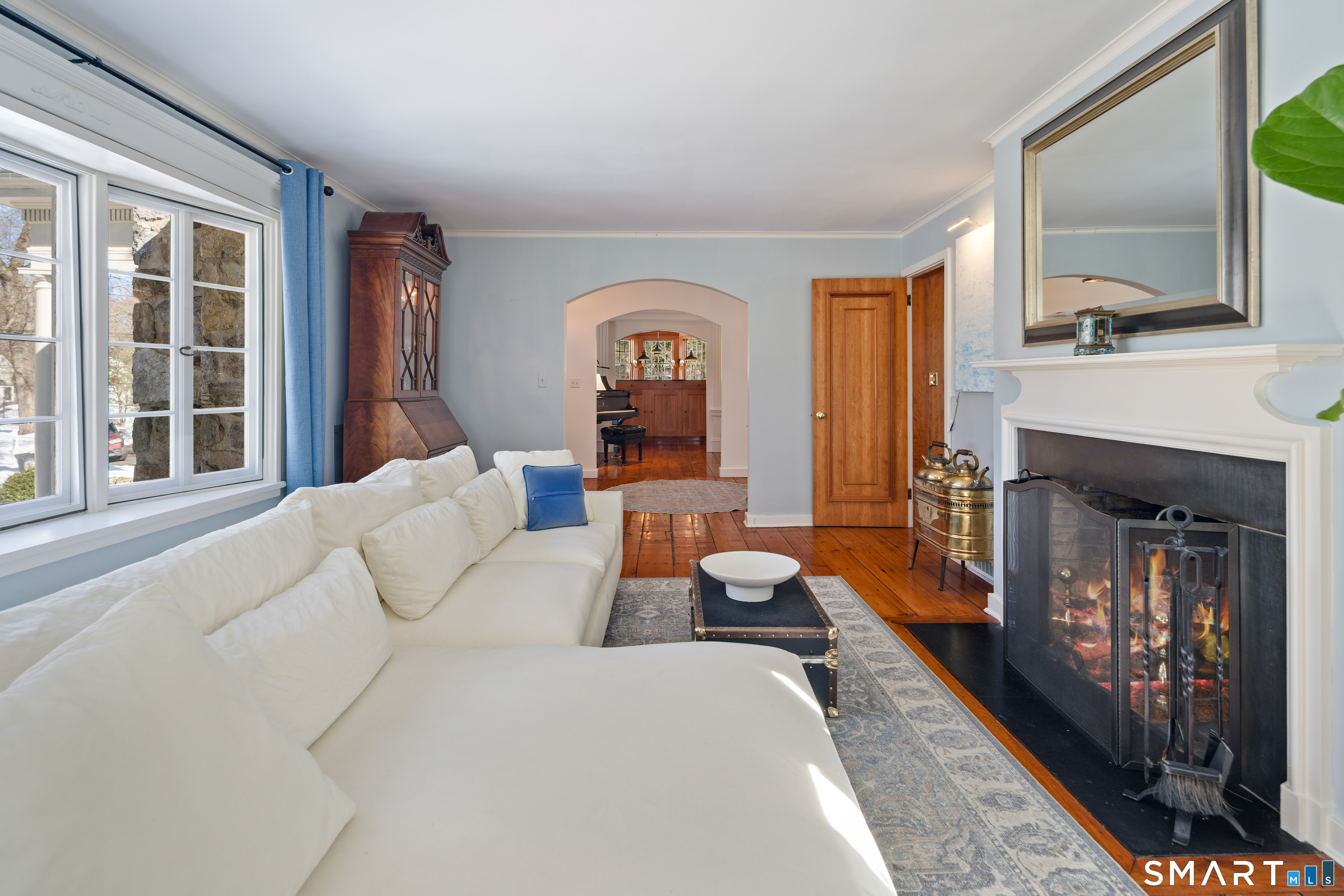 A rare opportunity to live on Topping Lane, a private wooded enclave Rowayton adjacent. Set atop a gentle rise on 1.35 bucolic acres, this gracious stone-and-shingle residence offers five bedrooms and three and one-half baths in a serene, storybook setting defined by privacy, craftsmanship, and natural beauty. A circular drive winds through mature perennial gardens and English-style plantings to a substantial cherry front door, opening into an elegant foyer with wide-plank wood floors. The main level features a formal living room with fireplace, a formal dining room, a cherry-paneled library with fireplace, and a music room that anchors the home with warmth and character. At the heart of the residence is a spectacular kitchen-family room combination, renovated in the 1990s, unified by custom cherry millwork and soaring, chapel-like ceilings-ideal for both everyday living and entertaining. The chef's kitchen is exceptionally well equipped with Sub-Zero refrigeration, a commercial walk-in, a 60-inch Viking range, dual convection ovens, two dishwashers, and a convenient dumbwaiter to the garage. French doors open to a vaulted deck overlooking wooded grounds, ravine, and brook beyond. The primary suite occupies a private ground-level position, featuring warm maple finishes and a recently renovated spa-like bath with an oversized shower, soaking tub, and expansive alabaster countertops. A truly special offering in one of Norwalk's most coveted locations!