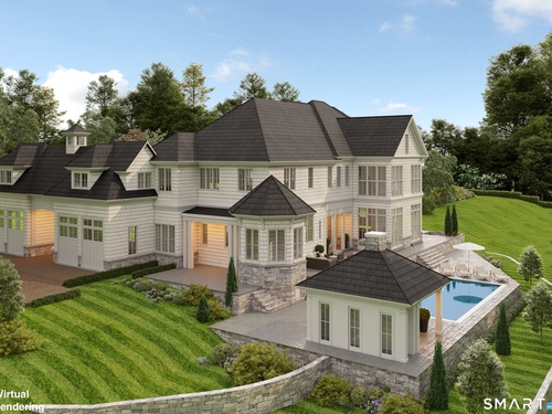 Stunning New Construction. A Grand Estate of Architectural Distinction. This Incredible new build was Conceived and Constructed without Compromise. A build of enduring significance beautifully set on 4 acres. Spanning 17,197 square feet, this residence achieves extraordinary vertical volume with 11-foot ceilings on the main level and a breathtaking two-and-a-half-story family room framed by floor-to-ceiling glass. The main level features a Chef's kitchen with an oversized 14-foot island, a glass-enclosed wine room, a stately library and a first floor guest suite. Upstairs, the private primary wing offers a dramatic atrium, vaulted ceilings, and "boutique" level his-and-hers closets. The walk-out lower level with 11 foot ceilings serves as a private resort-level retreat, featuring a glass-enclosed fitness center, a serene octagonal meditation room, and a state-of-the-art golf simulator. Outside, a 3,200-square-foot multi-level masonry terrace leads to a resort-style pool and a fully appointed pool house with a wood-burning fireplace. This estate features a black slate roof, Marvin high-performance windows, and intelligent luxury systems including a Lutron smart lighting system, a 38KW standby generator, and electric vehicle charging. This purpose built masterpiece is designed to stand apart in one of Greenwich's most prestigious settings. Completion expected spring of 2027.