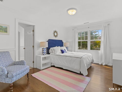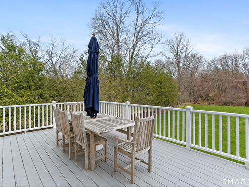 Located in Westport's coveted Greens Farms neighborhood, this light-filled home is perfectly sited high and dry on a private park-like acre with room for a pool and pool house. A renovated kitchen with top-of-the-line appliances and sunny breakfast nook opens to a spacious great room with stone fireplace and expansive deck overlooking the property, ideal for indoor-outdoor living. The flexible floor plan includes a rare first-floor bedroom with full bath, ideal for guests, au pair, or multi-generational living, along with a finished walk-out lower level offering additional space for recreation, media, or work-from-home needs. The primary suite features two walk-in closets and a new spa-like bath. With 5 bedrooms and 5 baths, the home offers ample space for living, working, and entertaining. Modern conveniences include city water, city sewer, natural gas, and an EV charger. Exceptional location just minutes to Greens Farms Elementary, the Greens Farms train station, Burying Hill Beach, and downtown Westport shopping and dining.