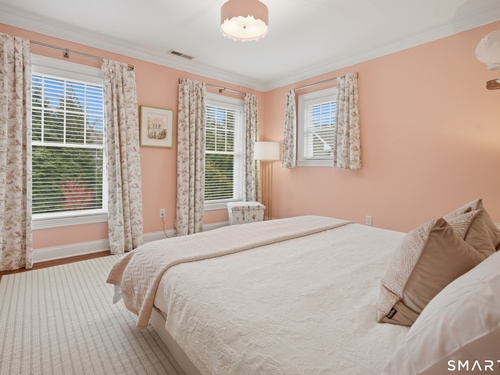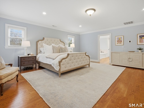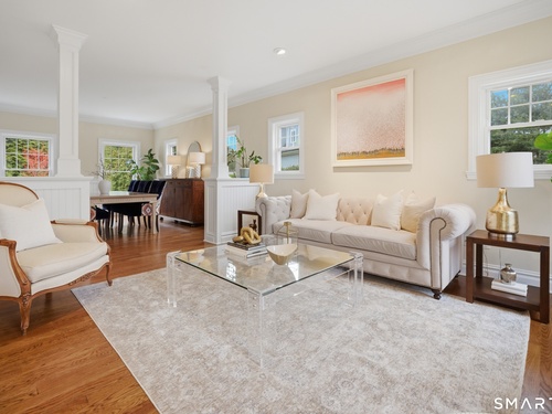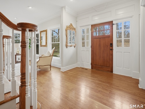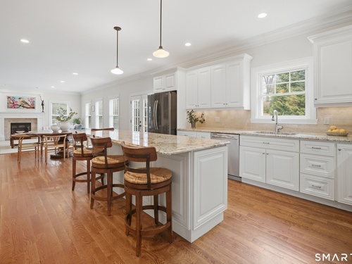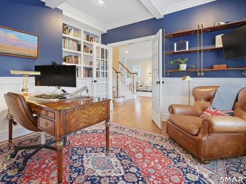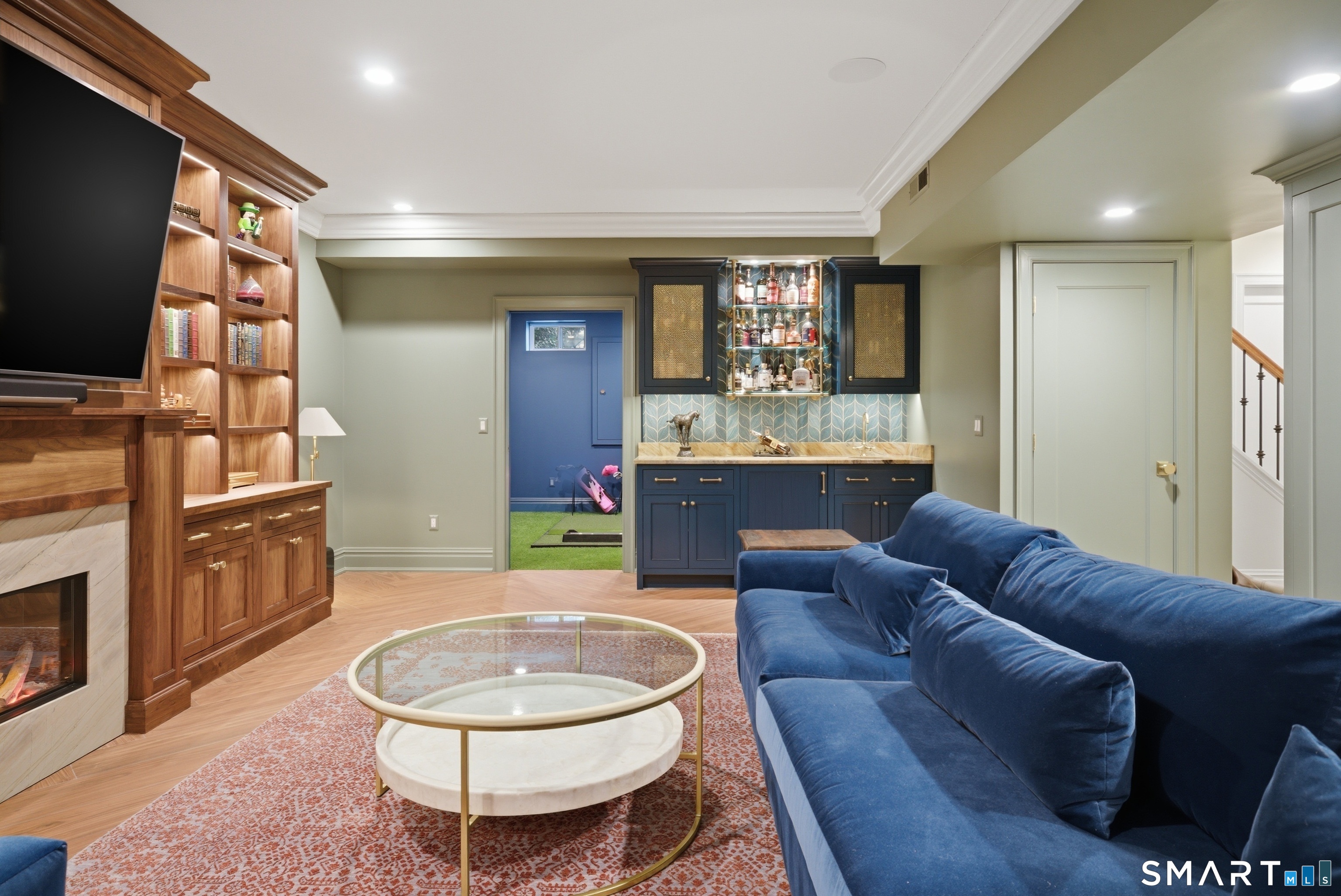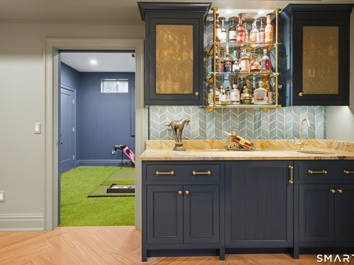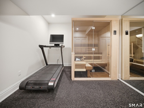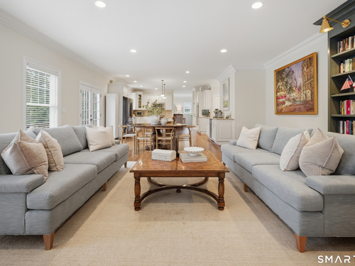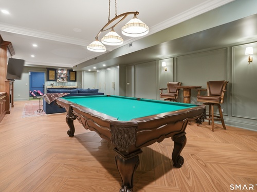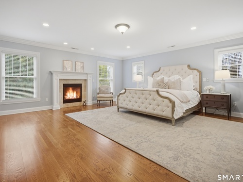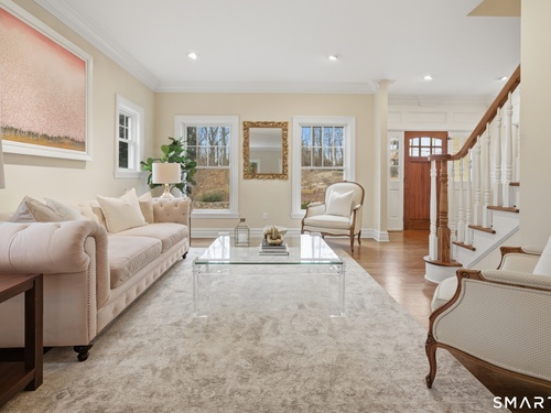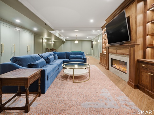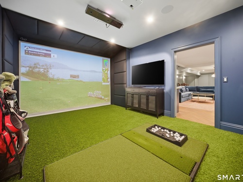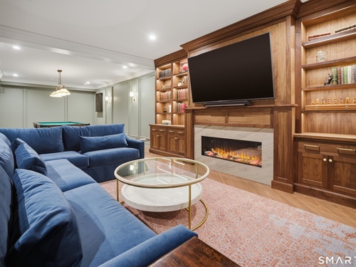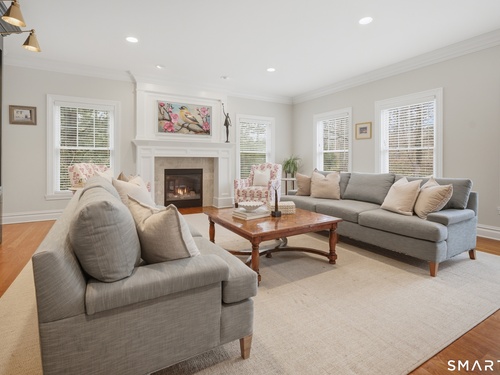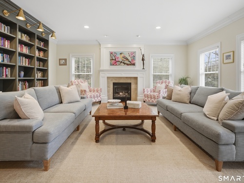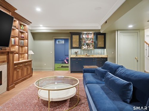 Rare newer construction in one of Fairfield's most desirable walk-to-town neighborhoods. Built in 2012, this exceptional 4 bedroom, 4.5 bath Colonial offers a thoughtfully designed open layout, beautiful millwork, & a spectacular, newly completed luxury lower level designed for recreation & entertaining. The main level features hardwood floors throughout & comfortable, well-proportioned living spaces. The kitchen with eat-in dining area flows naturally into the family room w/ custom built-ins & a gas fireplace, creating an inviting setting for daily living & entertaining. A formal living room, dining room & private home office w/ coffered ceilings provide flexible space for work or relaxation. A powder room & direct access to the two-car garage complete the first floor. Upstairs, the primary suite includes a gas fireplace, en-suite bath, expansive walk in closet & an adjoining bonus room that may serve as a nursery, home office, or potential 5th bedroom. Three additional bedrooms include one en suite, while the other two share a hall bath. A second-floor laundry room adds convenience to everyday living. The exceptional newly finished lower level by Domus Construction is designed as a true lifestyle retreat. Features include a spacious great room w/ a custom walnut entertainment wall, a wet bar w/ marble countertops & custom cabinetry, a dedicated golf simulator room, a gym w/ sauna, & a full bath.
