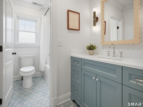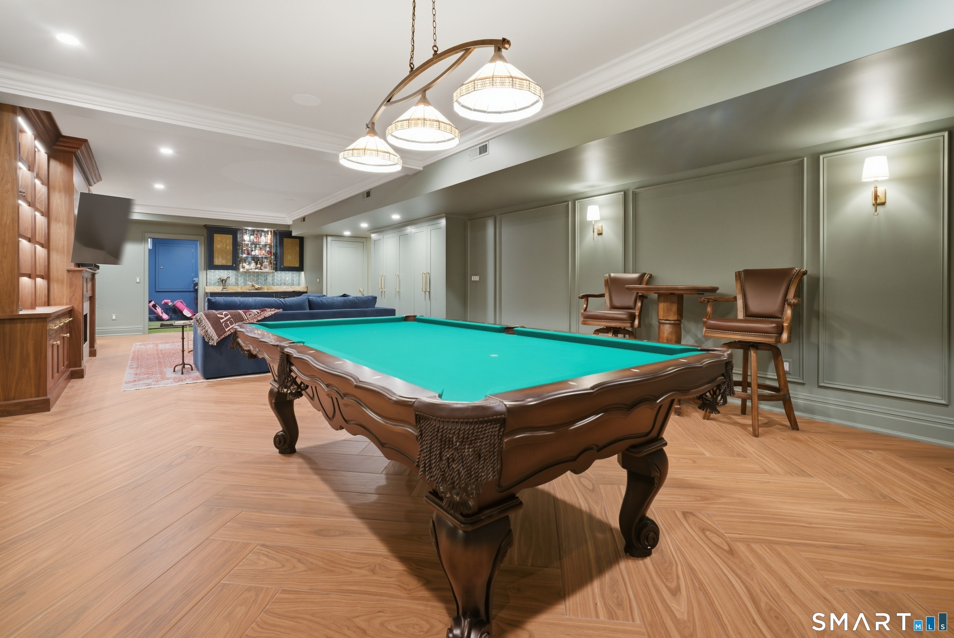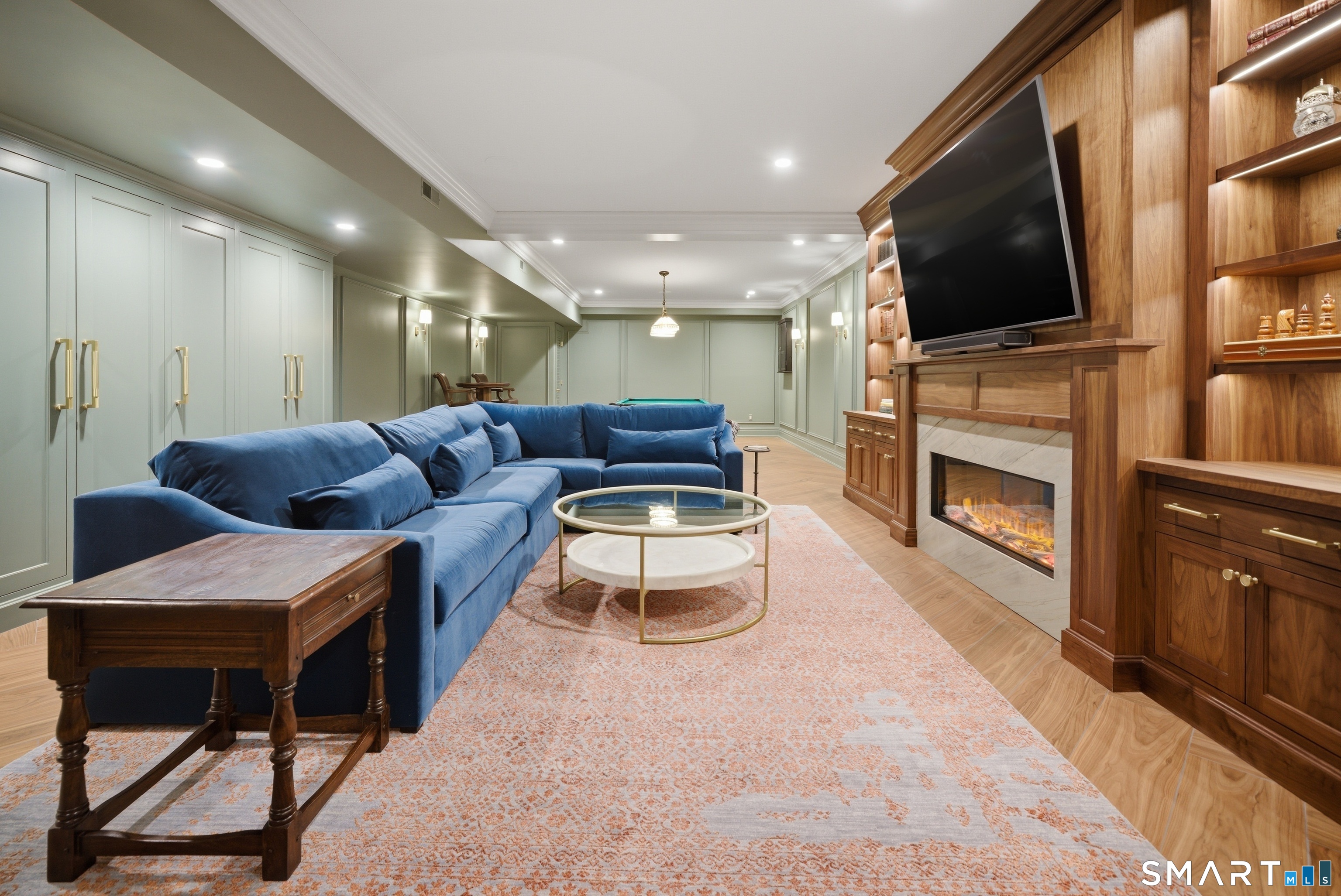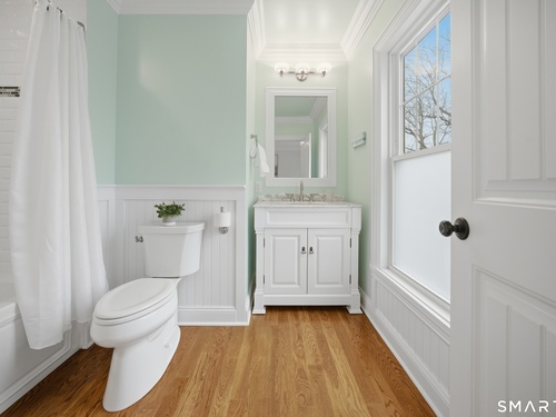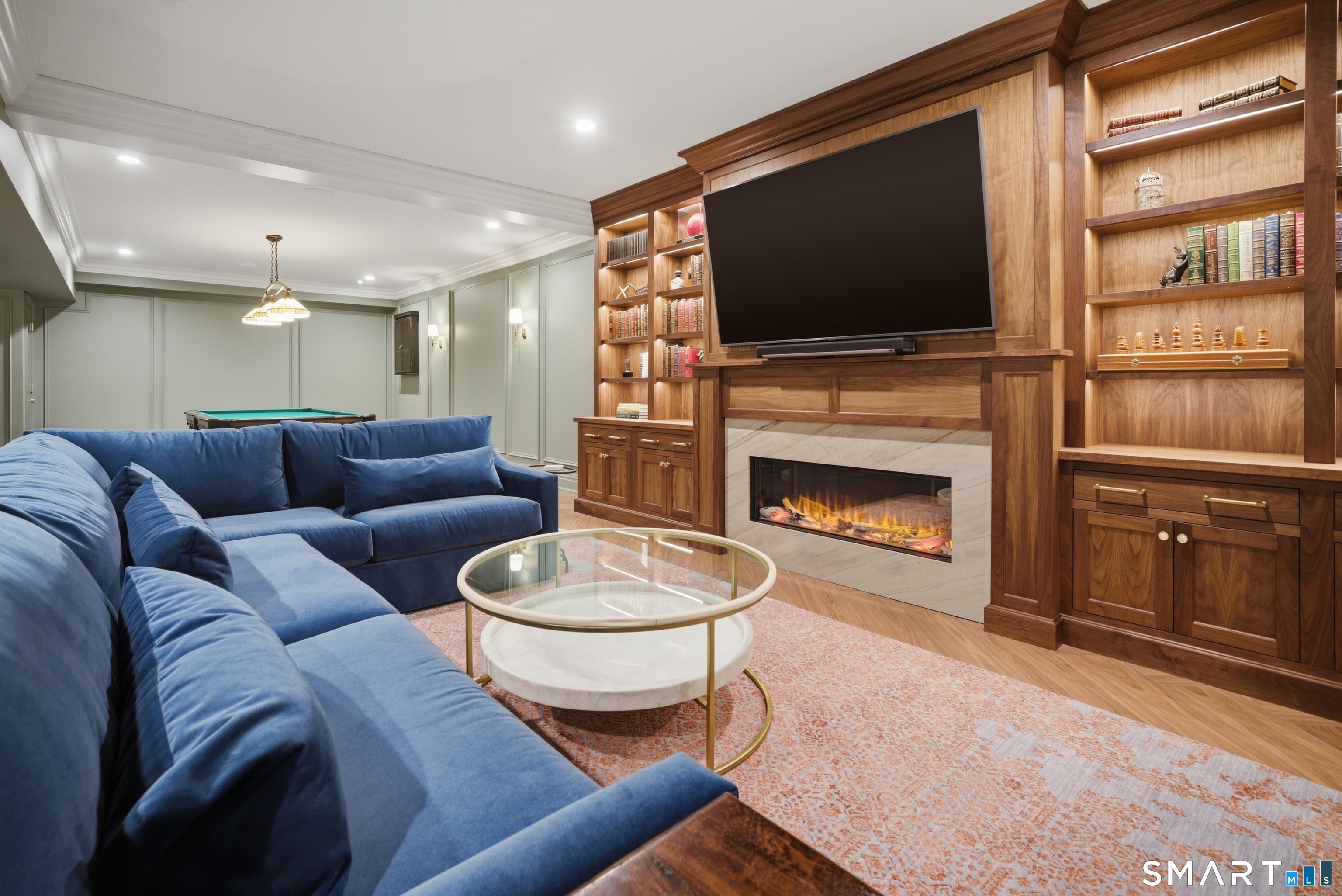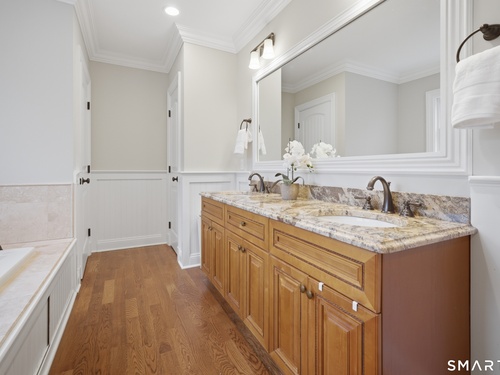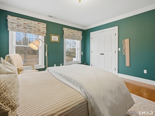 Rare newer construction in one of Fairfield's most desirable walk-to-town neighborhoods. Built in 2012, this exceptional 4 bedroom, 4.5 bath Colonial offers a thoughtfully designed open layout, beautiful millwork, & a spectacular, newly completed luxury lower level designed for recreation & entertaining. The main level features hardwood floors throughout & comfortable, well-proportioned living spaces. The kitchen with eat-in dining area flows naturally into the family room w/ custom built-ins & a gas fireplace, creating an inviting setting for daily living & entertaining. A formal living room, dining room & private home office w/ coffered ceilings provide flexible space for work or relaxation. A powder room & direct access to the two-car garage complete the first floor. Upstairs, the primary suite includes a gas fireplace, en-suite bath, expansive walk in closet & an adjoining bonus room that may serve as a nursery, home office, or potential 5th bedroom. Three additional bedrooms include one en suite, while the other two share a hall bath. A second-floor laundry room adds convenience to everyday living. The exceptional newly finished lower level by Domus Construction is designed as a true lifestyle retreat. Features include a spacious great room w/ a custom walnut entertainment wall, a wet bar w/ marble countertops & custom cabinetry, a dedicated golf simulator room, a gym w/ sauna, & a full bath.