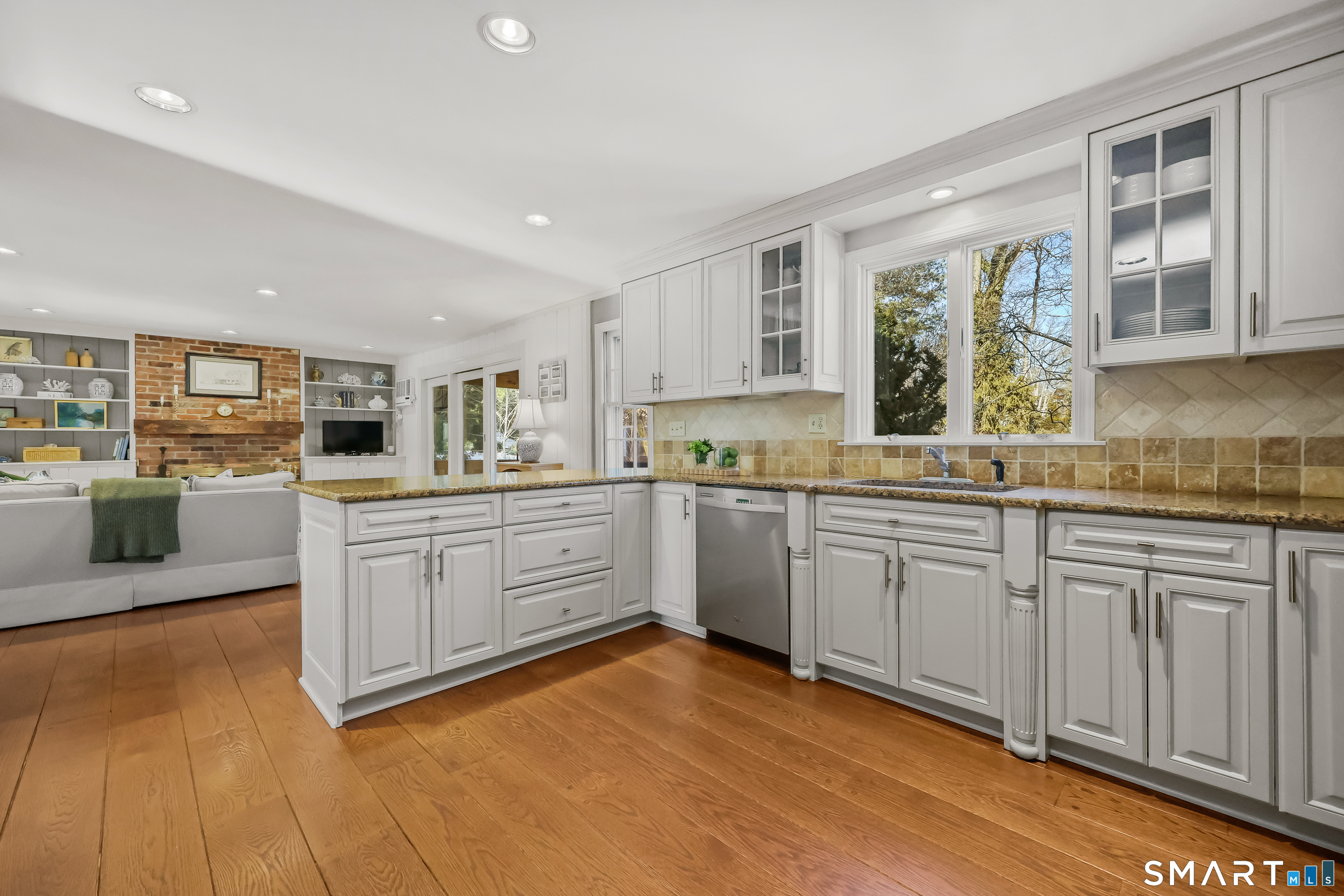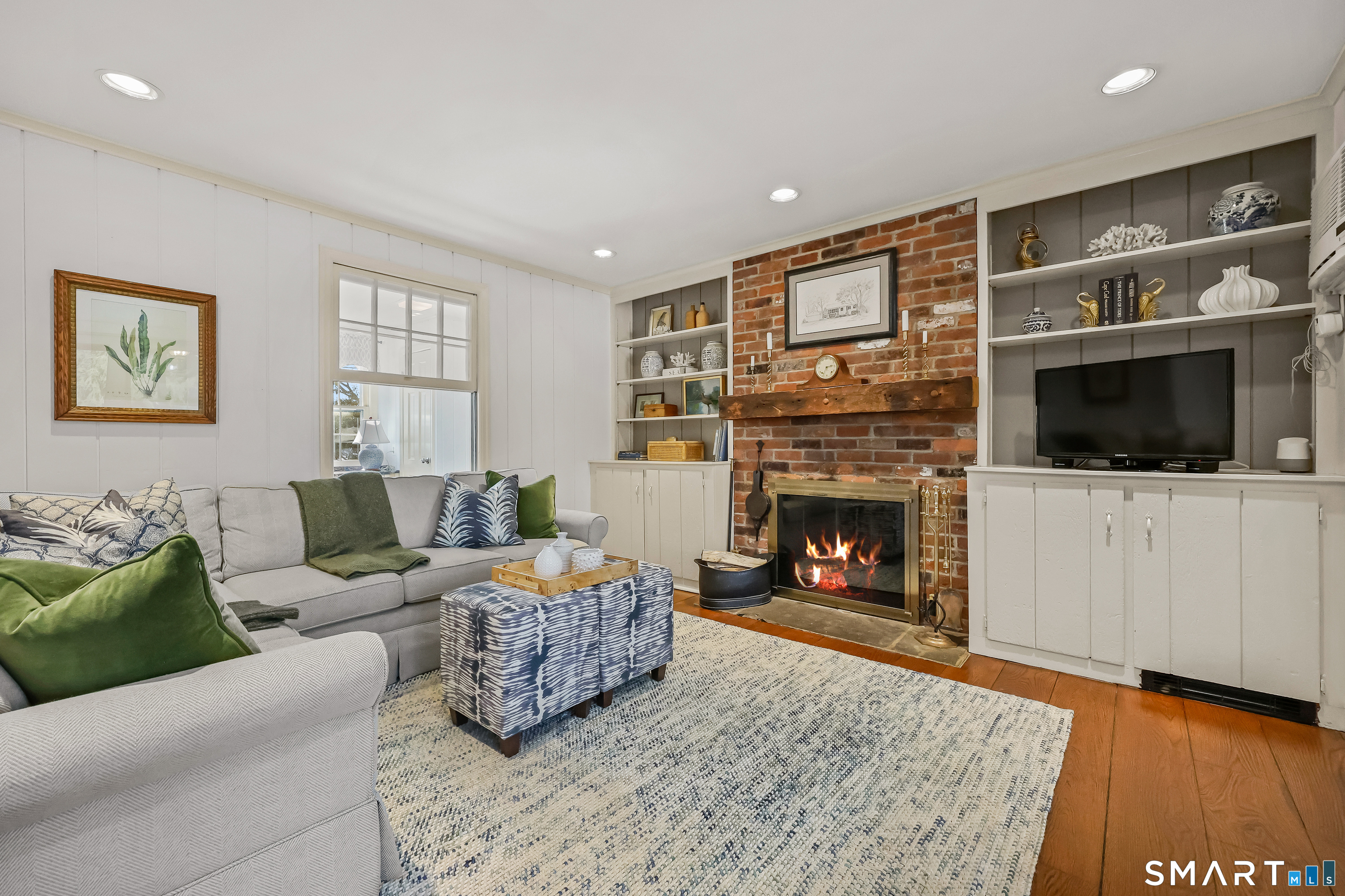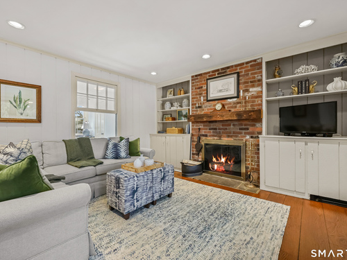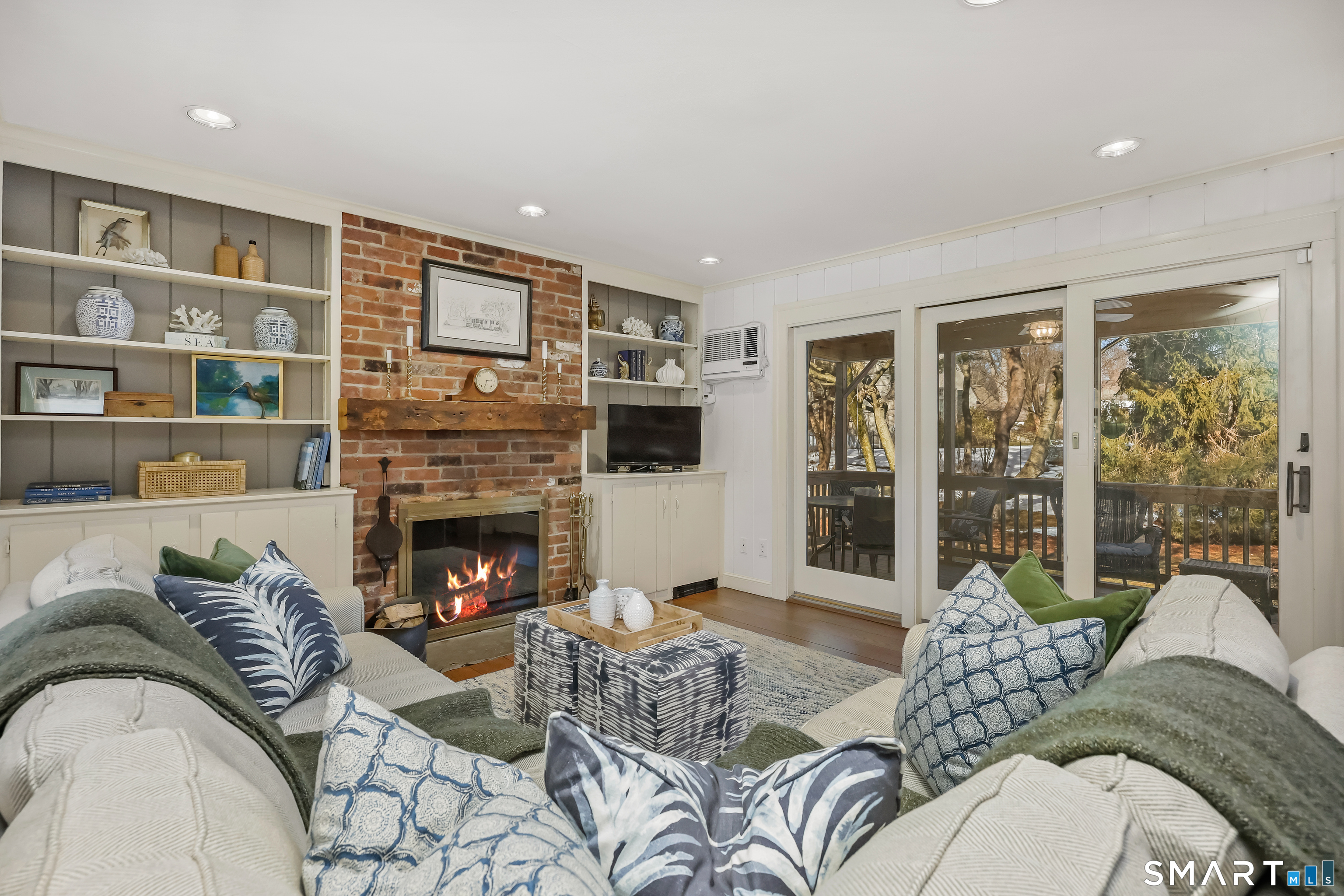 Built-Ins, Fireplace, Sliders, Hardwood Floor