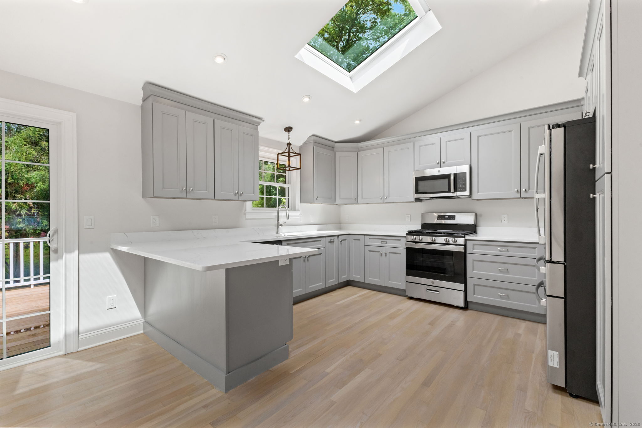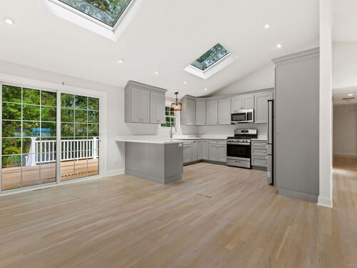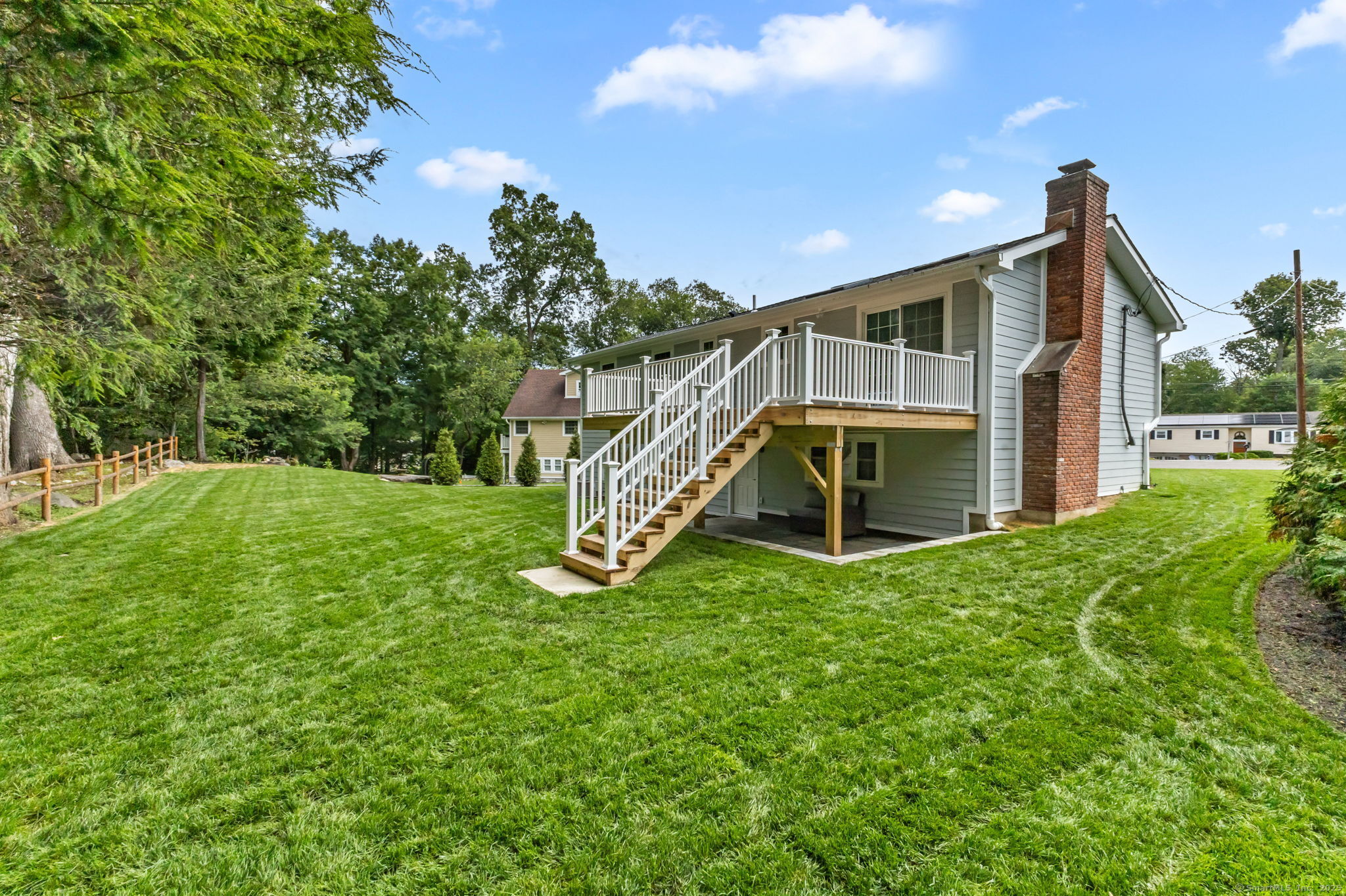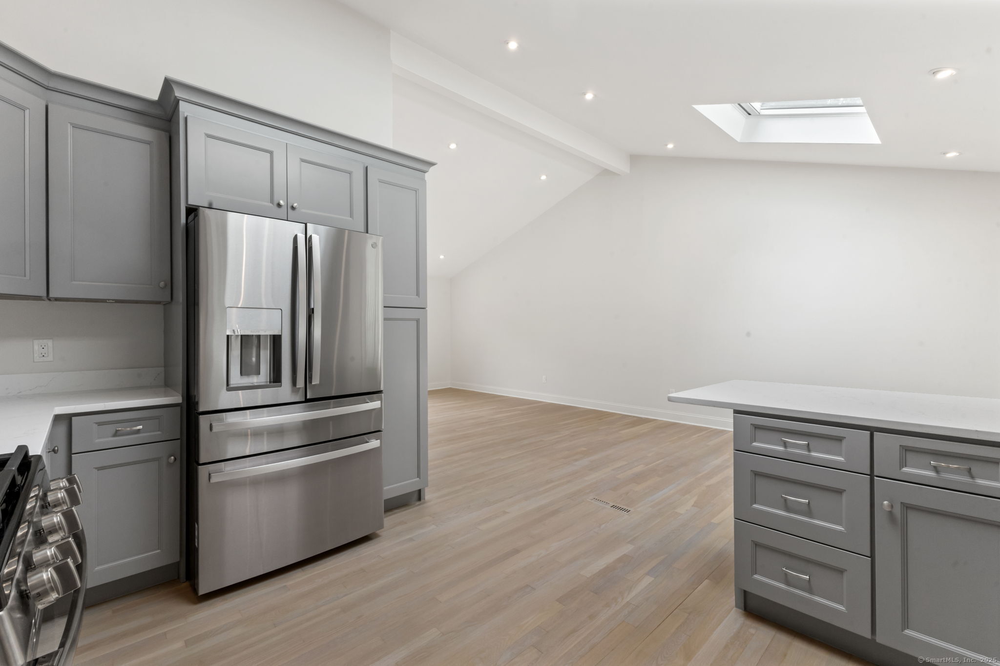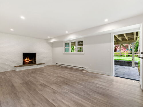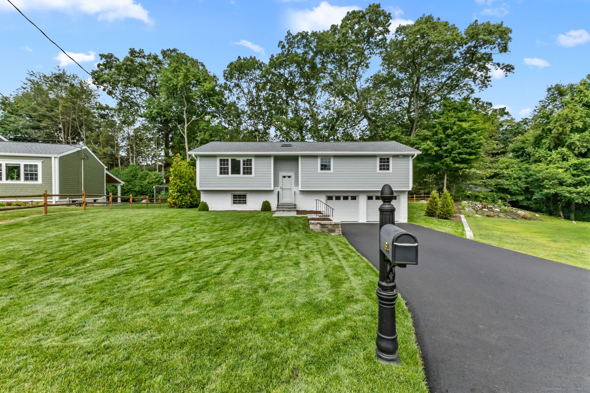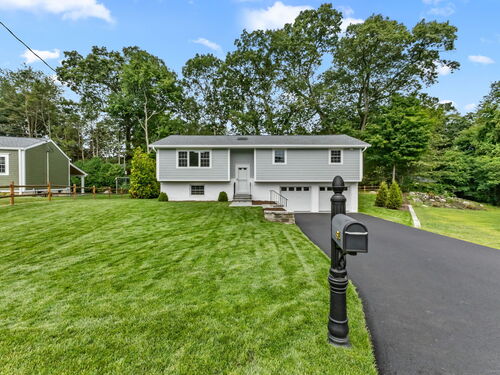 Beautifully renovated in 2025, this raised ranch is set on a quiet cul-de-sac in Stamford's desirable Mid Ridges neighborhood. The main level includes an open and bright living room and dining room, with hardwood floors throughout. Sliders in the dining room allow for easy access to a spacious deck perfect for outdoor living and grilling. The kitchen features sleek stainless steel appliances and quartz countertops with a breakfast bar. The primary bedroom, with dual closets, two bedrooms, and a full bath complete the main level. The lower level features a family room with fireplace as well as an additional bedroom and full bath. Laundry room on lower level. Walk-out to the two car garage and patio. The level yard offers ample room for gardening and recreation. Minutes from the Merritt Parkway and downtown Stamford.