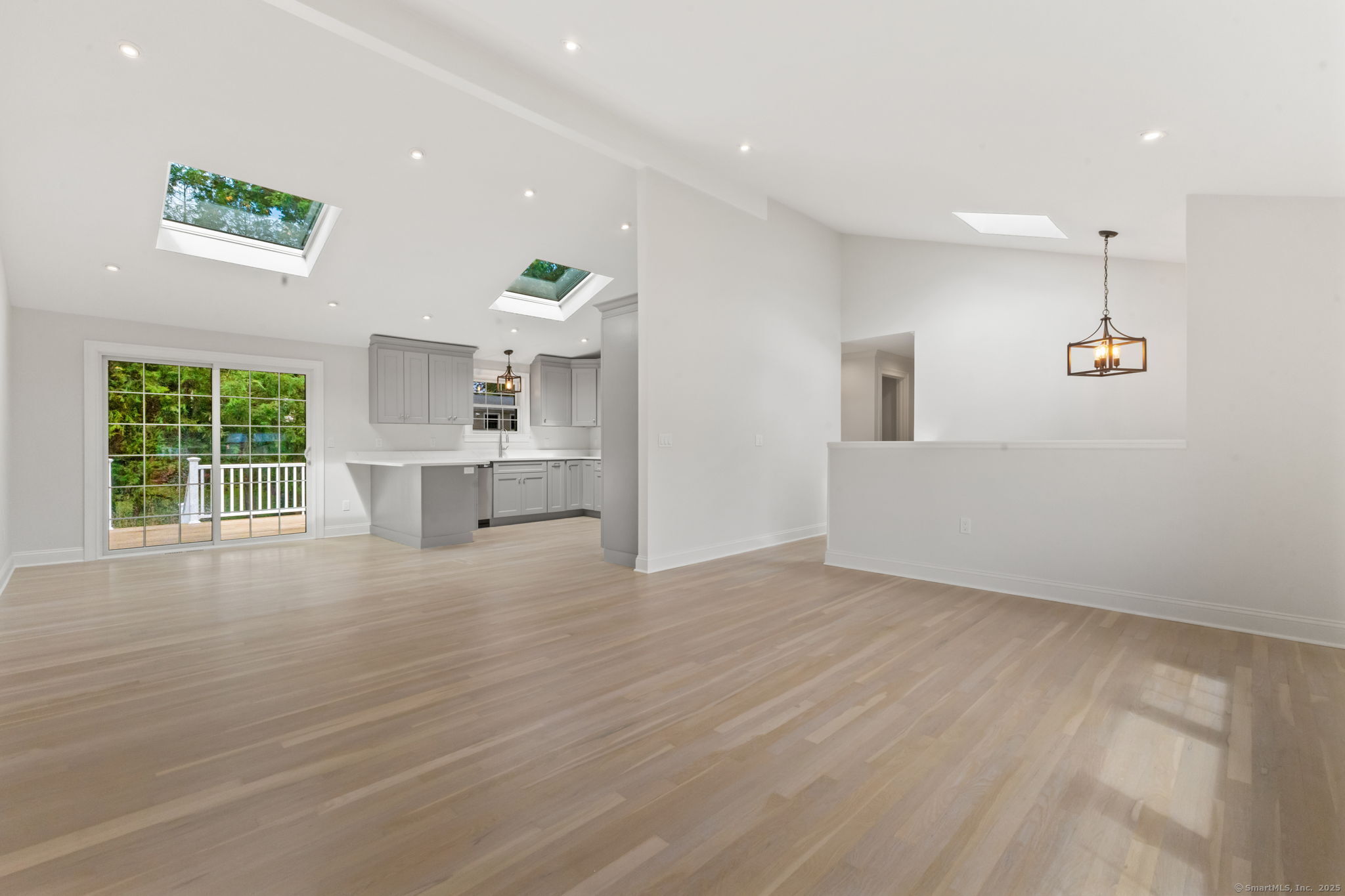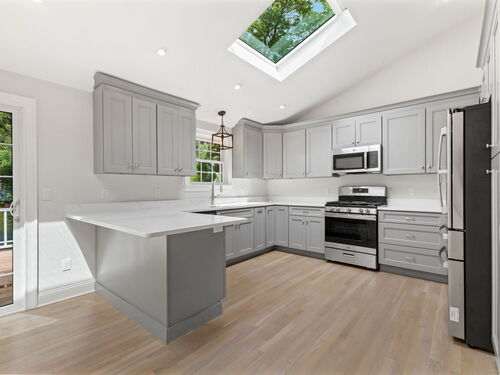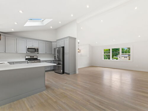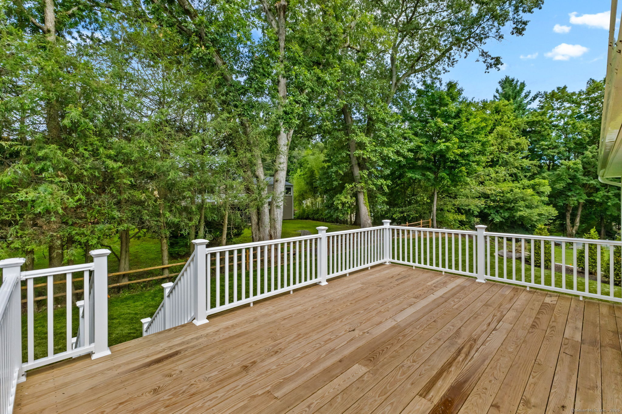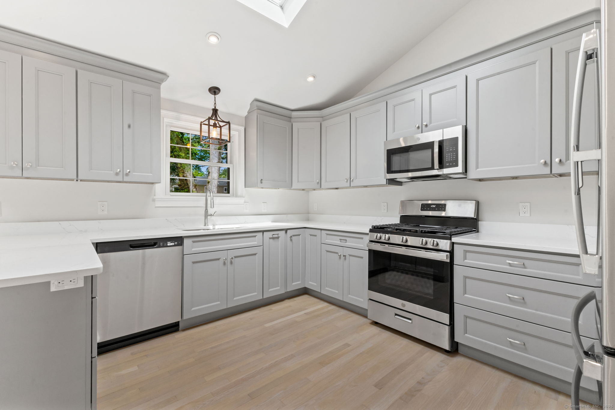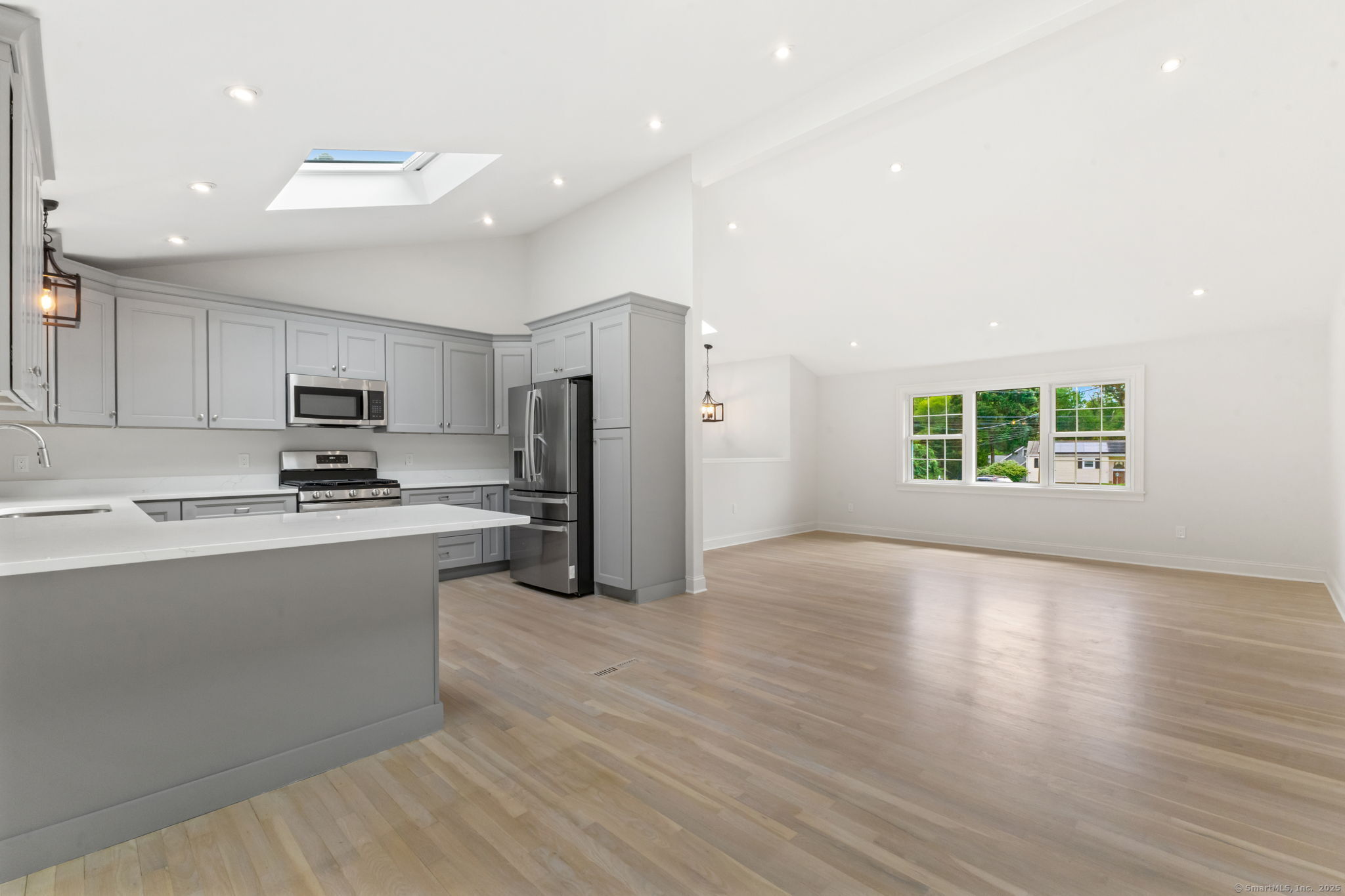Beautifully renovated in 2025, this raised ranch is set on a quiet cul-de-sac in Stamford's desirable Mid Ridges neighborhood. The main level includes an open and bright living room and dining room, with hardwood floors throughout. Sliders in the dining room allow for easy access to a spacious deck perfect for outdoor living and grilling. The kitchen features sleek stainless steel appliances and quartz countertops with a breakfast bar. The primary bedroom, with dual closets, two bedrooms, and a full bath complete the main level. The lower level features a family room with fireplace as well as an additional bedroom and full bath. Laundry room on lower level. Walk-out to the two car garage and patio. The level yard offers ample room for gardening and recreation. Minutes from the Merritt Parkway and downtown Stamford.