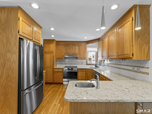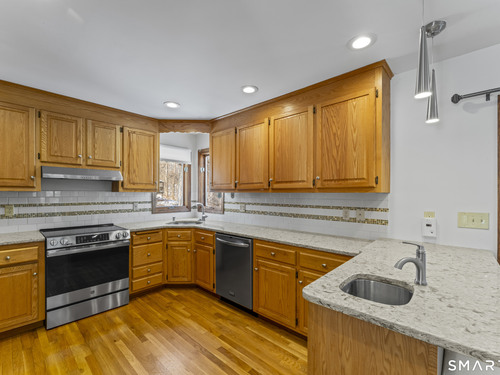 Meticulously maintained & thoughtfully designed, this 4-bedroom, 2.5-bath Colonial is nestled in a tranquil Trumbull neighborhood just minutes from Trumbull Mall, major highways, parks, places of worship, etc. From the moment you arrive, the home's exceptional curb appeal & inviting entry set the tone. Gleaming hardwood floors extend throughout the main level, creating warmth and continuity. The updated kitchen features stainless steel appliances & flows seamlessly into a spacious dining area & expansive family room-perfect for both everyday living & effortless entertaining. Newer Pella sliding glass door showcase peaceful views of the lightly wooded backyard, where a charming hand-built bridge spans a gentle brook and a private deck offers the ideal setting for outdoor relaxation. Upstairs, you'll find four well-proportioned bedrooms, including a primary suite with a walk-in closet & walk-in shower with a skylight that fills the space with natural sunlight throughout the day. The updated hall bath boasts a new vanity and stylish finishes and is conveniently located near the laundry area. Additional highlights include a large lower level with direct walk-out access to the backyard. A two-car garage offers secure parking and abundant storage along with an EV charging station. Lovingly cared for and move-in ready, this home blends comfort, craftsmanship, and a peaceful setting-ready to welcome its next owners.