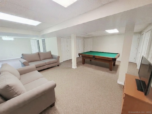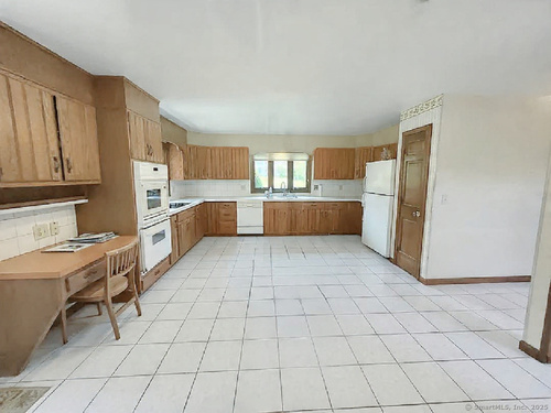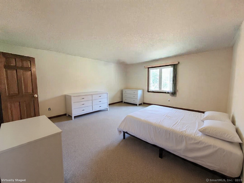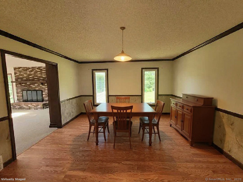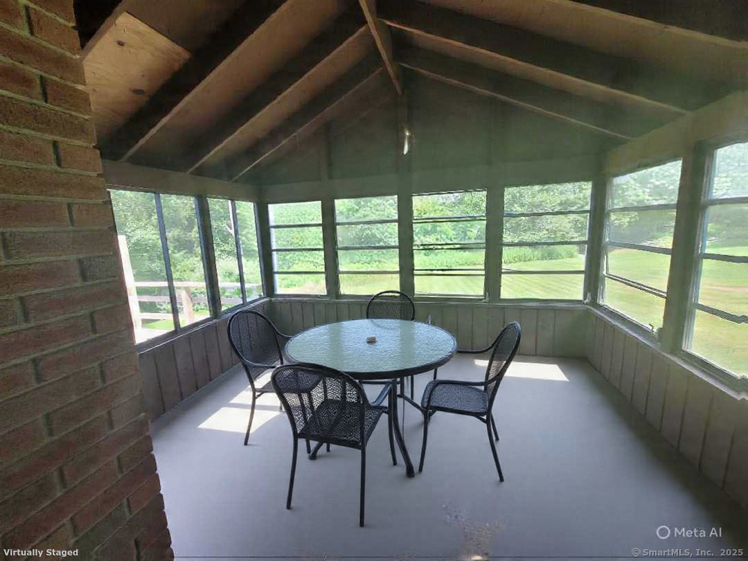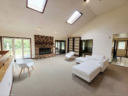 Welcome to 7 Carriage Lane, New Fairfield, Connecticut - tucked away on a quiet, picture-perfect cul-de-sac, this charming home is set back from the road & surrounded by other beautifully maintained properties, offering both privacy & tranquility. Step into the inviting two-story Foyer & immediately feel at home. The sun-filled living room features soaring Vaulted Ceilings, 2 Skylights & a cozy wood-burning Fireplace, creating the perfect space for relaxing or entertaining. From here, enjoy seamless access to the sunroom & 1 of 2 decks; ideal for outdoor gatherings or quiet moments. A huge Kitchen has an abundance of cabinet & counter space as well as a pantry & convenient writing desk. Easily access the 2nd Deck or Dining Room from here. The Formal Dining Room brings a touch of elegance with newly installed hardwood laminate flooring, detailed trim & 2 vertical windows offering serene views of the back lawn. A light-filled Sunroom showcases a cathedral ceiling & walls of windows with picturesque views, perfect for relaxation or enjoying your morning coffee. Generously sized Primary Bedroom features a walk-in closet with built-in shelves & an attached, private Full Bath. Bath offers a double sink, shower stall, built-in shelving, heat lamp & new toilet. Take in serene backyard views from the new vinyl windows. The 2nd Bedroom includes a walk-in closet with built-in shelving & ceiling fan. 3rd Bedroom features a large double closet & recessed overhead lights.