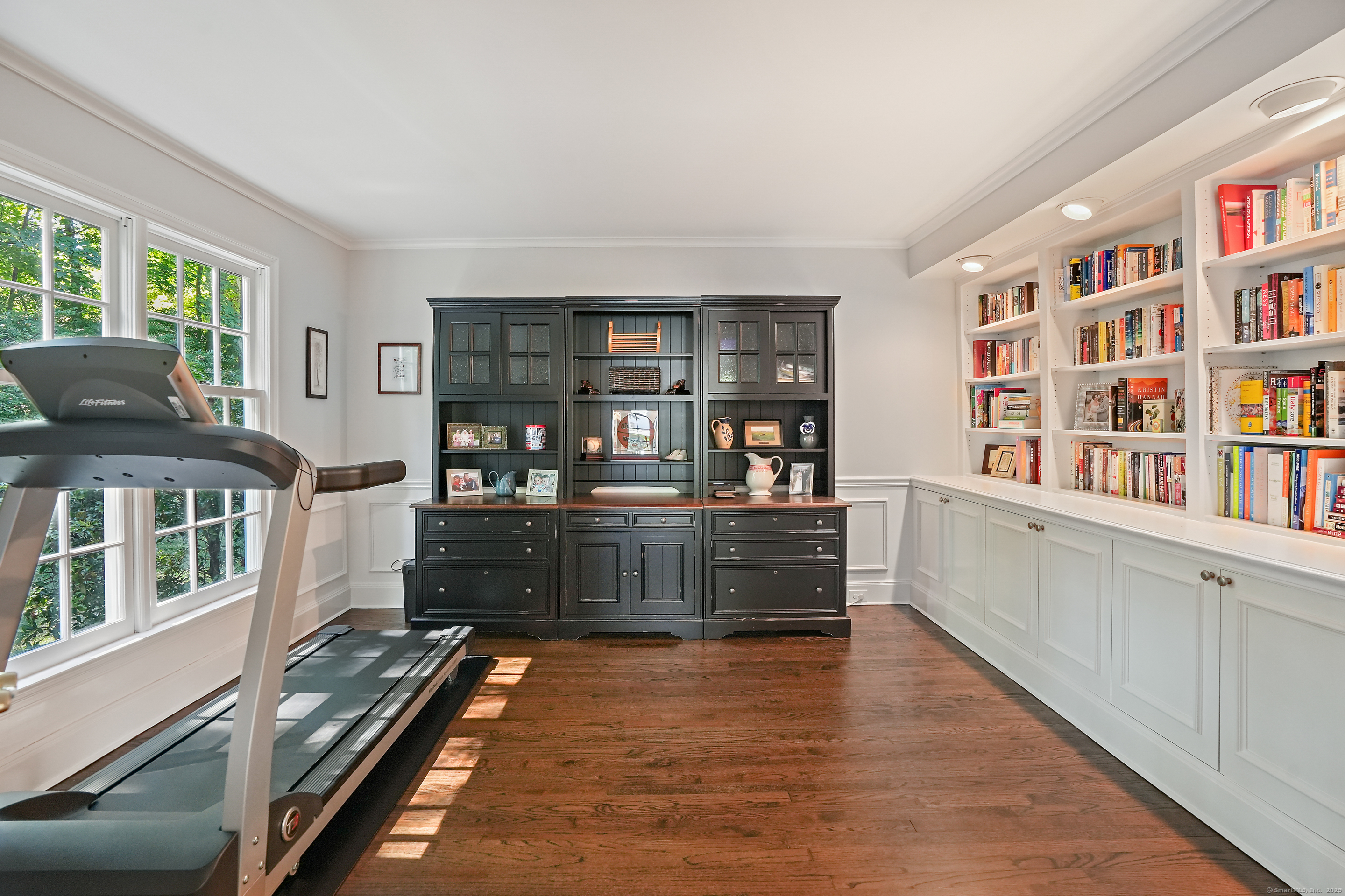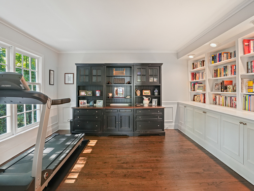 Book Shelves, Built-Ins, French Doors, Hardwood Floor