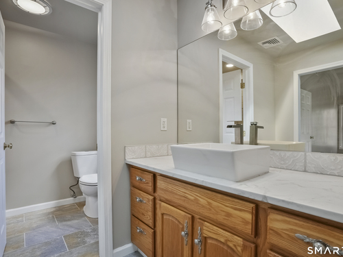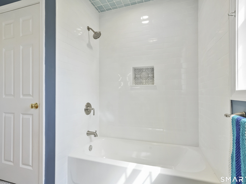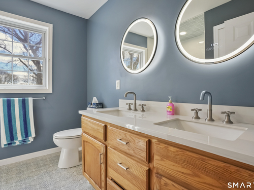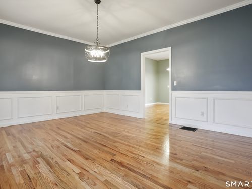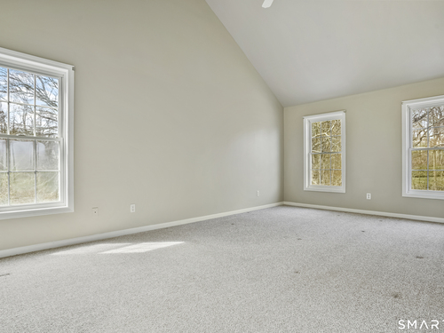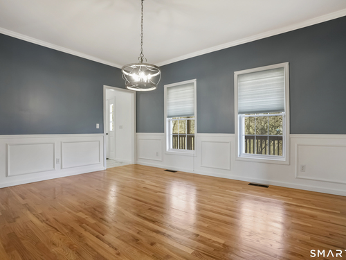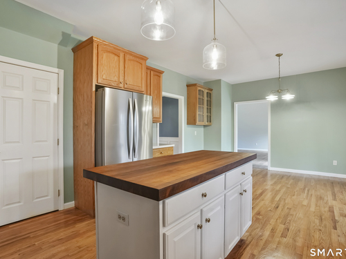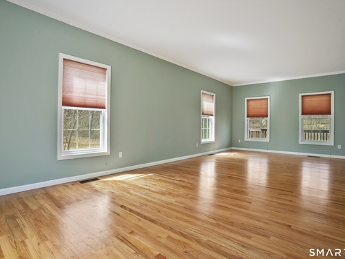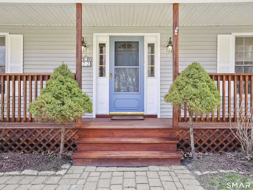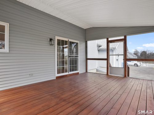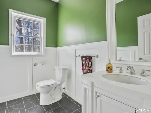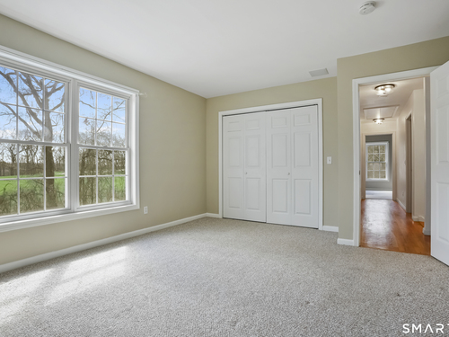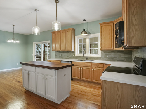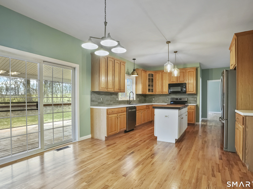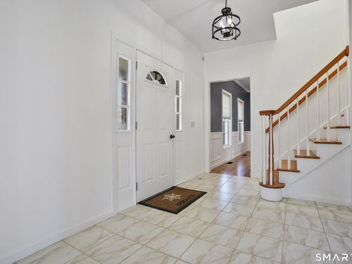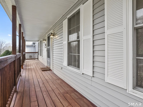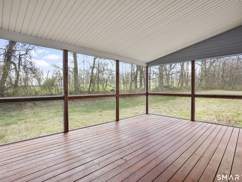Discover timeless elegance and modern comfort in this beautifully refinished Colonial set on 2 private acres with breathtaking golf course views. The Welcoming foyer with custom tilework and spacious closet sets the tone. The expansive family room features vaulted ceilings, a wood-burning fireplace, and newly refinished floors. The updated eat-in kitchen combines style and function with new countertops, a designer tile backsplash, mahogany butcher block, and brand-new appliances, including a dishwasher, sink, and stove. A main-level washer and dryer hook up add everyday ease. Sliding doors open to a large screened-in porch, ideal for outdoor dining and enjoying peaceful surroundings. The formal dining room showcases hardwood floors and custom wainscoting, while the formal living room offers additional versatile space. A remodeled first-floor bath features tiled flooring, wainscoting, and a distinctive custom vanity. Upstairs, four generously sized bedrooms provide ample closet space and wall-to-wall carpeting. The hall bath includes a new cast iron tub, cultured marble counters, and dual sinks with illuminated mirrors. The primary suite offers vaulted ceilings, a walk-in closet, and a newly tiled walk-in shower. Brand-new roof, refurbished furnace with thermal upgrades, C/A, central vac, dual oil tanks, a new water treatment system, and city sewers. A three-car garage and expansive driveway ensure ample parking.