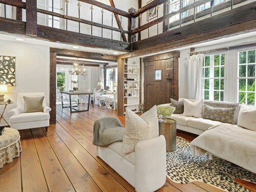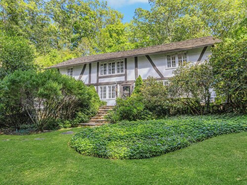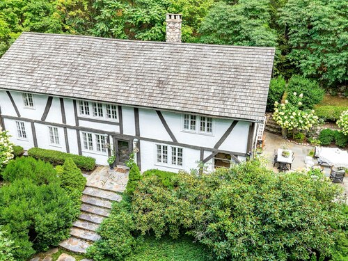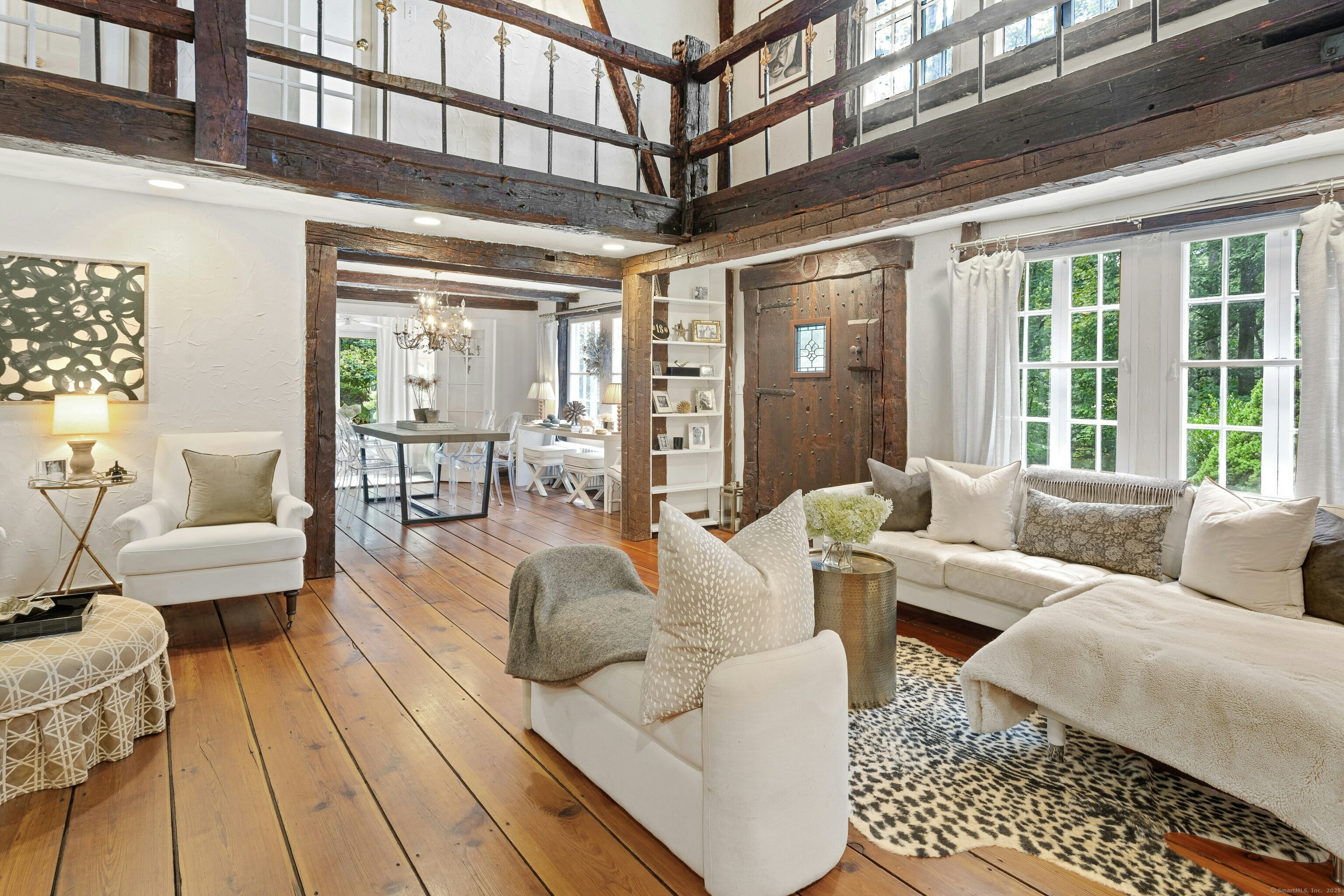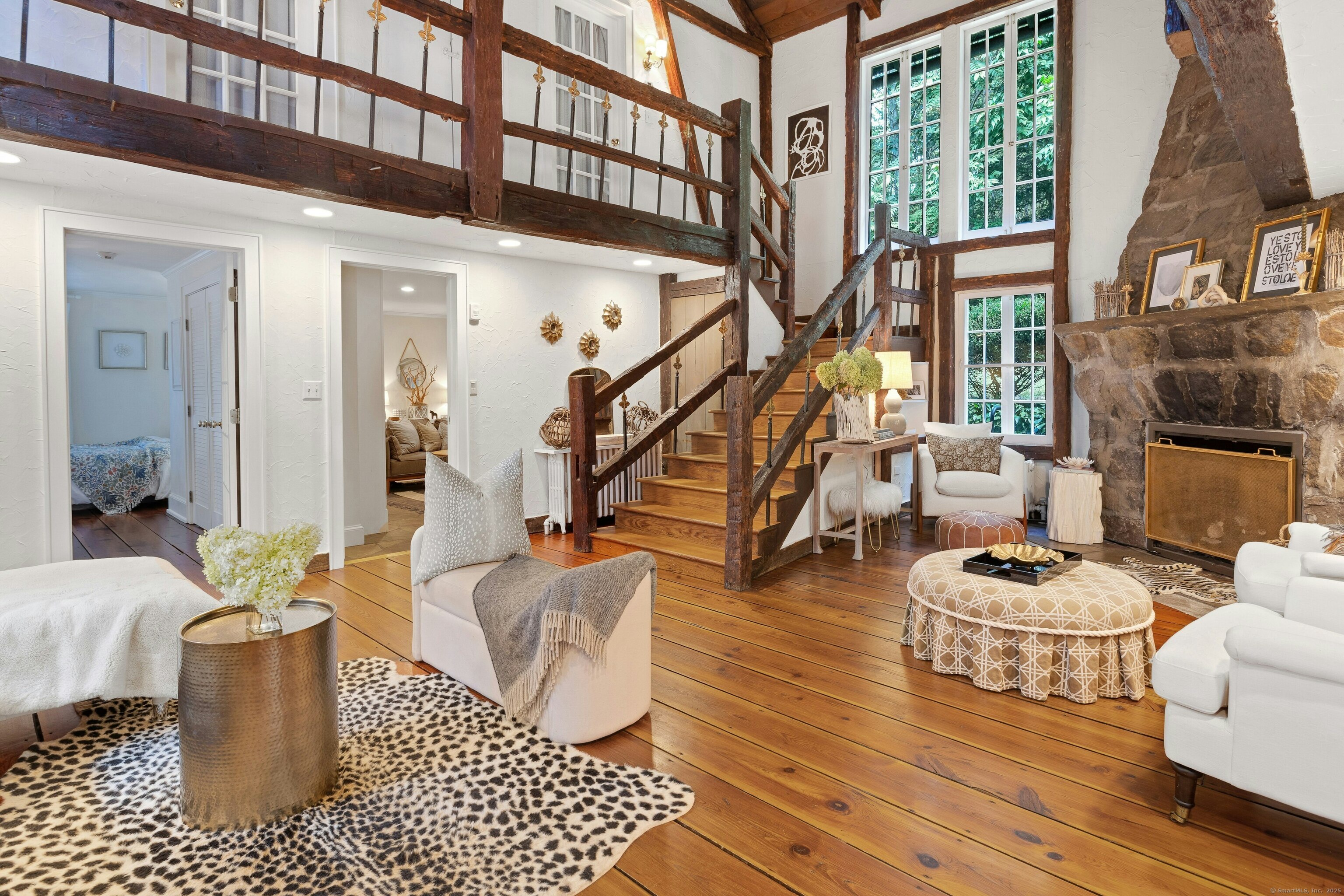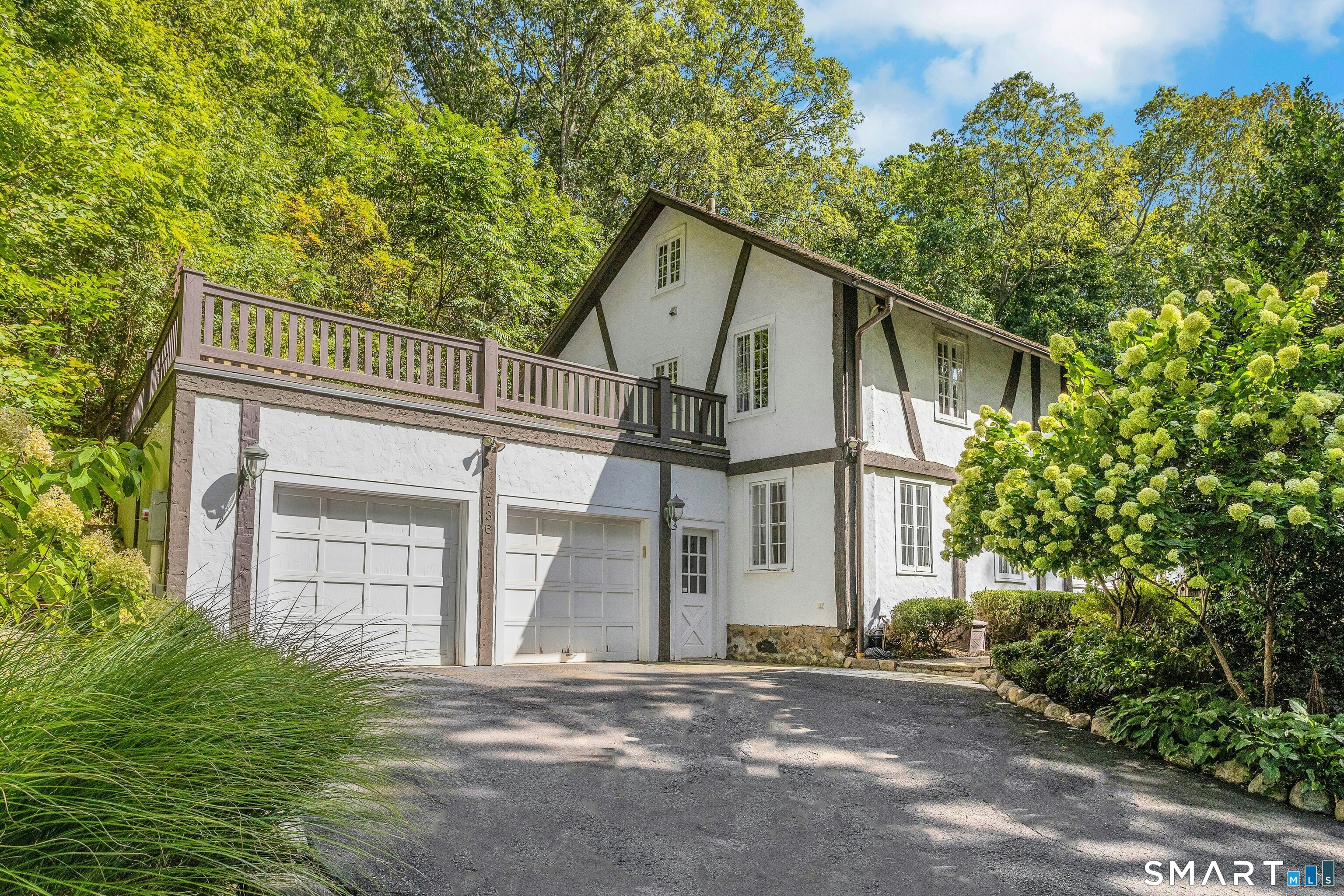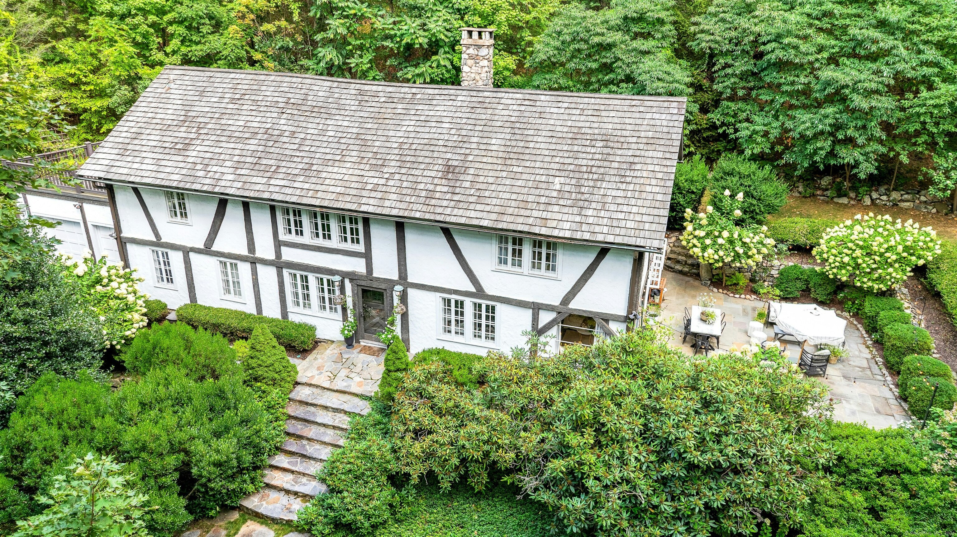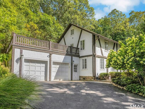 Darien Beach rights and New Canaan Schools make this a very special offering! Storybook charm greets you at this one-of-a-kind, vintage Tudor home, set back from the road on landscaped property with lovely private terrace and lawns. Natural gas and town water and sewer are a definite plus for easy maintenance. A parcel of acreage is in Darien, offering the unique option of full access to beaches and boat launch. Timbered beam construction is authentic to the original structure and creates a fairytale ambiance throughout. Thoughtful updates provide the comforts of today's living without sacrificing the essence of a Tudor style including wide plank hardwood floors and original hardware. The great room with vaulted ceiling, stone hearth and wraparound balcony is the captivating focal point w/open access to family and dining rooms and the delightful porch off the terrace. An office and four en-suite bedrooms, including one on the main floor and one with walk out access to a large deck over the garage allows for versatile options. Manicured lawns and gardens surround the bluestone terrace for gracious entertaining and cul de sac access from the side lawn is perfect for bike riding or pet walking. Minutes to New Canaan schools and village, Talmadge Hill train and Pkwy, as well as a short drive to the beaches in Darien. A truly wonderful location to call home!