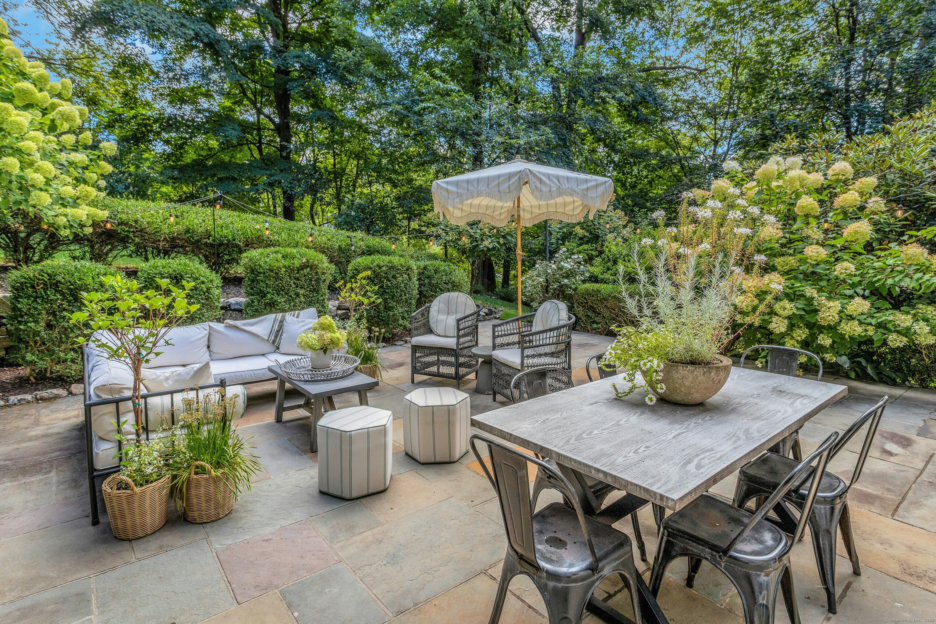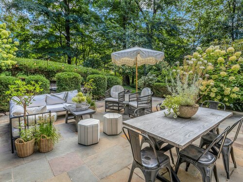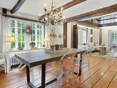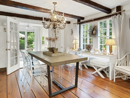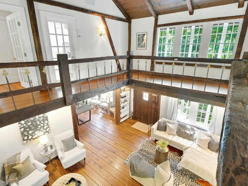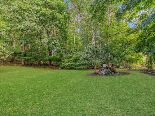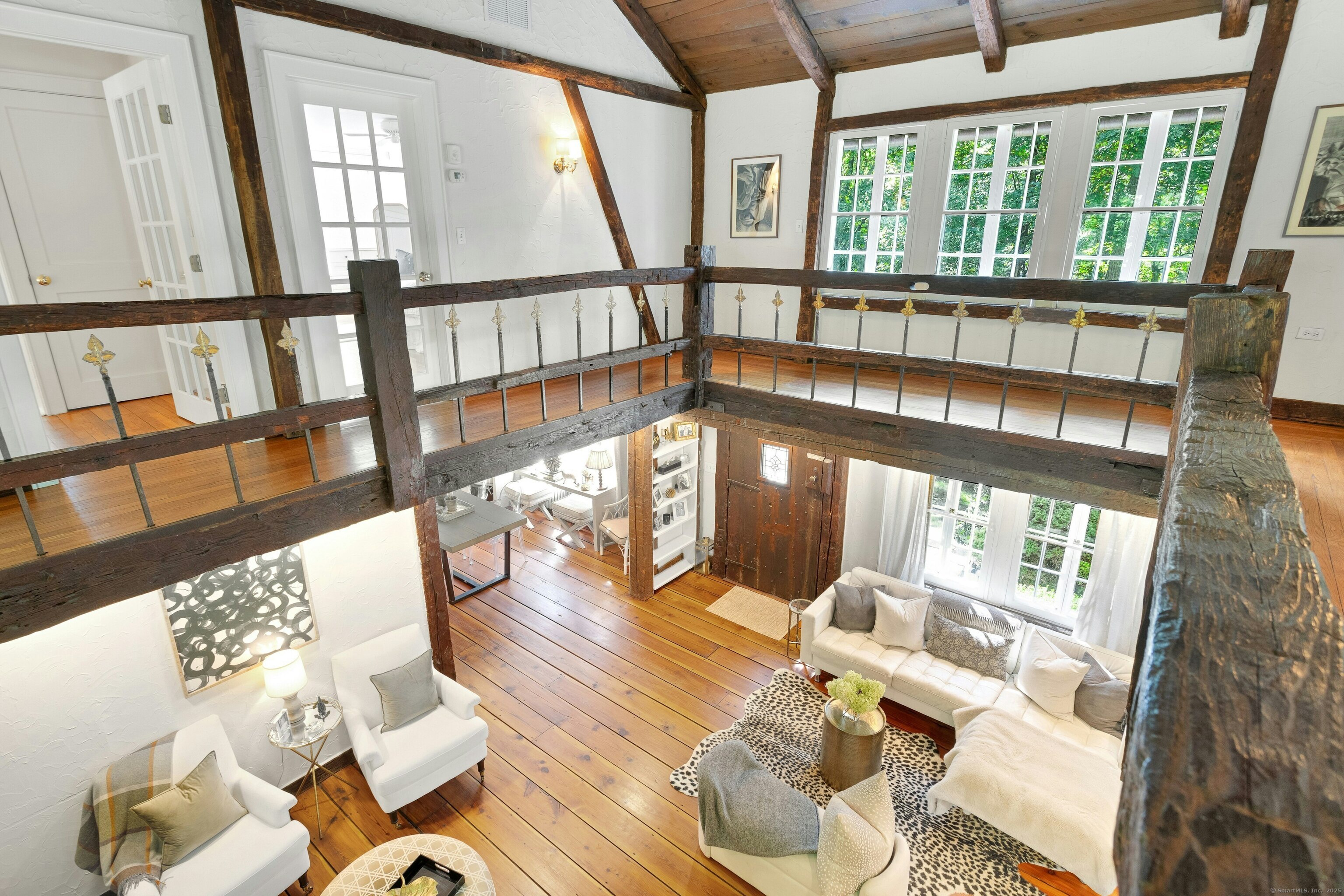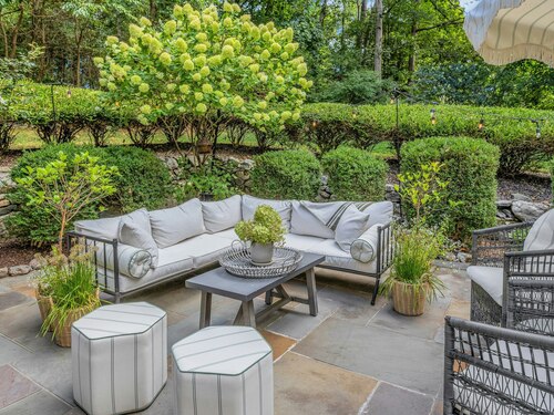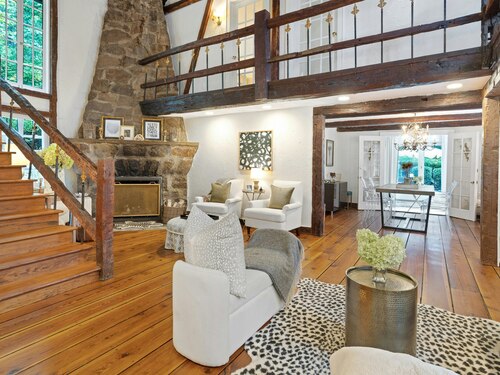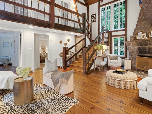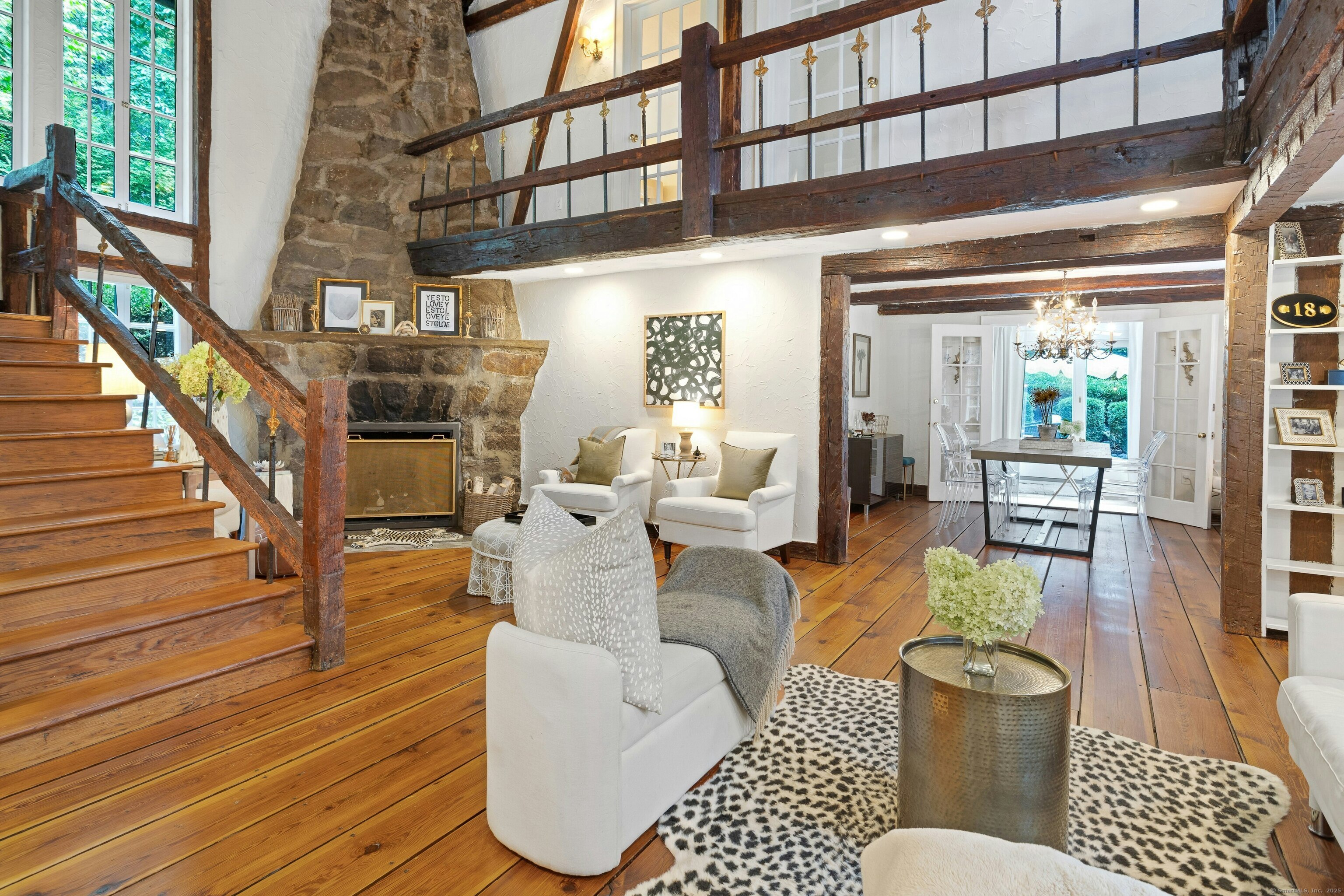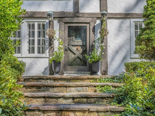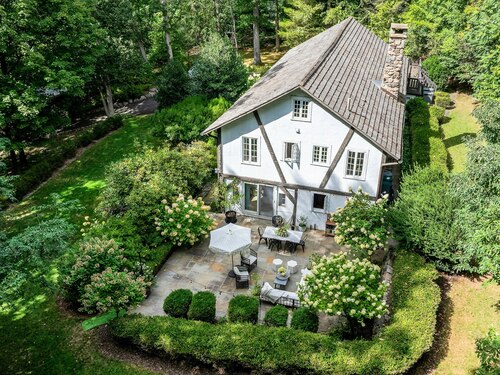 Darien Beach rights and New Canaan Schools make this a very special offering! Storybook charm greets you at this one-of-a-kind, vintage Tudor home, set back from the road on landscaped property with lovely private terrace and lawns. Natural gas and town water and sewer are a definite plus for easy maintenance. A parcel of acreage is in Darien, offering the unique option of full access to beaches and boat launch. Timbered beam construction is authentic to the original structure and creates a fairytale ambiance throughout. Thoughtful updates provide the comforts of today's living without sacrificing the essence of a Tudor style including wide plank hardwood floors and original hardware. The great room with vaulted ceiling, stone hearth and wraparound balcony is the captivating focal point w/open access to family and dining rooms and the delightful porch off the terrace. An office and four en-suite bedrooms, including one on the main floor and one with walk out access to a large deck over the garage allows for versatile options. Manicured lawns and gardens surround the bluestone terrace for gracious entertaining and cul de sac access from the side lawn is perfect for bike riding or pet walking. Minutes to New Canaan schools and village, Talmadge Hill train and Pkwy, as well as a short drive to the beaches in Darien. A truly wonderful location to call home!