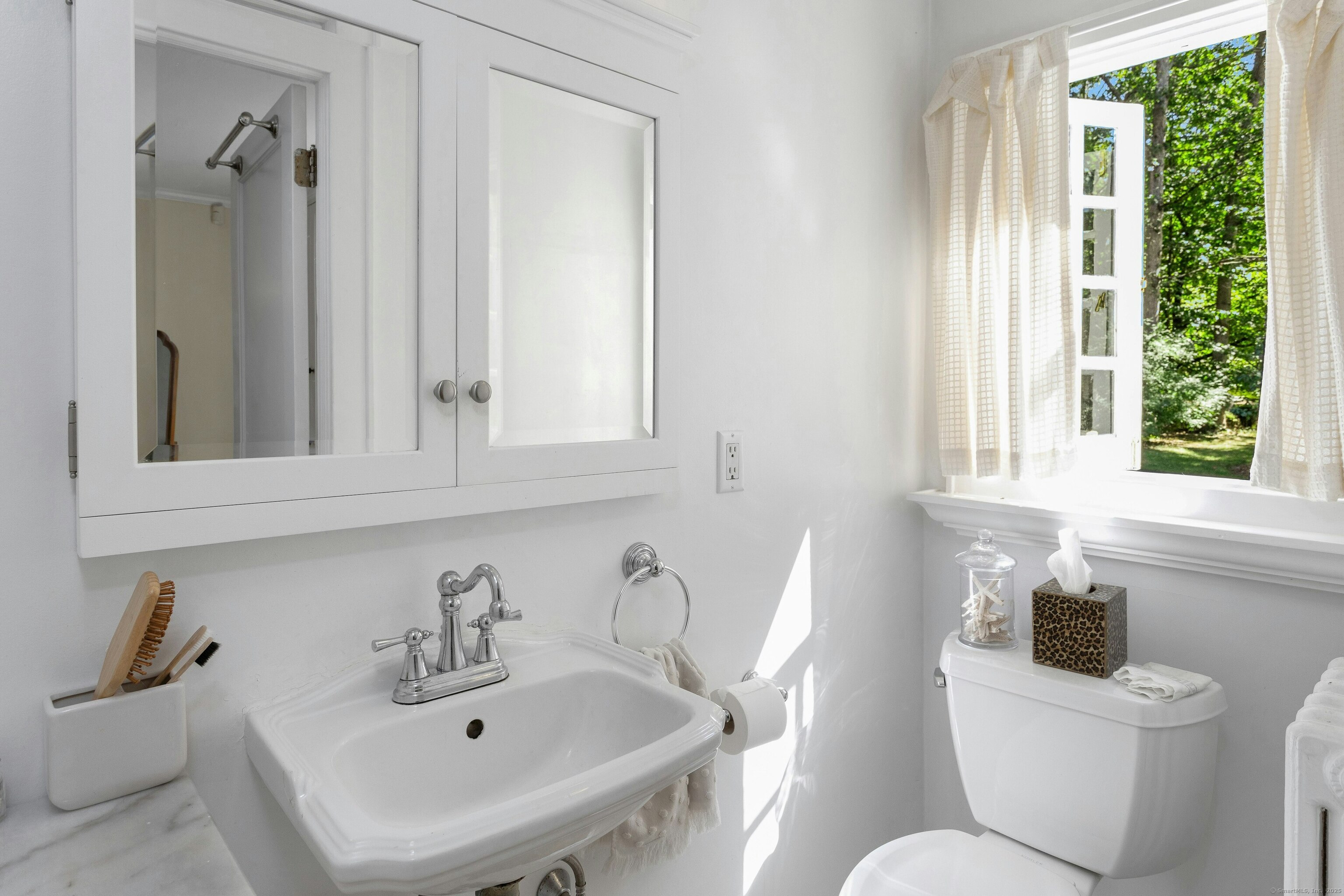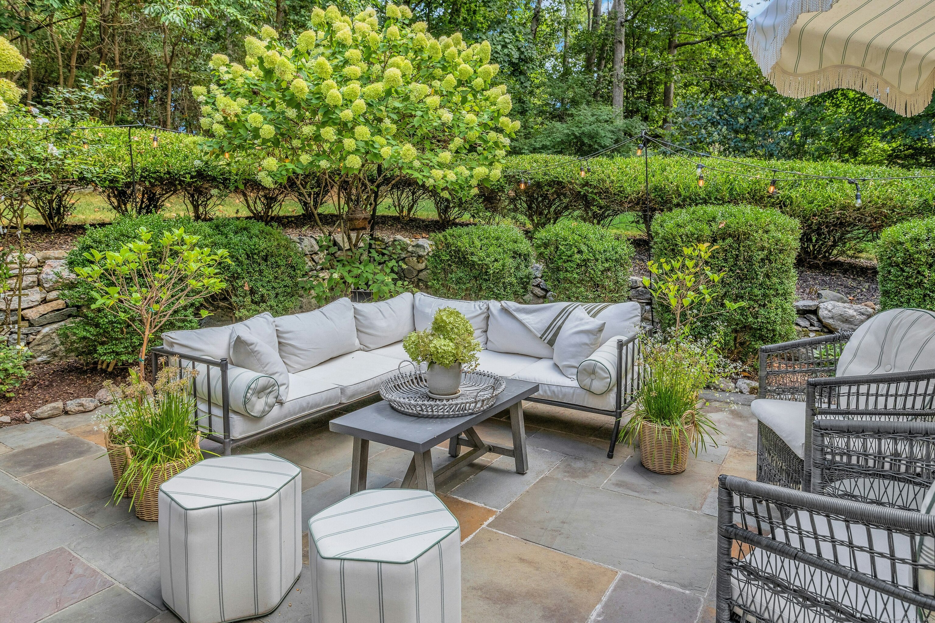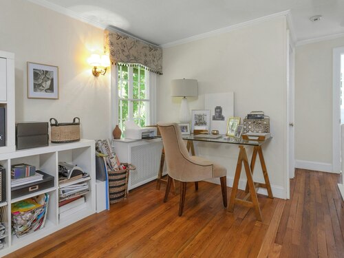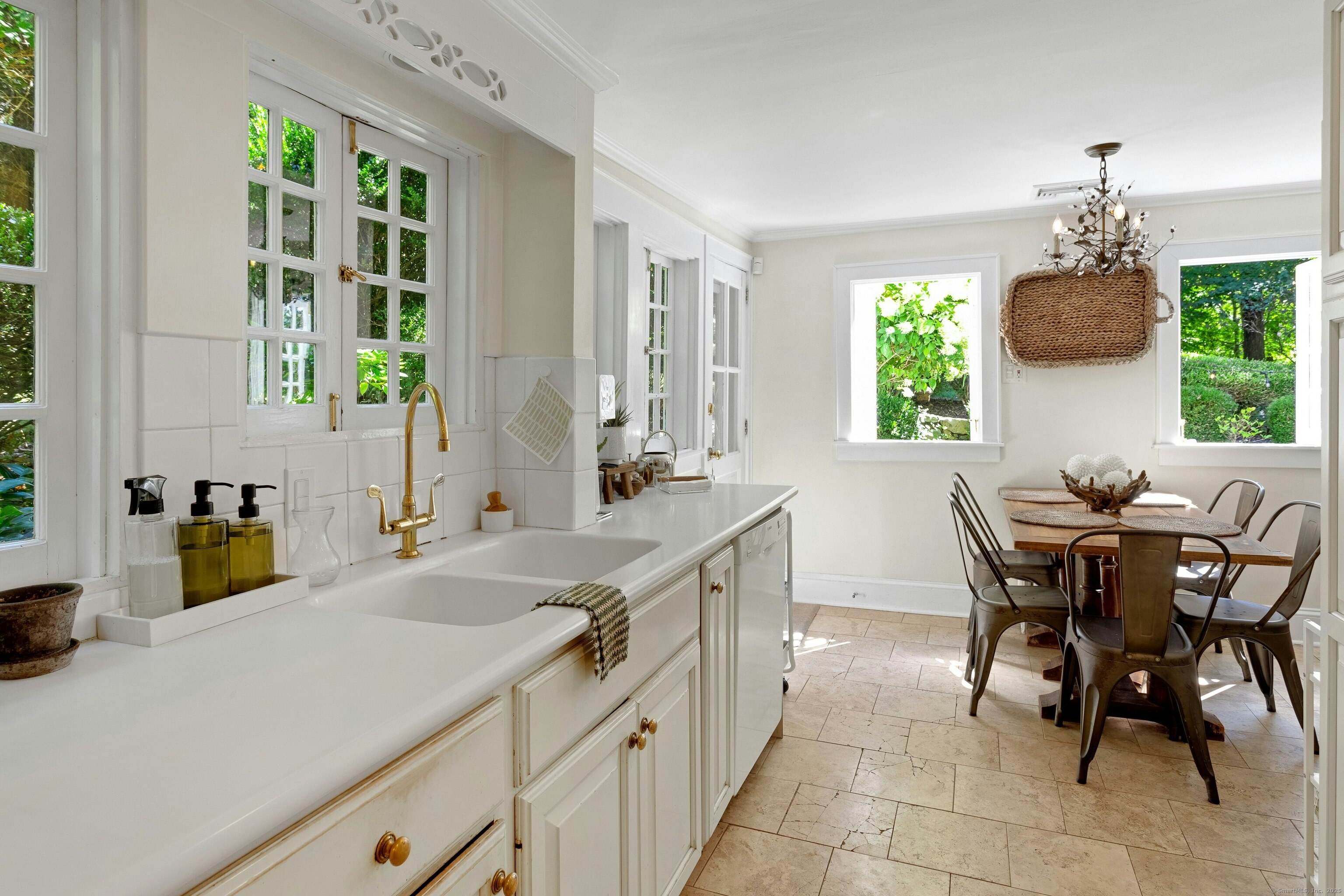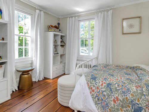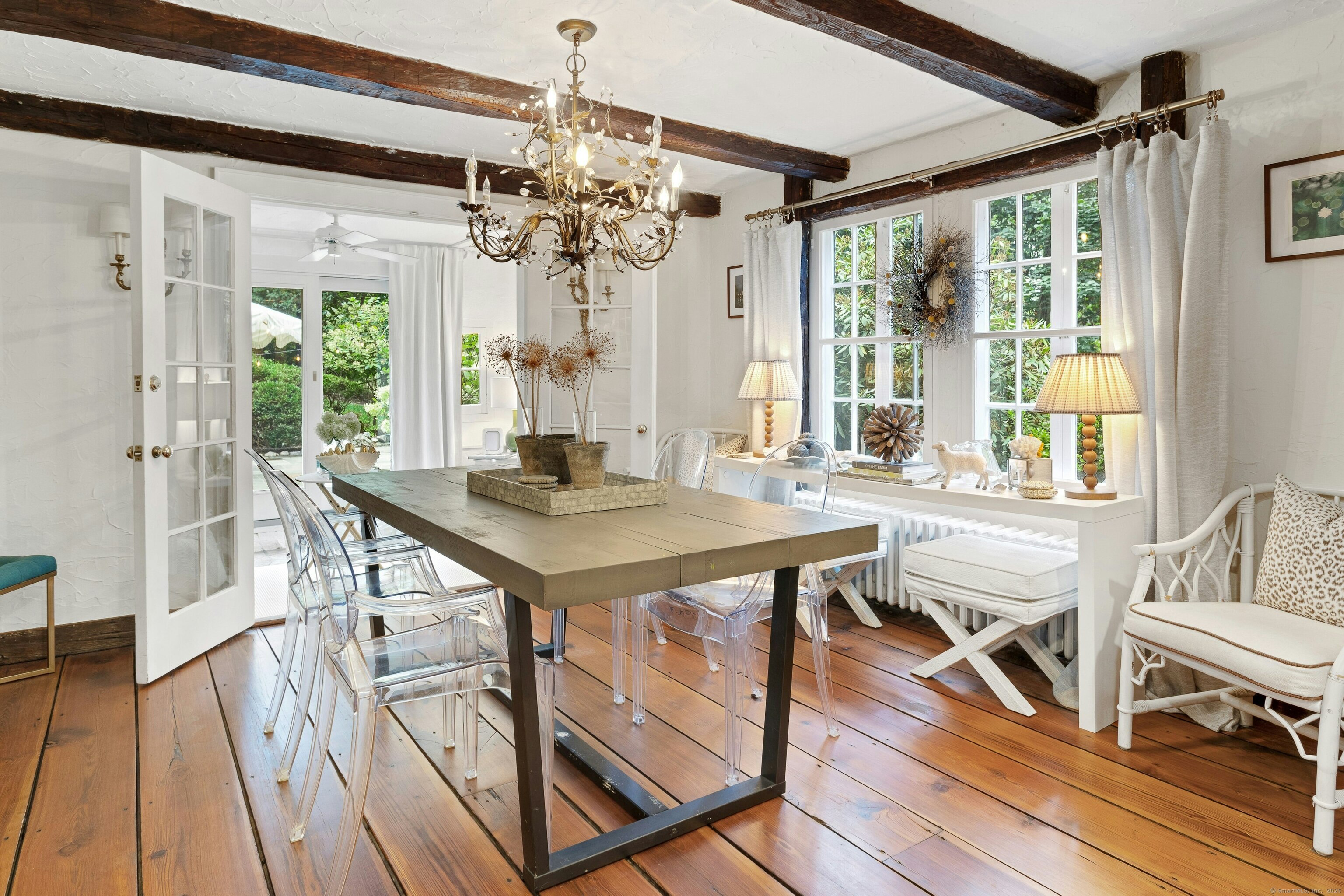 Darien Beach rights and New Canaan Schools make this a very special offering! Storybook charm greets you at this one-of-a-kind, vintage Tudor home, set back from the road on landscaped property with lovely private terrace and lawns. Natural gas and town water and sewer are a definite plus for easy maintenance. A parcel of acreage is in Darien, offering the unique option of full access to beaches and boat launch. Timbered beam construction is authentic to the original structure and creates a fairytale ambiance throughout. Thoughtful updates provide the comforts of today's living without sacrificing the essence of a Tudor style including wide plank hardwood floors and original hardware. The great room with vaulted ceiling, stone hearth and wraparound balcony is the captivating focal point w/open access to family and dining rooms and the delightful porch off the terrace. An office and four en-suite bedrooms, including one on the main floor and one with walk out access to a large deck over the garage allows for versatile options. Manicured lawns and gardens surround the bluestone terrace for gracious entertaining and cul de sac access from the side lawn is perfect for bike riding or pet walking. Minutes to New Canaan schools and village, Talmadge Hill train and Pkwy, as well as a short drive to the beaches in Darien. A truly wonderful location to call home!