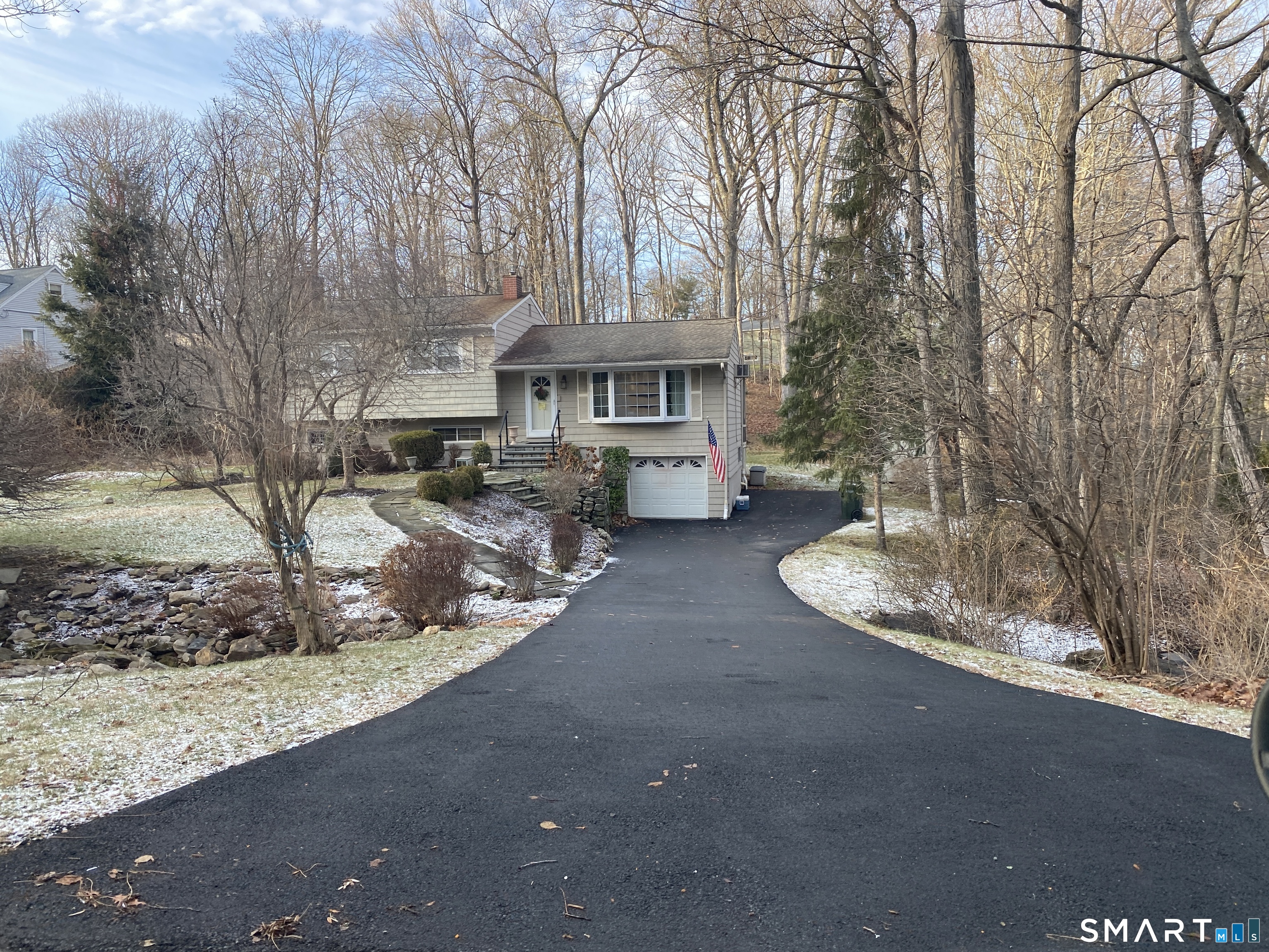 Inviting split level home, nestled in the middle of 1.11 acres of beautiful land, surrounded by a brook and mature trees for privacy. As you enter a sunny living room flowing smoothly into the dining room and kitchen, you will notice custom decorative hand painted walls. Entering from the dining room through the sliding door a 3 season covered deck is ready for outdoor dining and relaxing surrounded by nature! Back inside, going up to the upper floor you will find 3 bedrooms and a beautifully hand painted full bathroom. Walking downstairs from the kitchen is a spacious family room with a gas fireplace on left and office area with door to outside on right side, as well as laundry room with half bath. From Family room you can walk down to utility room/ workshop with garage access, convenient especially in the winter months. Surrounded by beautiful lakes and hiking trails, this scenic property is located just minutes from downtown Ridgefield, Ridgefield library, the Aldrich museum, Ridgefield playhouse, and the Danbury shopping mall and airport! Award winning Ridgefield schools are only minutes away. Elementary school only 1/2 mile and Middle and High schools 1.2-1.3 miles respectively. Welcome home!