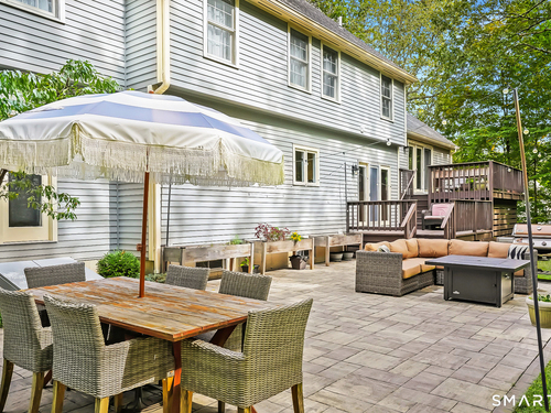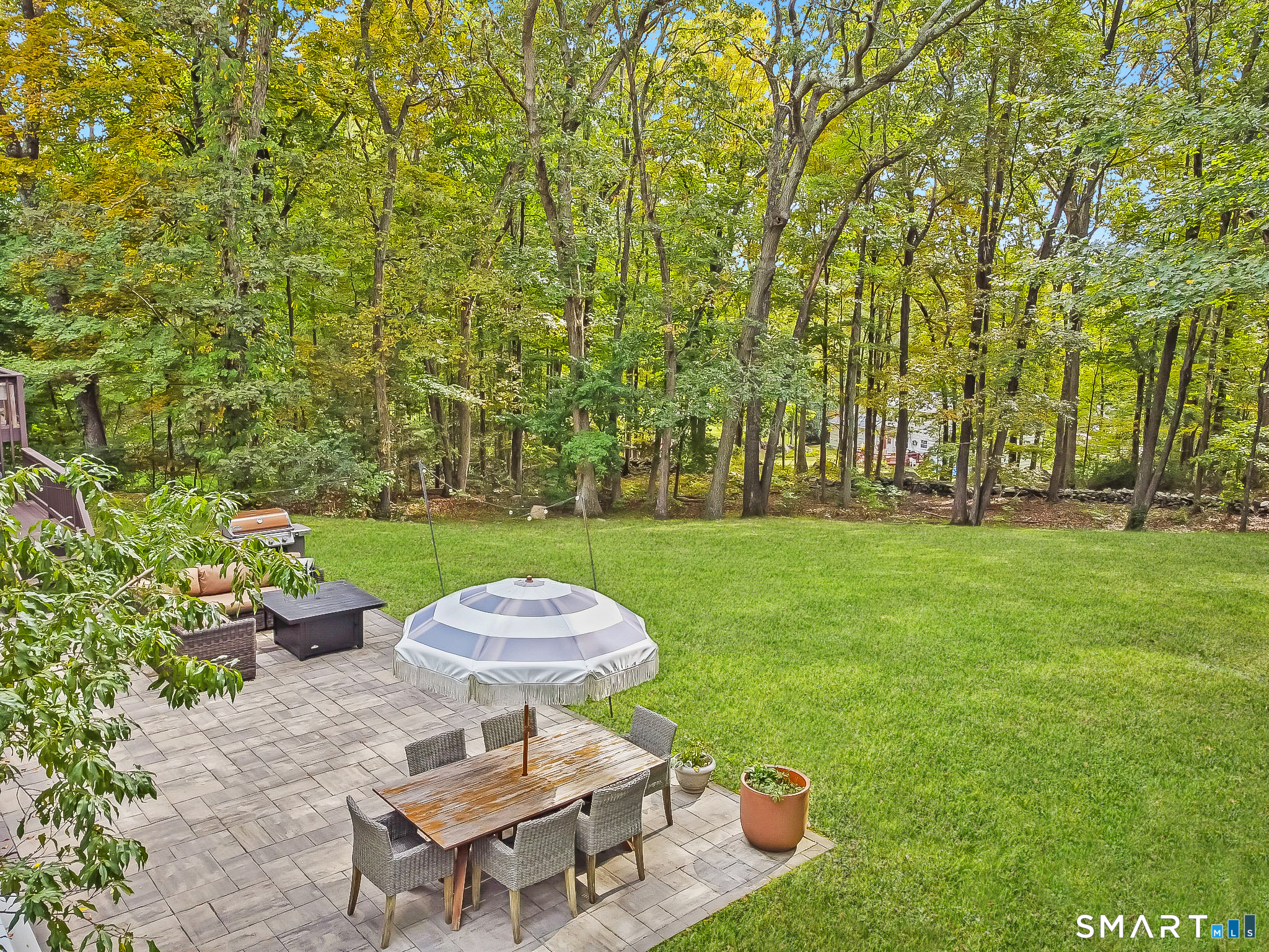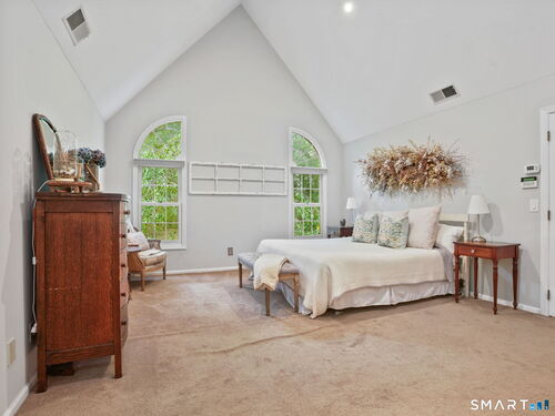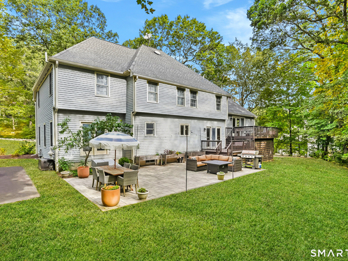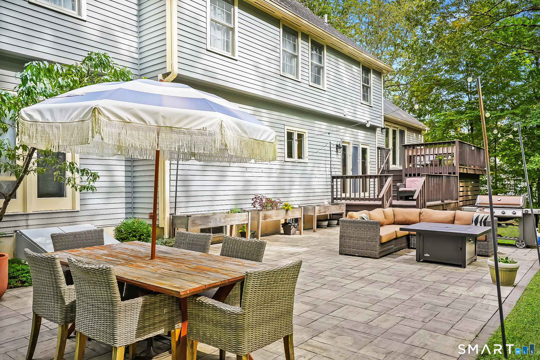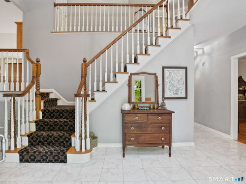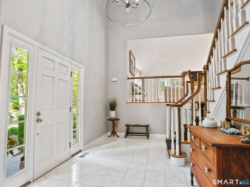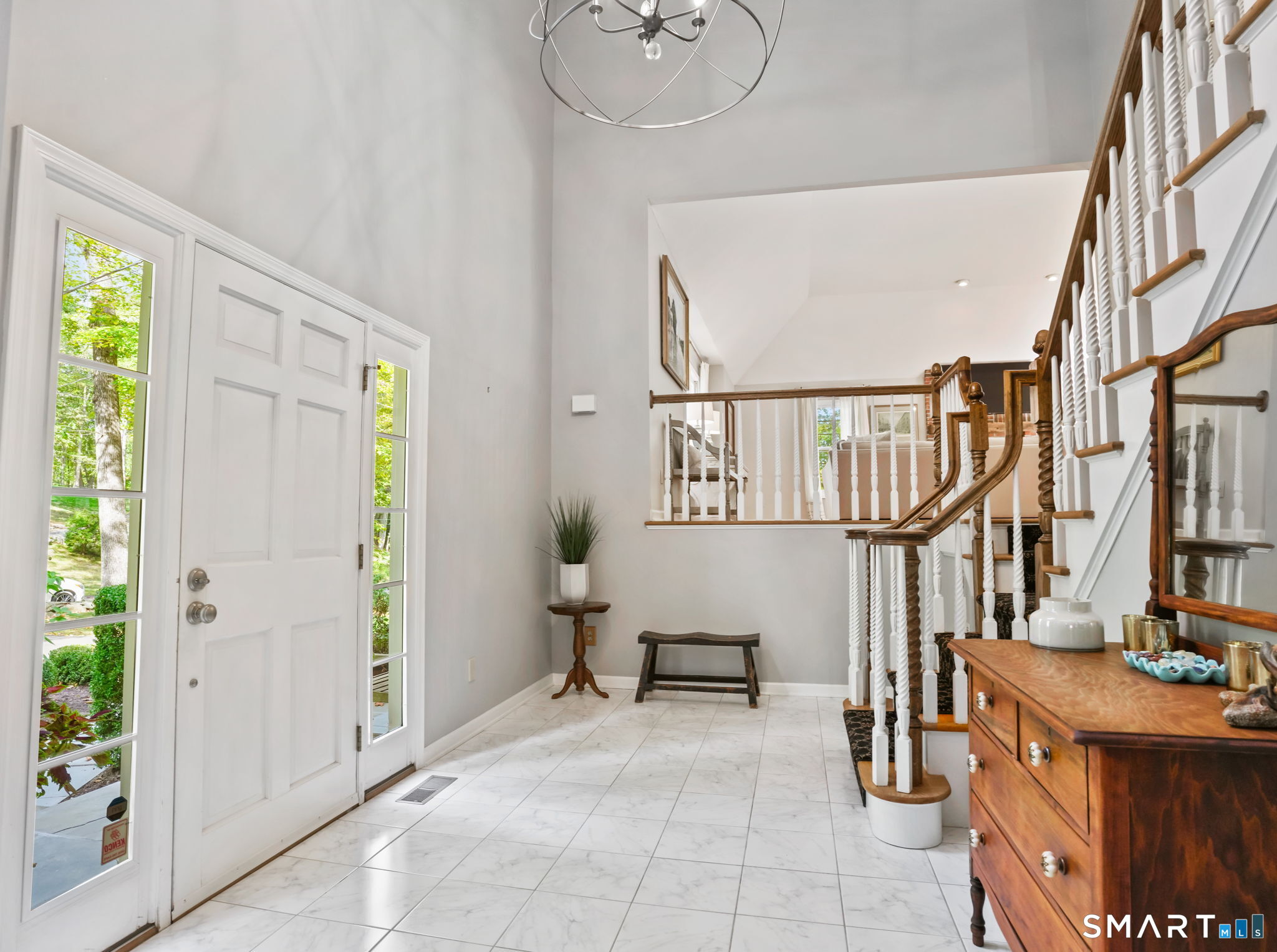 Coventry Lane, a cul-de-sac setting in Trumbull's coveted Tashua neighborhood, known for its estate-style homes and just moments to golf, pool, tennis, pickleball, and more. From the curb, the architectural presence stands out w/ intricate rooflines & detail that set the tone. A dramatic two-story foyer w/ sweeping staircase opens to an inviting, well-designed layout. The living room is anchored by a fireplace, offering a comfortable yet refined space. The kitchen is built for everyday living and entertaining, featuring extensive cabinetry, a full corridor of cabinet/counter space, double ovens, and an eat-in area centered on a triple-panel slider to the deck. Just a few steps up, the vaulted family room steals the show with a bold brick fireplace and custom wet bar with glass cabinetry and wine storage. Private main level office behind French doors. Upstairs offers 4 bedrooms, including a fully remodeled hall bath w/ double vanity & modern finishes. The primary suite is impressive beyond measure- vaulted ceilings, architectural windows & a custom walk-in closet- built w/ cabinetry and countertop space. The primary bath is exceptional, completely renovated w/ a soaking tub set beneath a statement window, frameless glass shower, heated floors & high-end finishes throughout, a true retreat. Set on a private, tree-lined acre w/ multi-tiered deck & expansive paver patio built for entertaining. Where elevated design, refined space, and effortless flow come together. Welcome home!