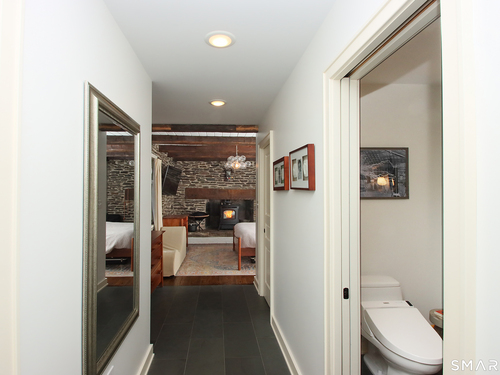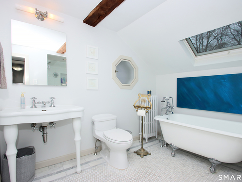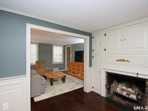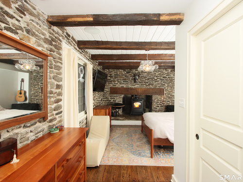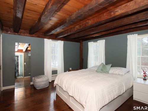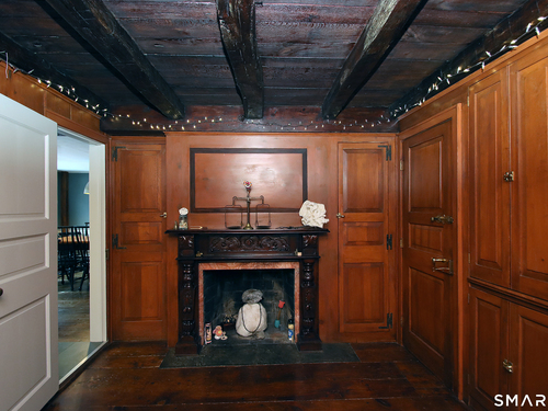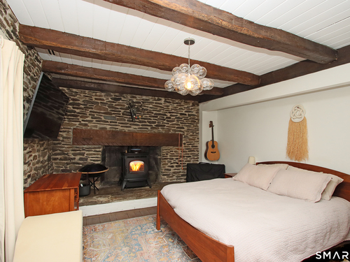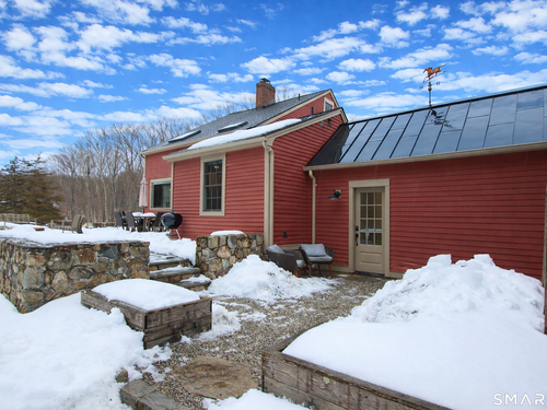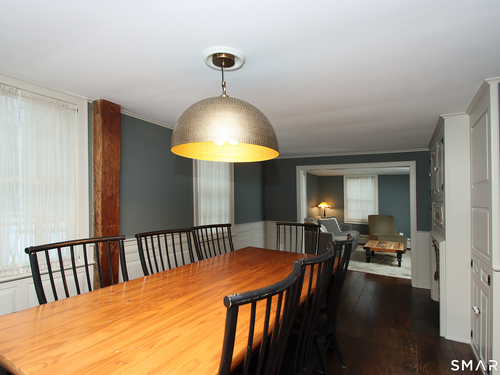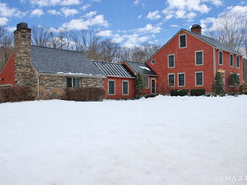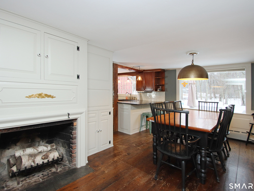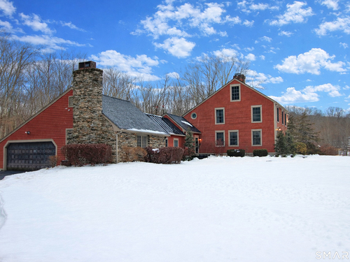This antique salt box home, in the federal half house style brings the best of old and new! Beamed ceilings, built-ins throughout,antique heart pine in the entryway,wide plank hardwood flooring and slate flooring, open kitchen with counter seating,granite counters and slate flooring, dining room with accent fireplace and period trim flows into living room full of charm and convenient for gatherings and entertaining. Main level primary suite features full bath, walk in closet, central air and gorgeous accent fireplace with pellet stove. First floor laundry room off large mudroom and half bath separate the primary from the rest of the house for privacy.Entry foyer and parlor with built ins for additional storage and accent fireplace round out the main level. 3 additional bedrooms upstairs plus an office and a renewed full bath with walk in shower and claw foot soaking tub.Gorgeous property boasts oversized slate patio overlooking expansive perfectly lovely level lot with lower level peastone garden area featuring raised garden beds. Efficient propane heat, on demand hot water system, newer windows in most rooms plus an attached garage and shed for additional storage. New leeching fields 2025.Central air in primary only.