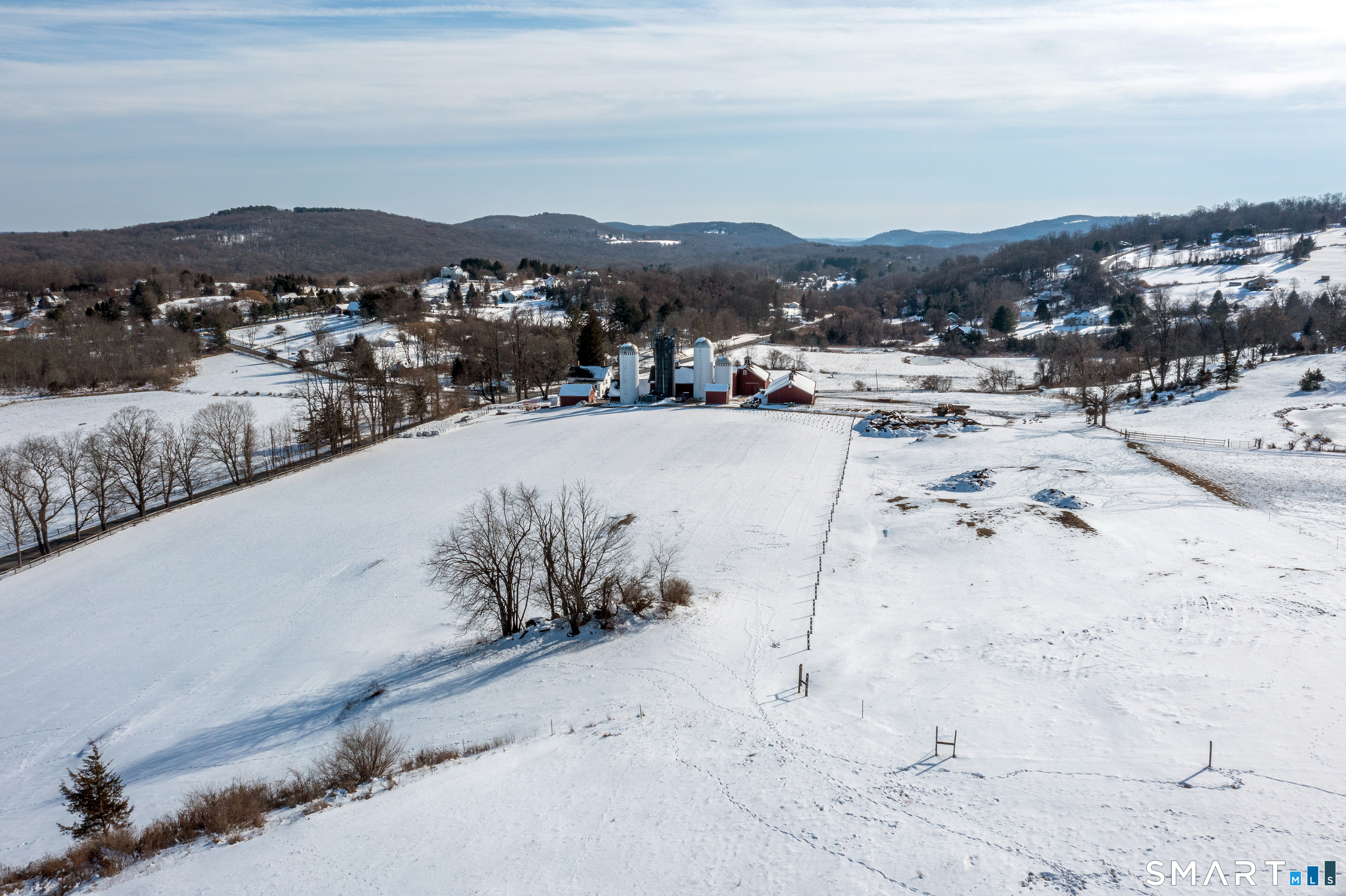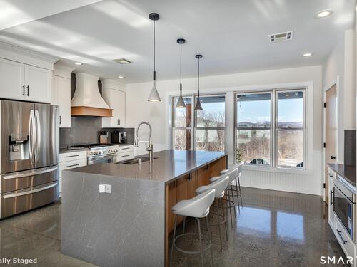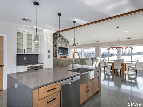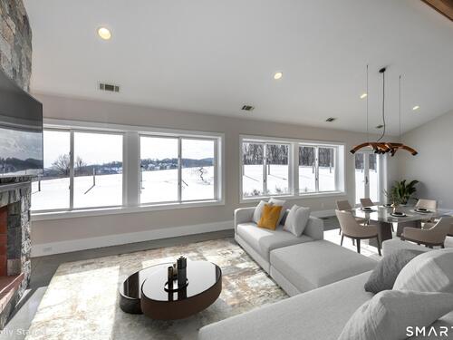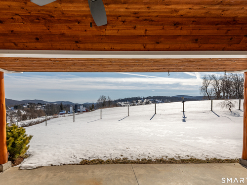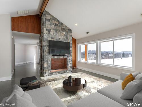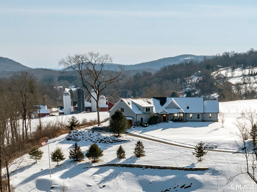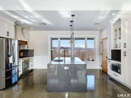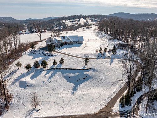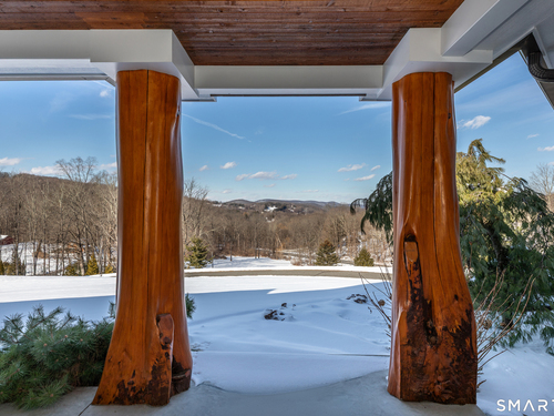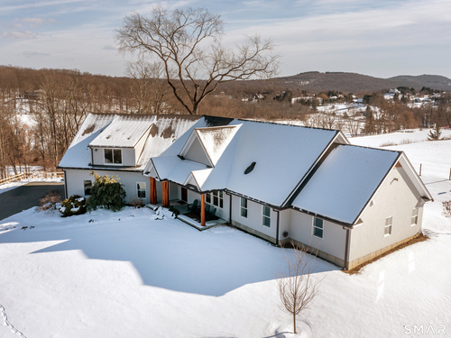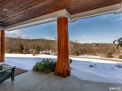 Beautifully sited on a gentle rise, this striking Contemporary commands sweeping panoramic views of the surrounding landscape. The home overlooks the iconic Happy Acres Farm, permanently preserved by the Town of Sherman, ensuring timeless pastoral vistas. The open floor plan features three bedrooms, including a main-level primary suite, three full and two half baths, a main-level study, and a dramatic living/dining space with vaulted ceilings and a stone-faced, double-sided bio-ethanol fireplace. The sleek kitchen includes quartz countertops, bar seating, a walk-in pantry, and top-tier SS appliances. The main level's polished concrete floors and walls of oversized windows frame stunning front and rear views, filling the home with natural light. Upstairs are two en suite bedrooms with a large, shared sitting/playroom. Additional features include a walk-up attic with excellent expansion potential, radiant heat throughout the home and three-car garage, plus a separate laundry room. Outdoor living is equally inviting with an eight-person hot tub overlooking the rolling countryside and French doors opening to a covered patio with an outdoor fireplace. There is also your own golf tee! Freshly stained exteriors and newly painted interiors create an elegant, turnkey, move-in-ready residence. Ideally located just 90 minutes from Manhattan and minutes to NYC trains.