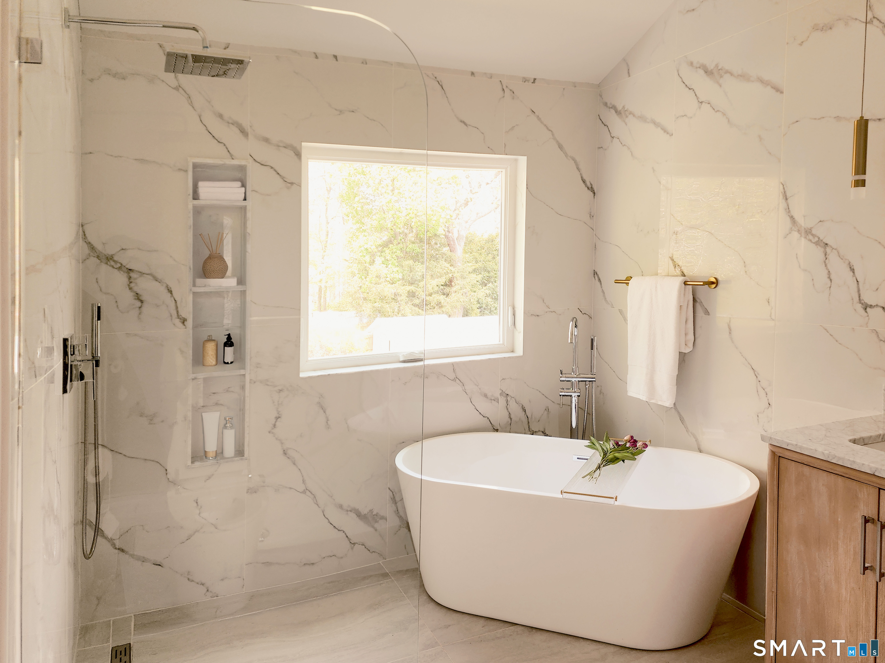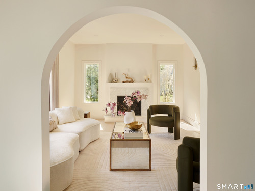 Step into this fully gut-renovated, reimagined rare gem in Riverside. Expanded to nearly double its original footprint, this beautiful home has been meticulously designed by Abode Interiors NYC. A striking bend of graceful arches, soaring 9 & 10 foot cathedral ceilings, wide Brazilian oak floors, a marble fireplace, & all-new windows filling the space with light. At the heart is an Architectural Digest-worthy custom eat-in kitchen, beautifully appointed with Calacatta Gold marble backsplash, quartz countertops, Bosch appliances & bespoke millwork. The dining area opens to a deck via 12-ft sliding doors for seamless indoor-outdoor living. Upstairs, a light-filled, spacious lofted living area offers a versatile retreat for relaxing, or entertaining. On a private floor the primary suite is a serene escape, with a custom-designed closet & a spa-inspired bath with soaking tub. Bedrooms are on separate floors, offering privacy. Outside, an oversized deck overlooks an expansive backyard framed by lilacs, irises, & hydrangeas, complete with a charming brick shed & flower beds. All new systems & structures, including a new expanded paver driveway, Hardie siding, dual-zone HVAC on Google Nest, tankless water heater, upgraded electrical, soundproofing & more-offering effortless turnkey living. Ideally located minutes from parks, Riverside Mall, & Old Greenwich shopping.