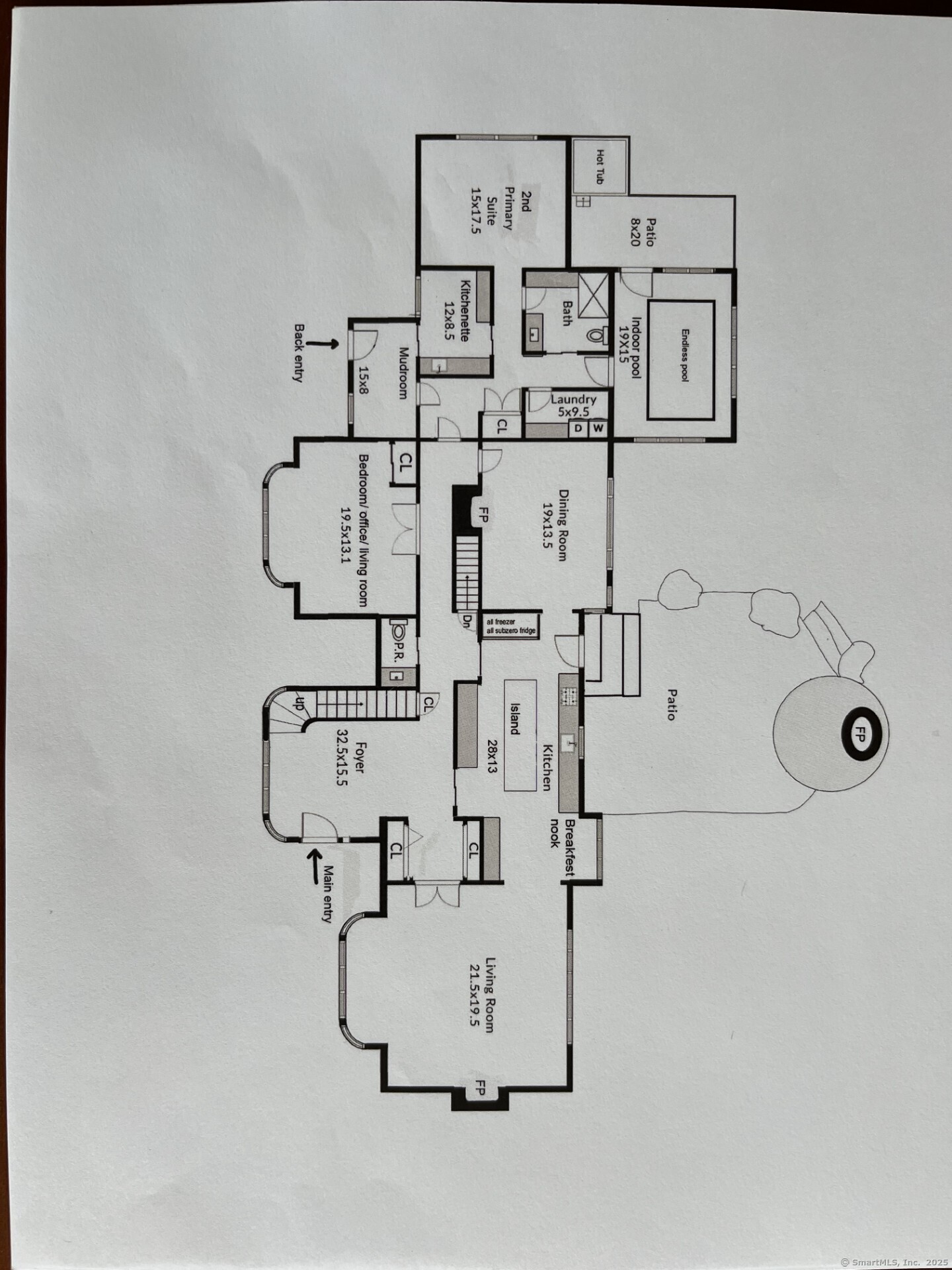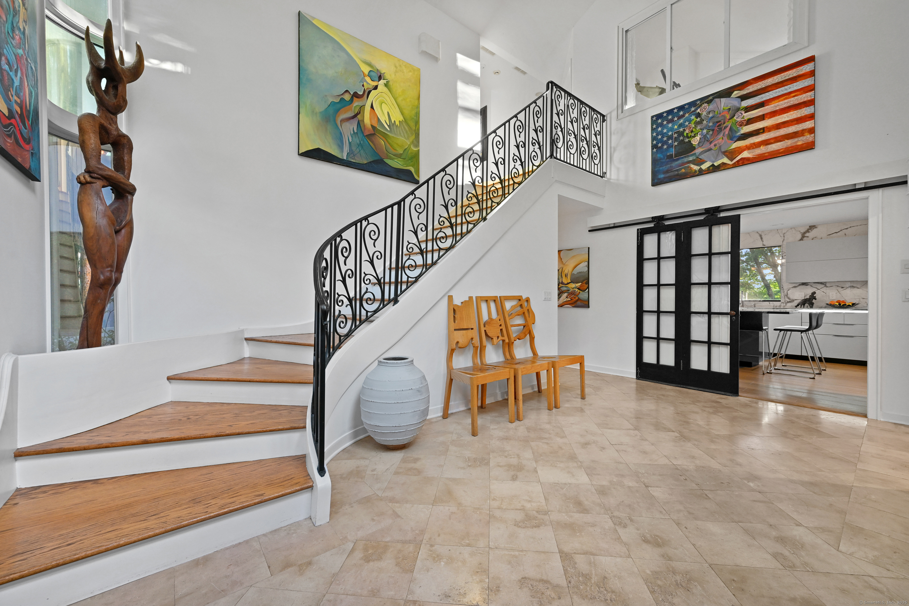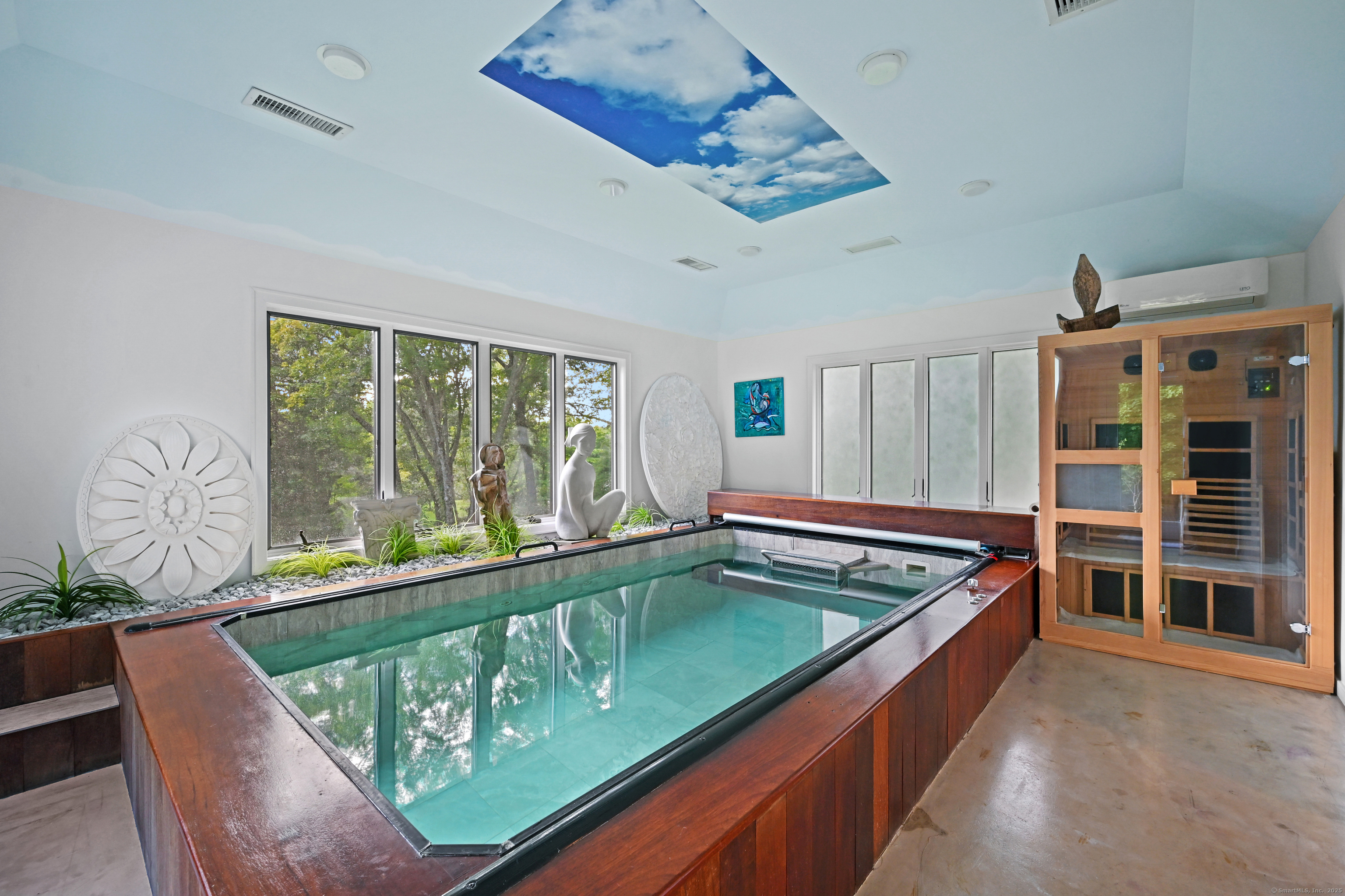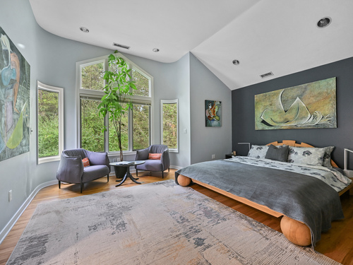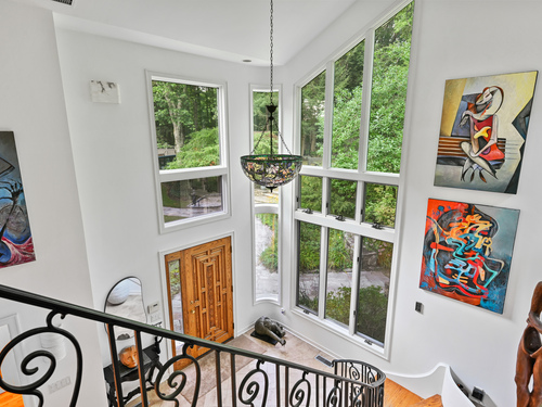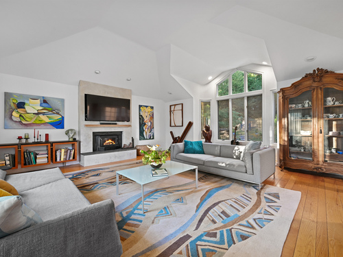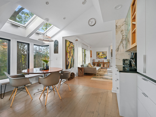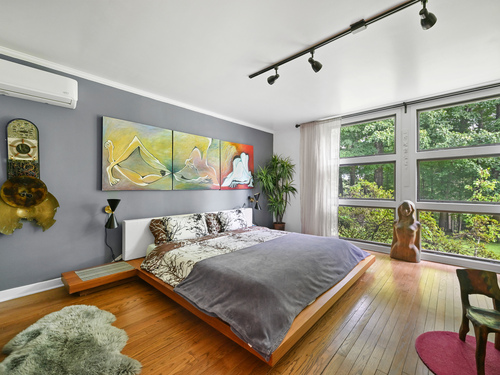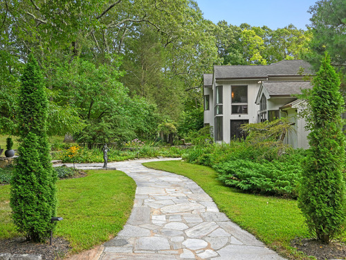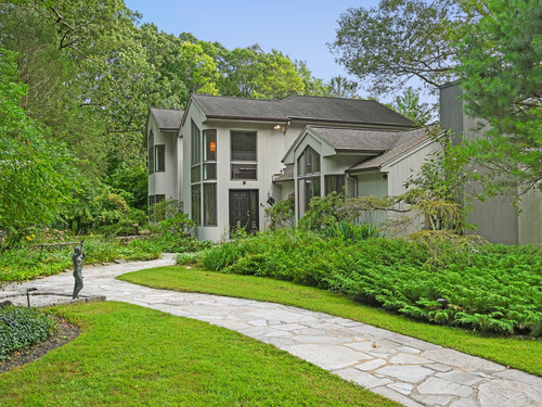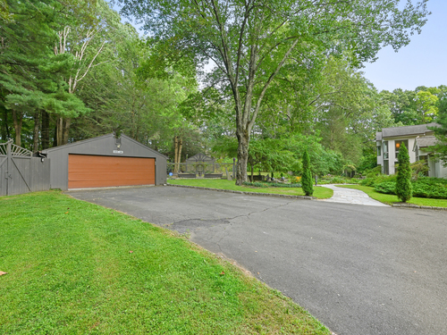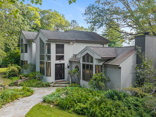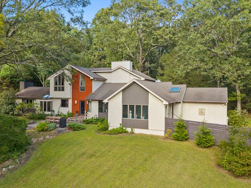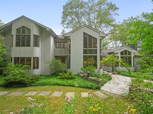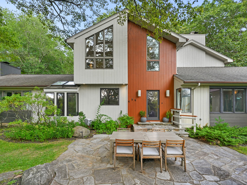 A celebrated artist's estate, this extraordinary mid-century modern residence is a statement of design and lifestyle. Gated and private on nearly four acres, the home opens with a dramatic foyer of soaring glass and a sweeping wrought-iron stair. Light cascades across gleaming hardwood floors and cathedral ceilings, where striking architectural lines create a gallery-like backdrop for living and entertaining. The vaulted living room, anchored by a sculptural fireplace, flows to a sleek chef's kitchen with lacquered maple cabinetry, bold granite counters, and professional Wolf, Bosch, and Sub-Zero appliances. A breakfast area and elegant dining room-complete with its own fireplace-offer refined spaces for gatherings of any scale. The main level also includes a rare guest or second primary suite with kitchenette and glamorous bath, plus a versatile office/bedroom with custom built-ins. Upstairs, the primary retreat impresses with vaulted ceilings, a walk-in closet, and spa bath, joined by an additional en-suite bedroom. The lower level surprises with a pub and recreation room. Beyond the interiors, manicured grounds feature curated gardens, meandering stone paths, and multiple destinations for leisure: an enclosed porch with sauna and Endless Pool, hot tub and firepit patio, greenhouse, vegetable garden, and chicken coop. A property of uncommon artistry and vision-seamlessly balancing luxury, sustainability, and serenity. Close to all commute routes to NYC and down county.