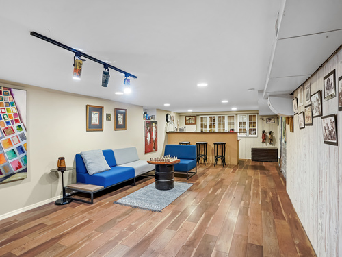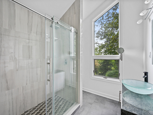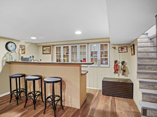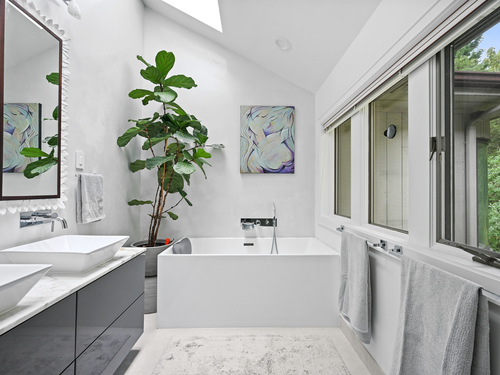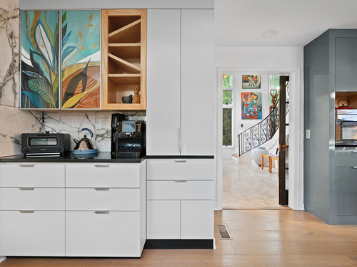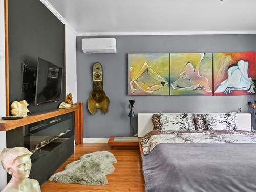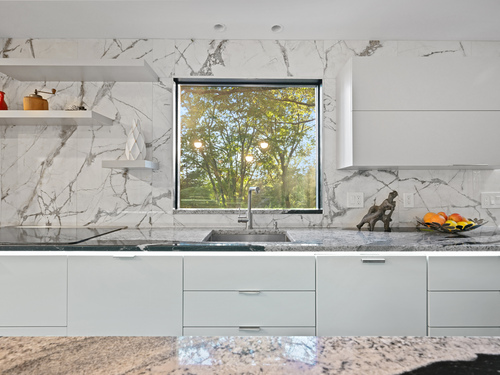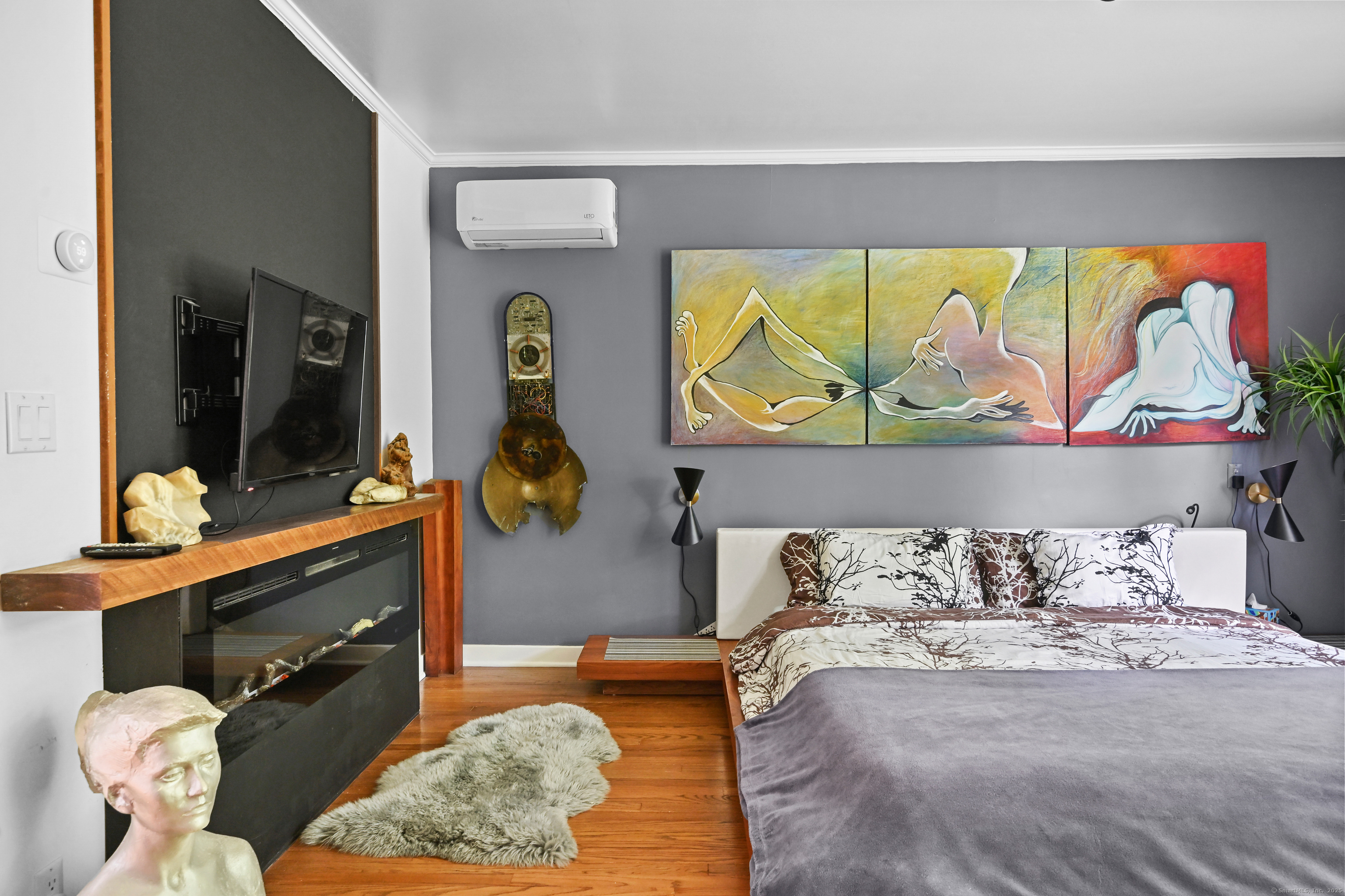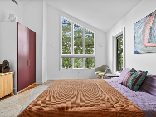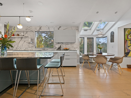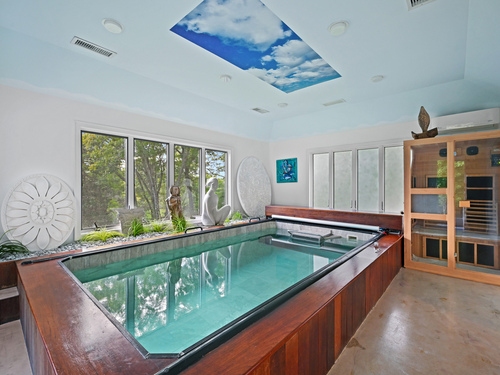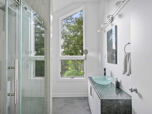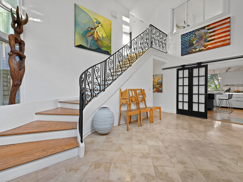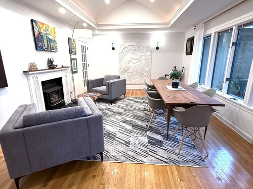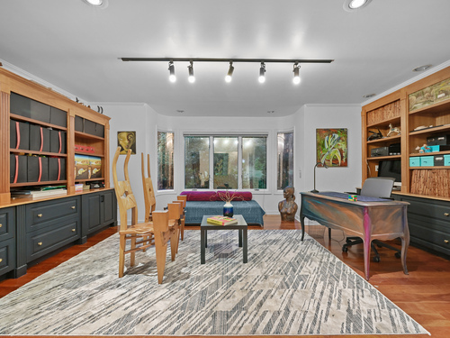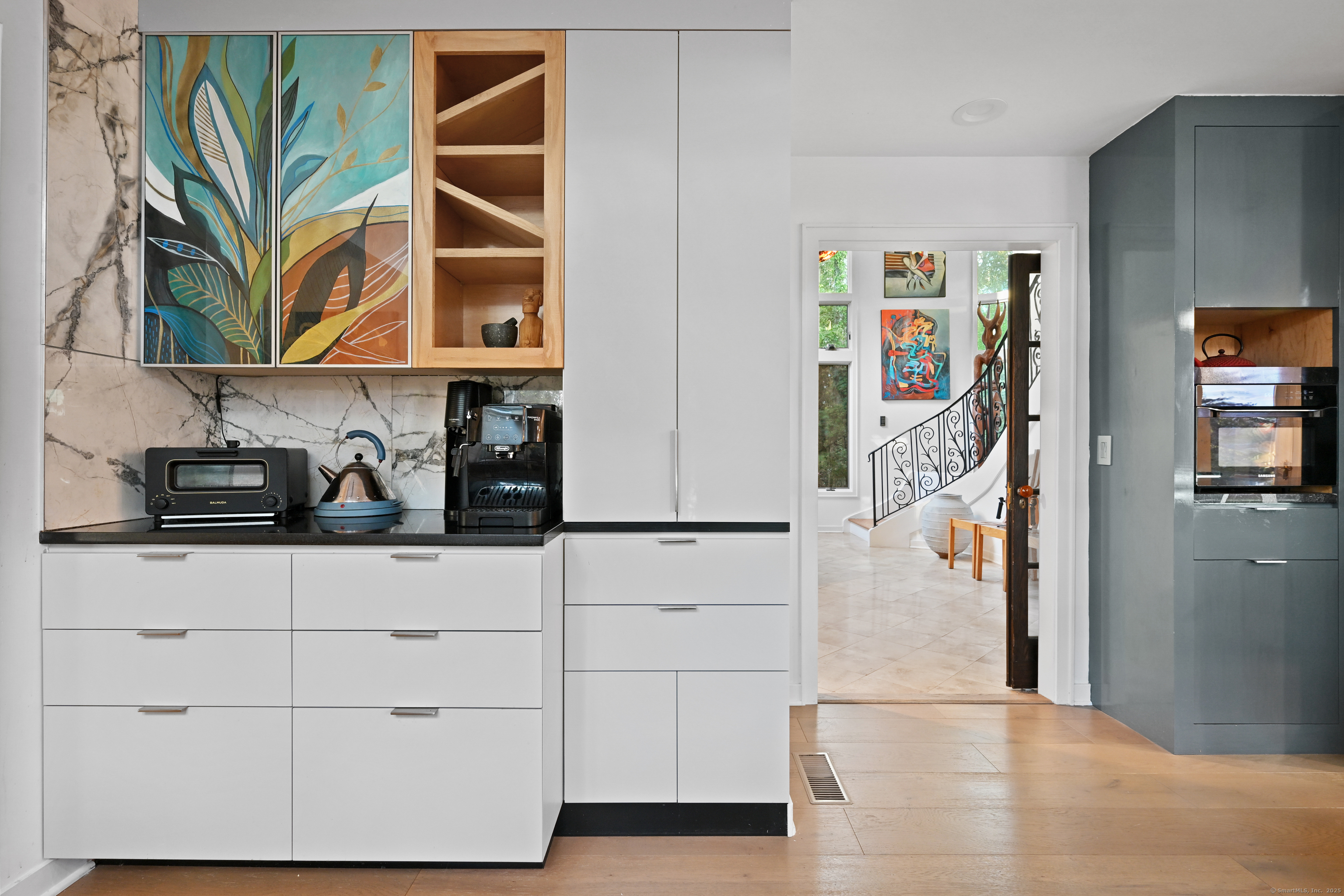 A celebrated artist's estate, this extraordinary mid-century modern residence is a statement of design and lifestyle. Gated and private on nearly four acres, the home opens with a dramatic foyer of soaring glass and a sweeping wrought-iron stair. Light cascades across gleaming hardwood floors and cathedral ceilings, where striking architectural lines create a gallery-like backdrop for living and entertaining. The vaulted living room, anchored by a sculptural fireplace, flows to a sleek chef's kitchen with lacquered maple cabinetry, bold granite counters, and professional Wolf, Bosch, and Sub-Zero appliances. A breakfast area and elegant dining room-complete with its own fireplace-offer refined spaces for gatherings of any scale. The main level also includes a rare guest or second primary suite with kitchenette and glamorous bath, plus a versatile office/bedroom with custom built-ins. Upstairs, the primary retreat impresses with vaulted ceilings, a walk-in closet, and spa bath, joined by an additional en-suite bedroom. The lower level surprises with a pub and recreation room. Beyond the interiors, manicured grounds feature curated gardens, meandering stone paths, and multiple destinations for leisure: an enclosed porch with sauna and Endless Pool, hot tub and firepit patio, greenhouse, vegetable garden, and chicken coop. A property of uncommon artistry and vision-seamlessly balancing luxury, sustainability, and serenity. Close to all commute routes to NYC and down county.