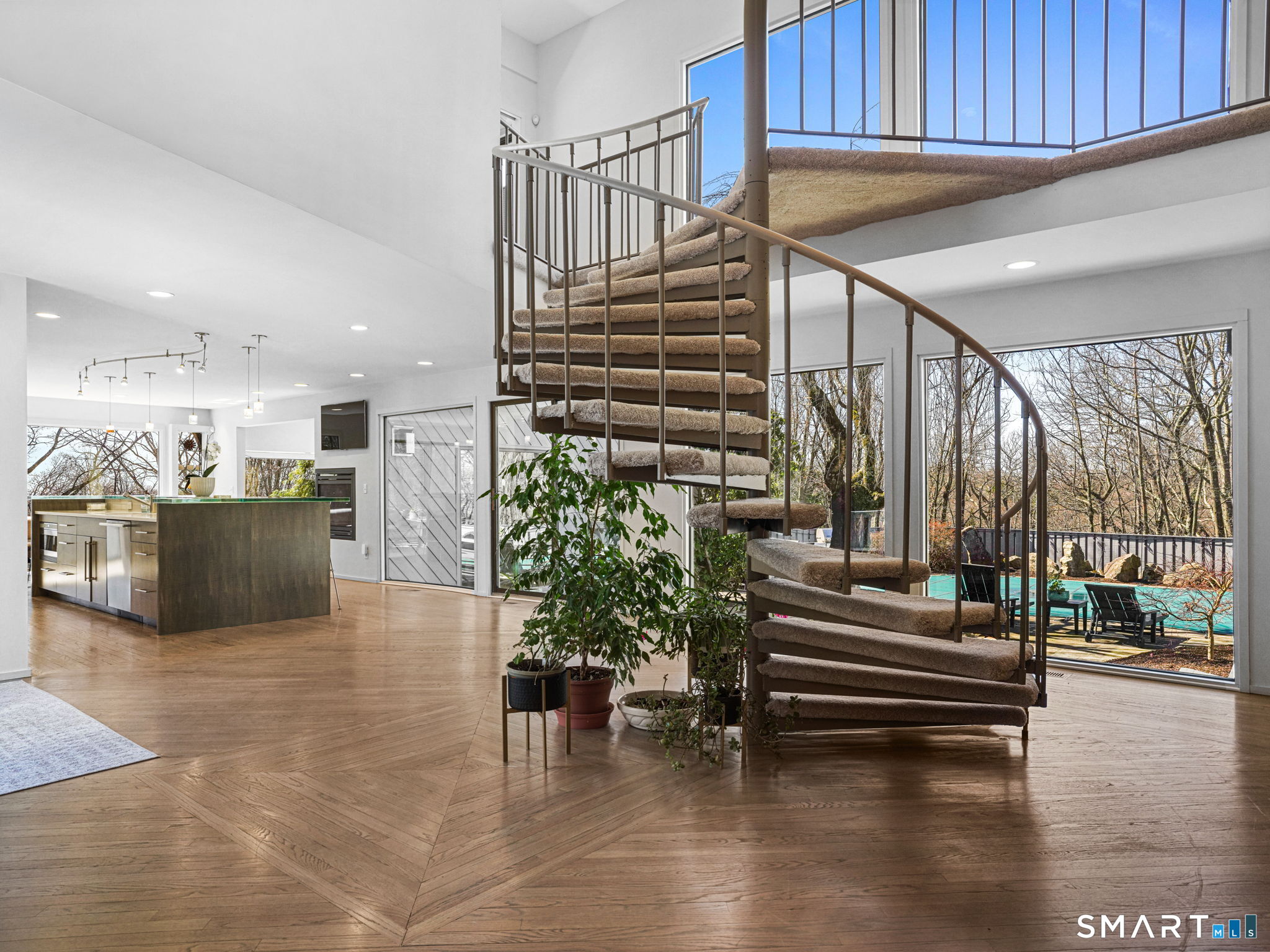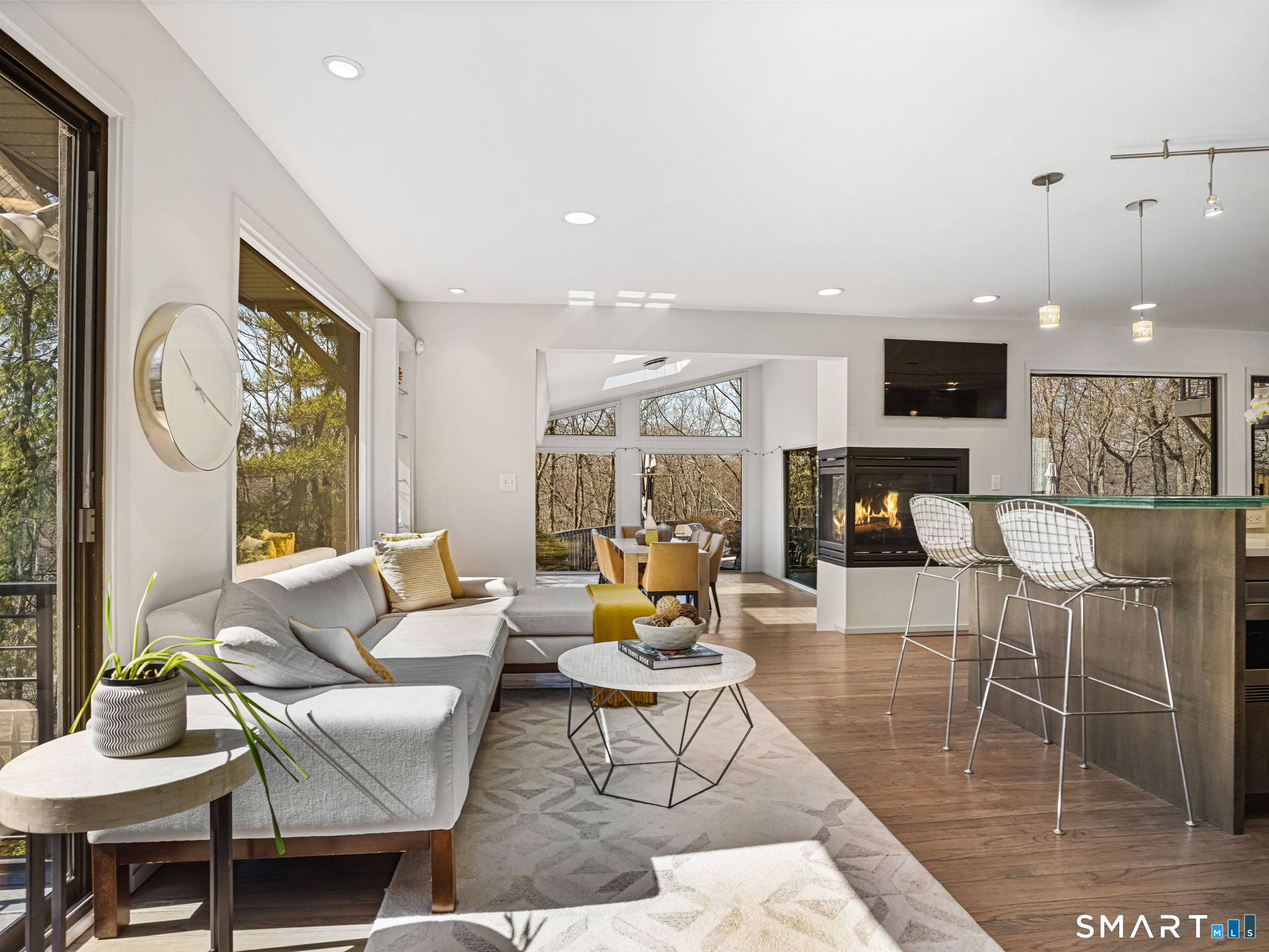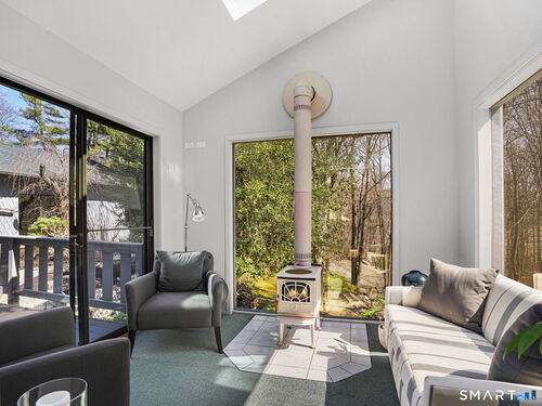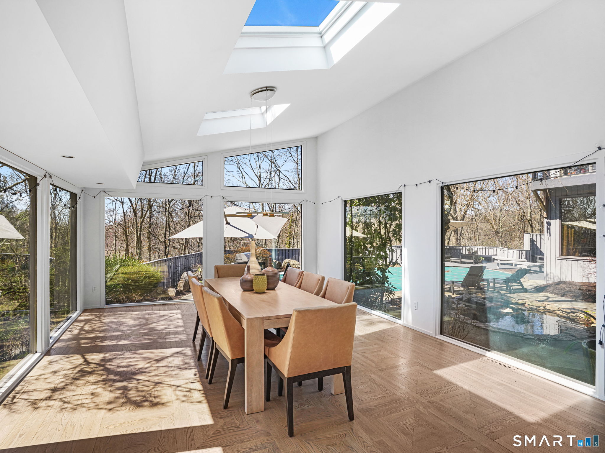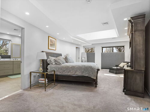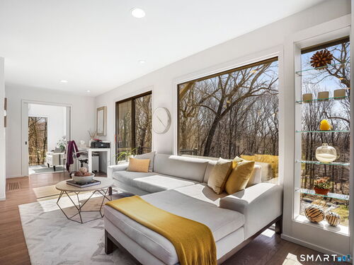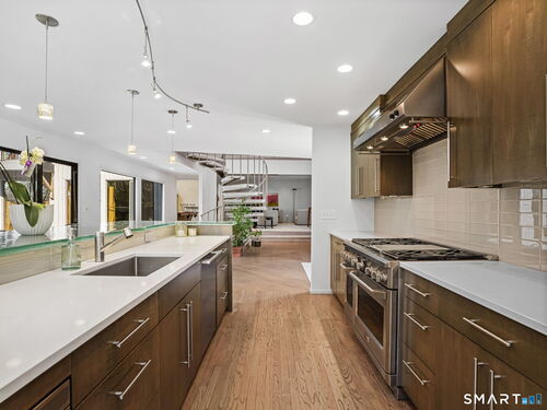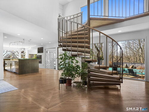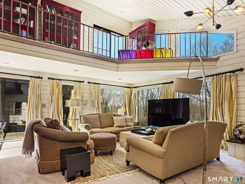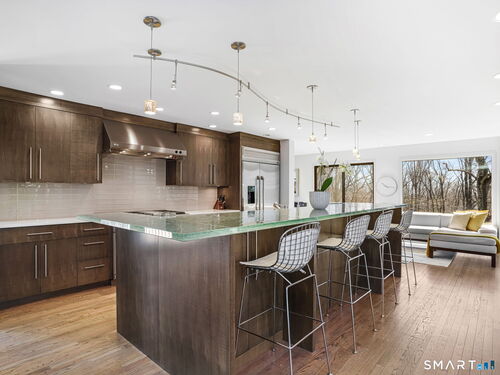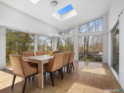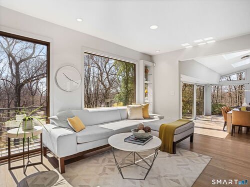 A distinctive architectural statement offering a rare blend of design, scale, and lifestyle, set in the highly desirable Nichols section of Trumbull with deeded rights to Dogwood Lake. Just under 5,000 sf, this thoughtfully updated & exceptionally well-maintained residence reflects a true attention to detail throughout, from the intentional window placement that captures natural light & views to the custom hardwood flooring patterns. Defined by soaring ceilings, walls of glass & a seamless connection between indoor and outdoor living, the main living areas open to a private backyard retreat featuring an in-ground pool and multiple entertaining spaces. The kitchen is a true centerpiece, designed w/ custom Segue by Ovation cabinetry, GE Monogram appliances, a walk-in pantry spanning the entire back wall, and an oversized island with glass countertops that anchors the space while flowing effortlessly into the surrounding rooms. A stunning dining area w/ vaulted ceilings, skylights, and wraparound glass creates a dramatic, light-filled setting with beautiful views of the property. Multiple balconies further enhance the connection to the outdoors. The primary suite offers a private retreat with a spacious walk-in closet and two fully renovated, spa-like bathrooms, while every bathroom throughout the home has been updated with clean, modern finishes. The outdoor setting delivers a true resort-style experience & deeded rights to Dogwood Lake offer an added lifestyle benefit.