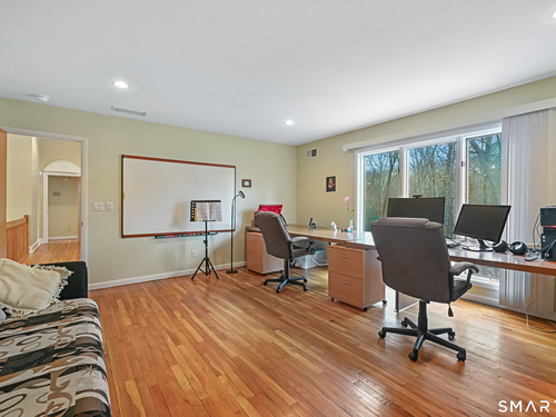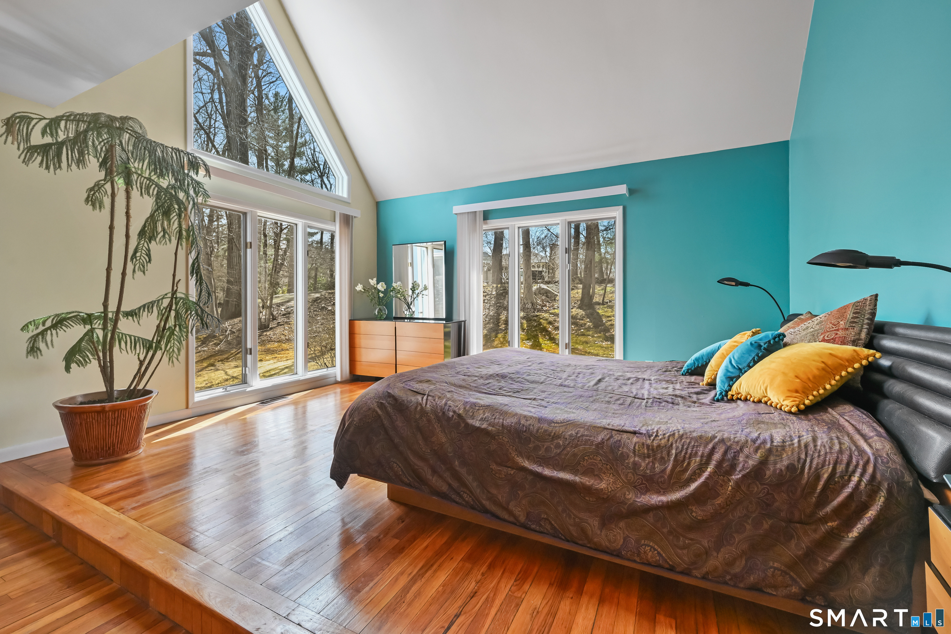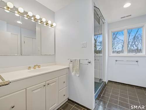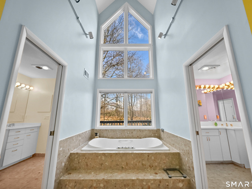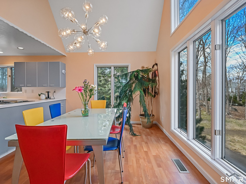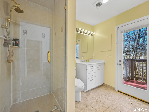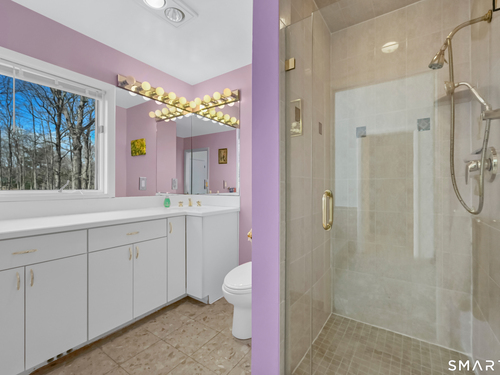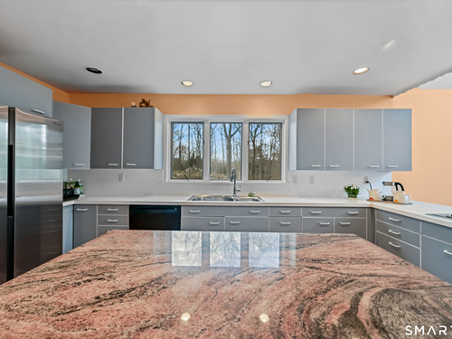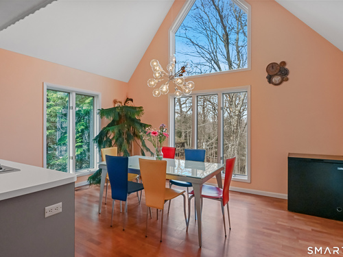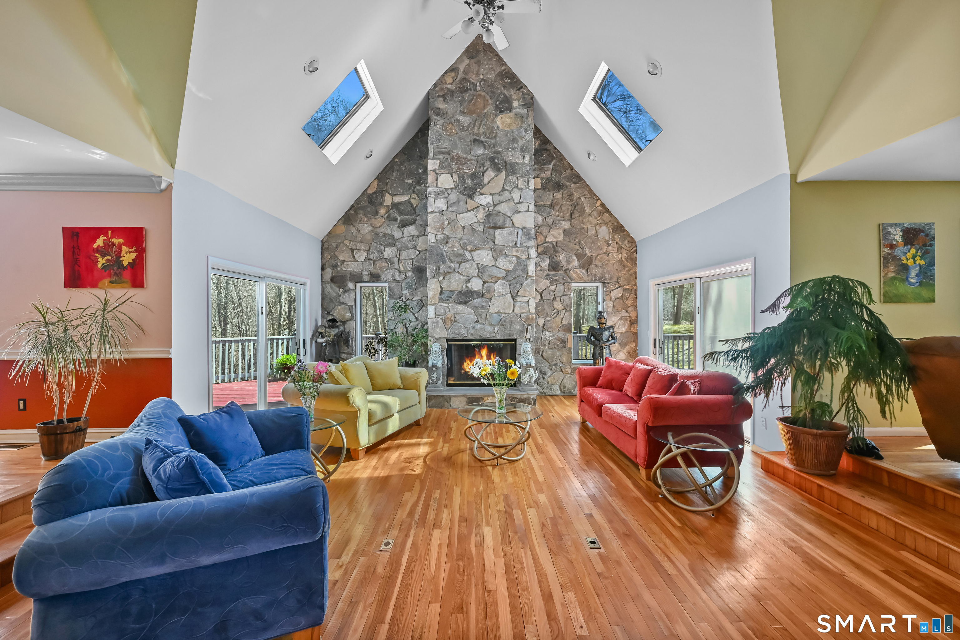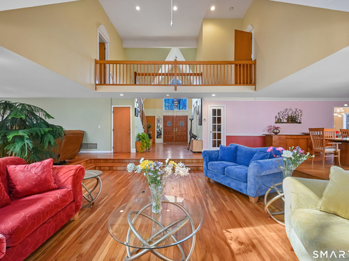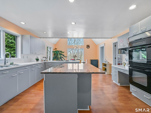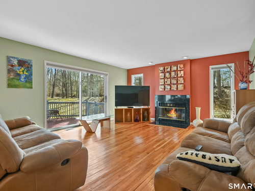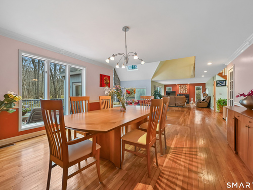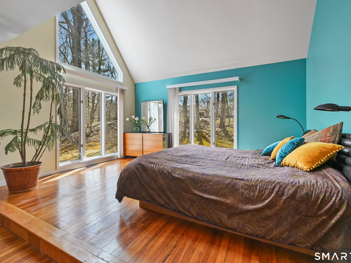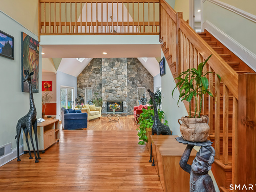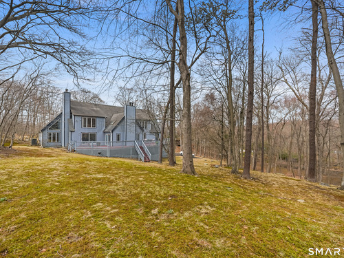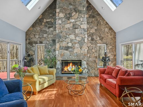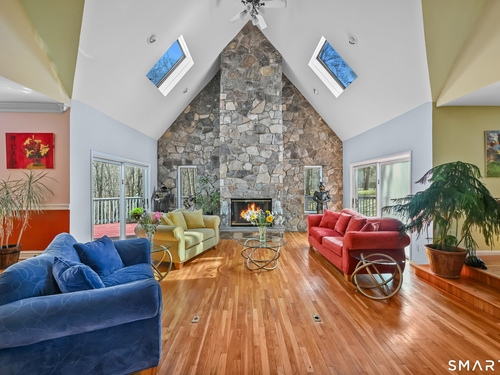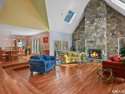 Timeless and architecturally designed, this contemporary home blends soaring vaulted ceilings with panoramic views for a seamless connection to the outdoors. Set on 2.32 peaceful, private acres, it captures natural light year-round while remaining minutes from every convenience. The open-concept layout is ideal for both entertaining and everyday living. A dramatic two-story stone fireplace anchors the main living area, with expansive rooms that flow to a large deck overlooking tranquil, elevated views. The chef's kitchen offers a granite island, abundant cabinetry, and an eat-in space beneath a vaulted ceiling with an oversized window framing nature. The first-floor primary suite is a true retreat with dual baths, separate showers, a whirlpool tub beneath a cathedral ceiling, and generous walk-in closets. Upstairs are three spacious bedrooms and full baths. An oversized third-floor attic provides excellent storage, while the unfinished walk-out basement offers endless possibilities with direct access to the three-car garage. Exterior and lower level recently painted. Near North Mianus School and central Greenwich amenities, this home is a rare blend of privacy, design, and location-an inspiring retreat for modern living.