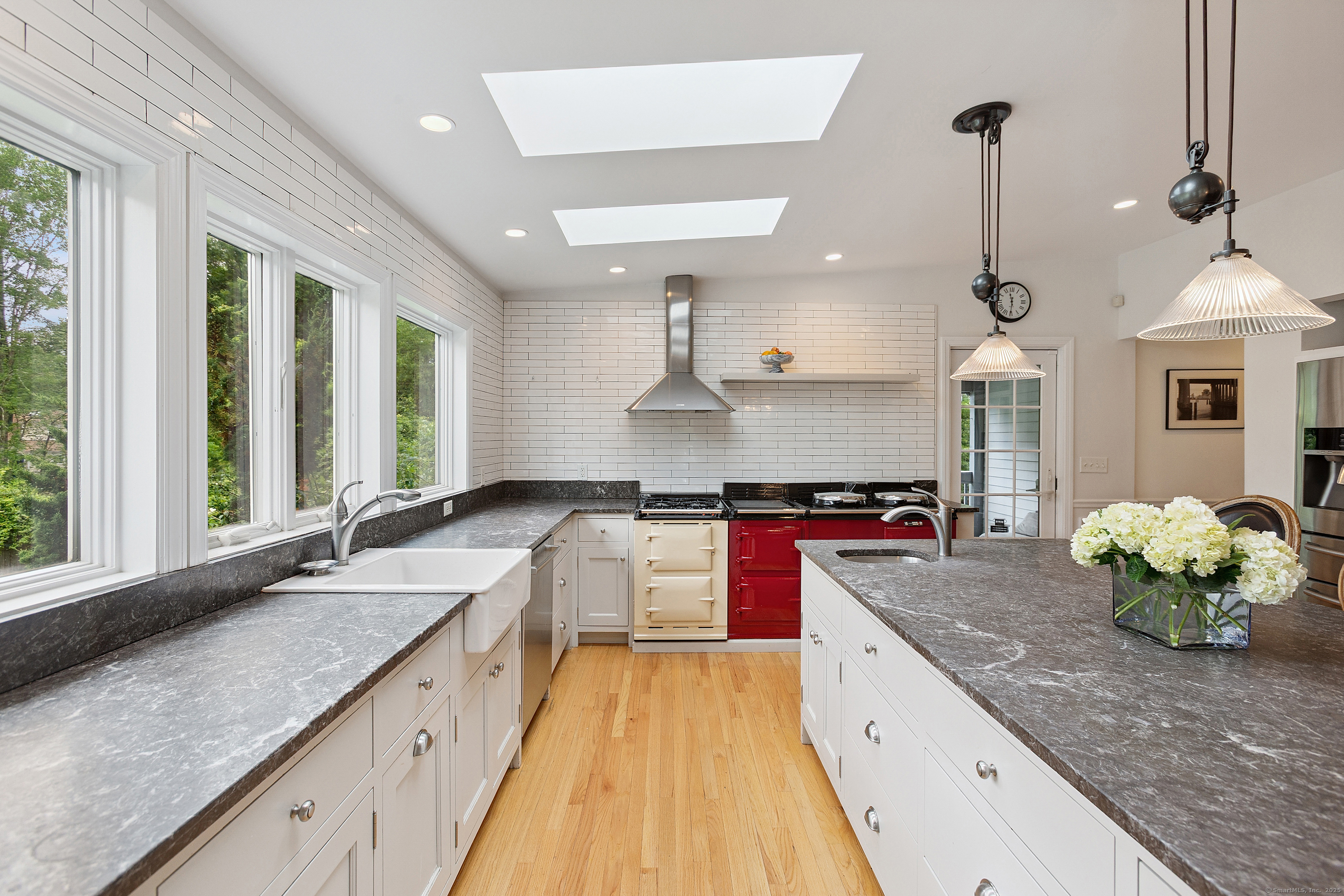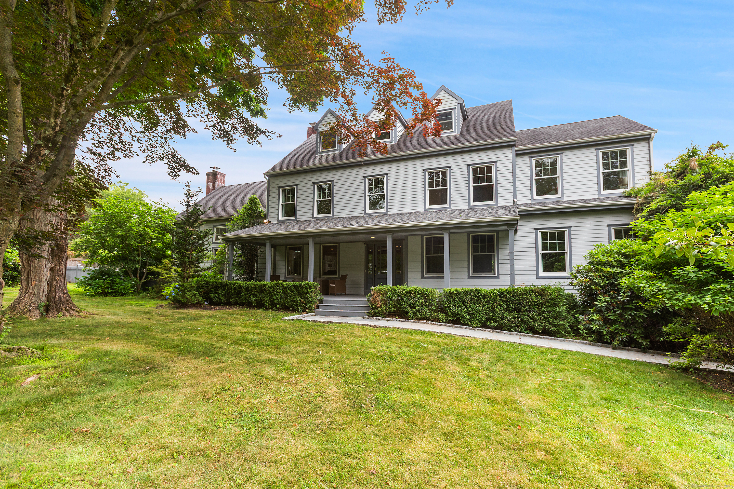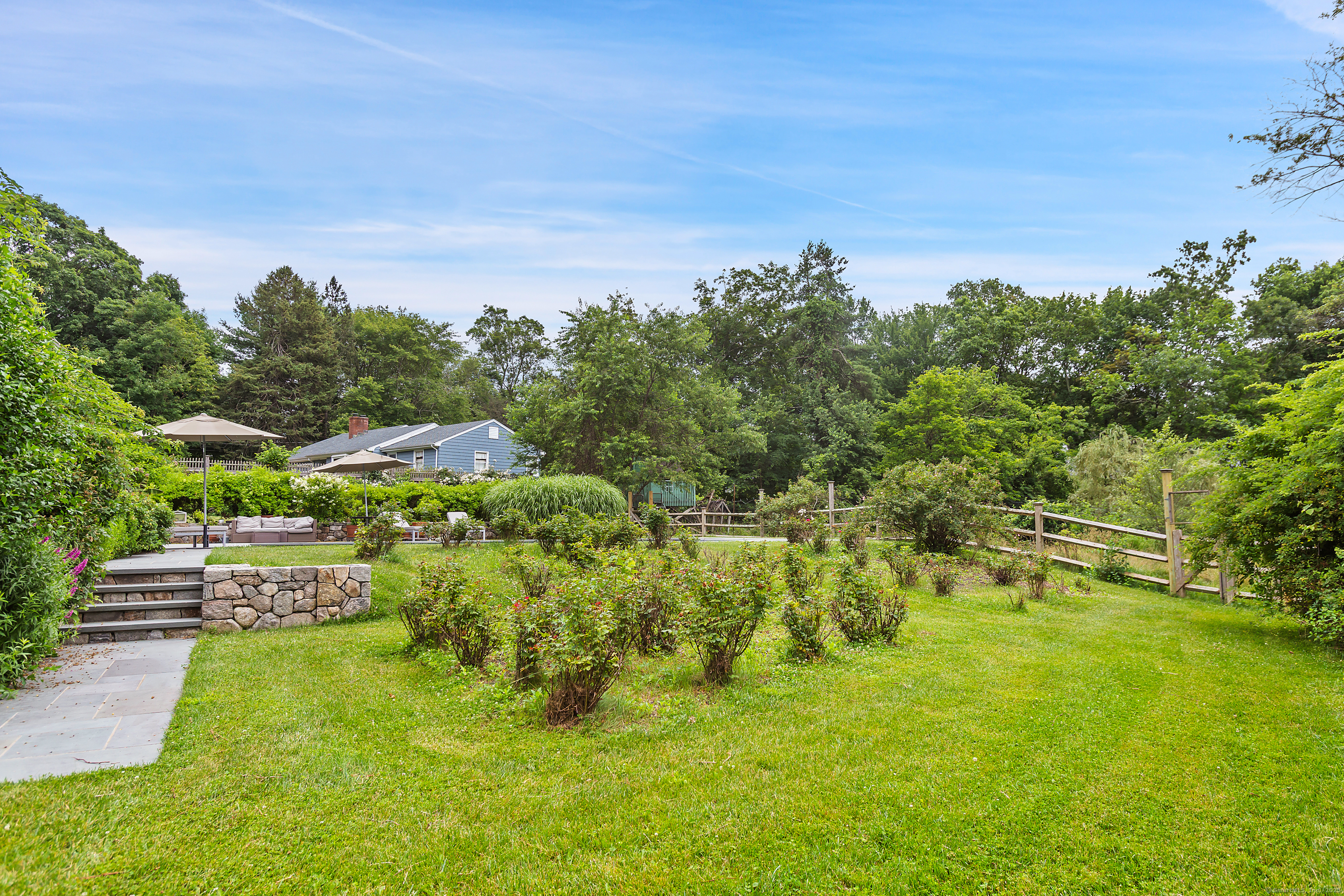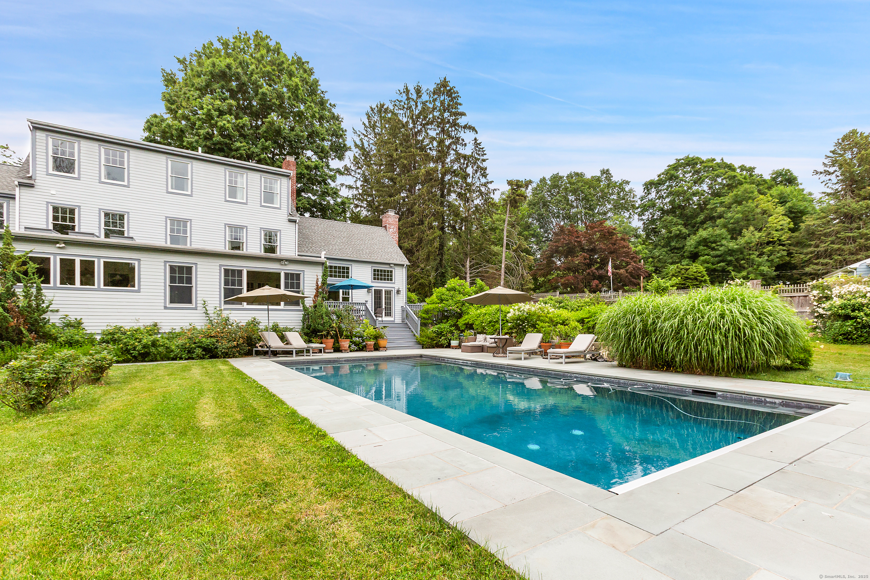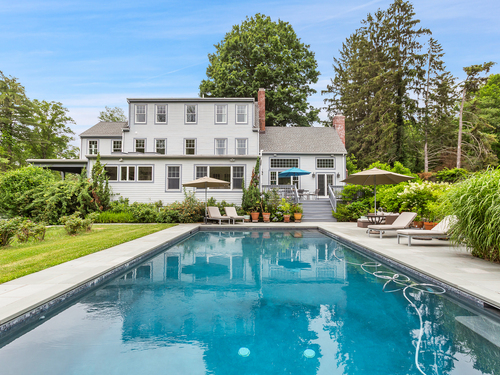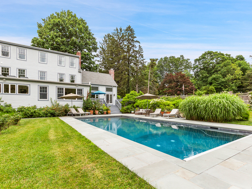 Welcome to a one-of-a-kind home in the heart of Westport - where timeless Colonial charm meets the elegance of a Parisian Estate. Set on an acre+ this home offers sophistication, space, and serenity throughout. The light-filled LR stuns with vaulted ceilings, HW floors, a wood-burning fireplace, and French doors opening directly to the deck and pool - the perfect setting for everyday living or entertaining. The formal DR offers its own fireplace, blending classic character with warmth and style. The chef's kitchen features two iconic AGA stoves, a walk-in pantry, skylights and a large center island. A charming covered porch offers peaceful morning coffee or evening outdoor dining. Upstairs, the primary suite, is a private sanctuary with vaulted ceilings, sunny sitting room, HW floors, walk-in closet, and spa-like bath incl cast iron soaking tub, oversized shower and elegant finishes. Add'l bedrooms 1 en suite the other w hall bath on the 2nd floor and 2 more Bedrooms on the 3rd floor w Hall Bath are bright and spacious, each w/ HW floors and serene views of the pool and gardens. The LL offers gym area, work space, storage and access to 2 car garage. The fully fenced backyard is a private paradise. Stone walls, mature English gardens and spectacular In-ground pool with auto cover add to the magic of this private oasis. Whole House Generator. Minutes to schools, shopping and town offering the rare combination of luxury, charm, privacy and convenience.