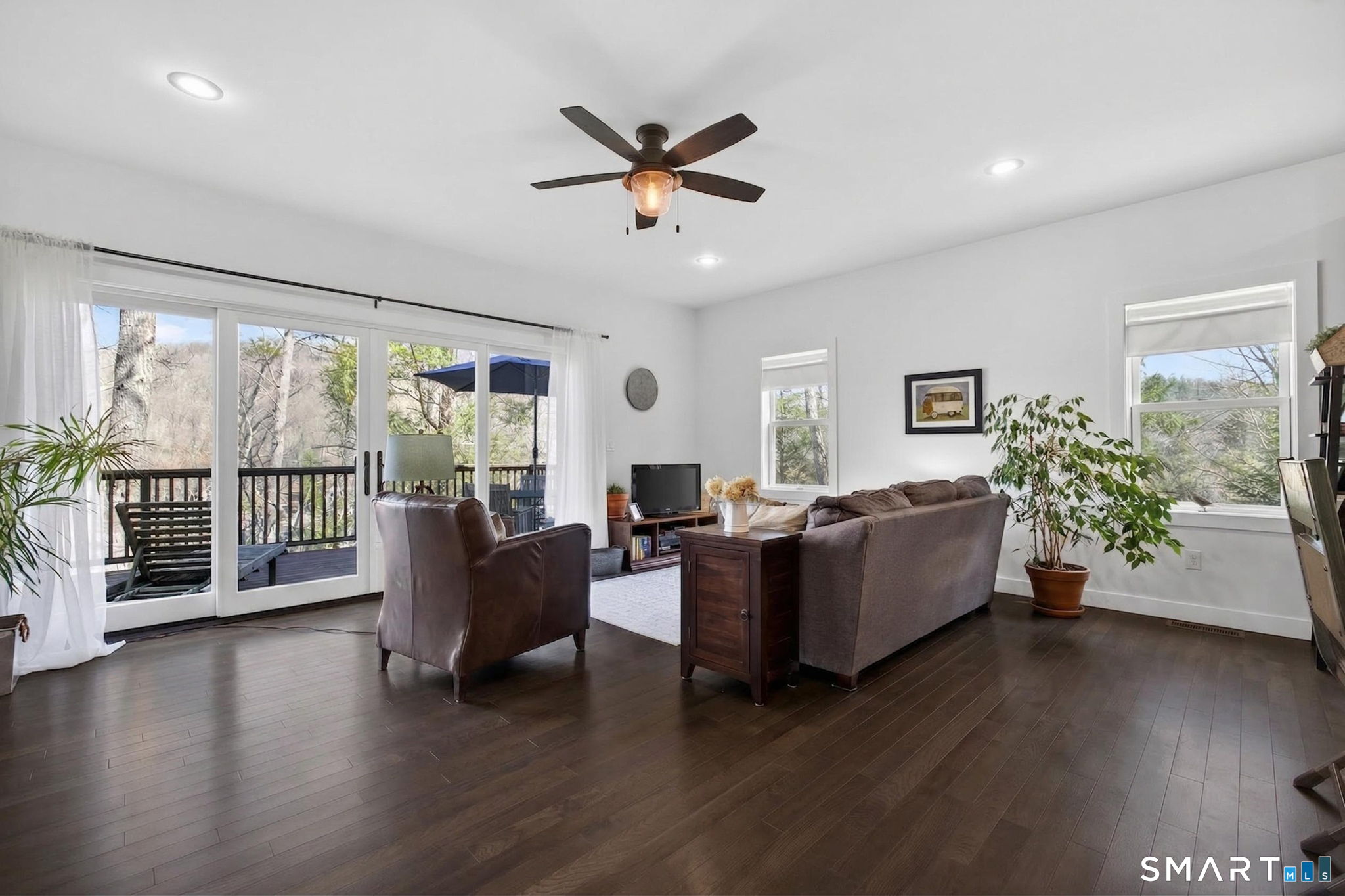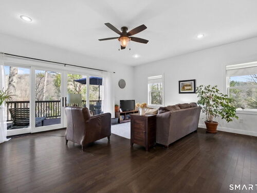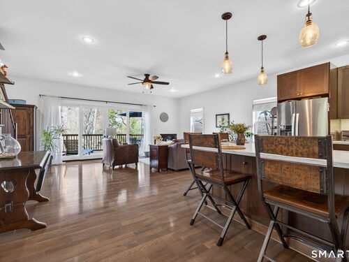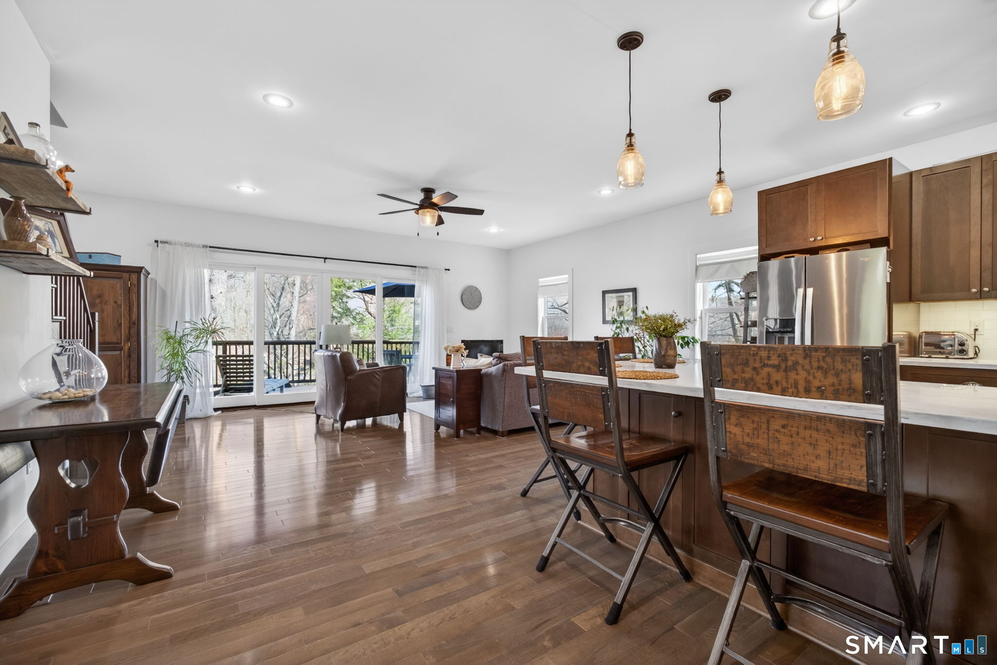 9 ft+ Ceilings, Balcony/Deck, Ceiling Fan, Dining Area, Sliders, Hardwood Floor
