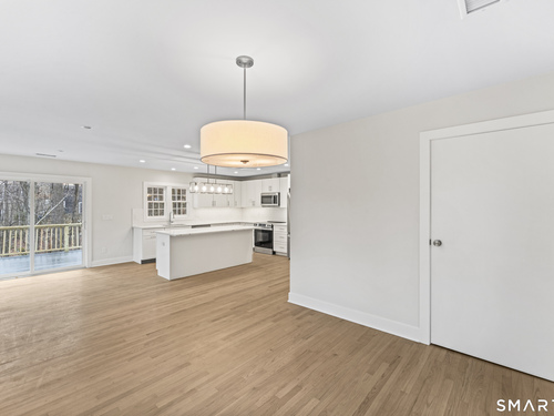 Balcony/Deck, Eating Space, Fireplace, Island, Sliders, Hardwood Floor