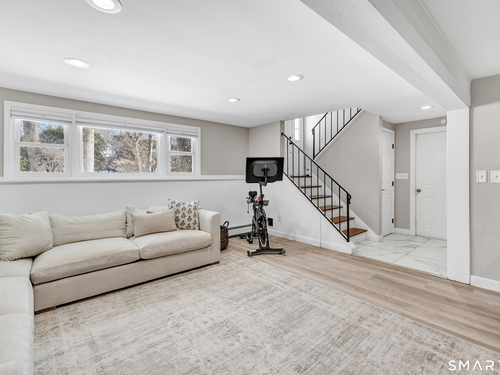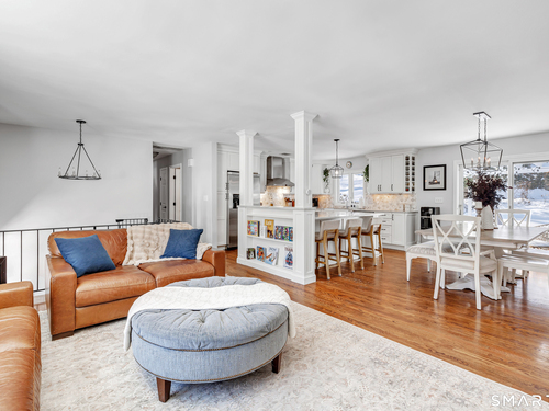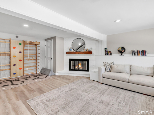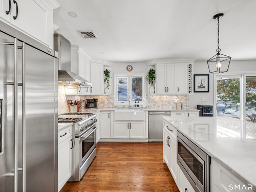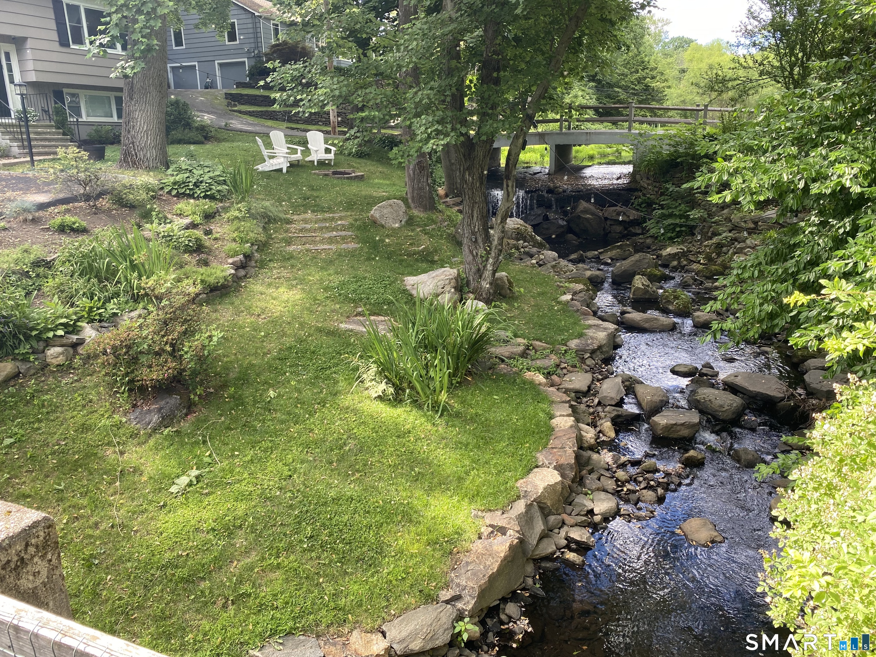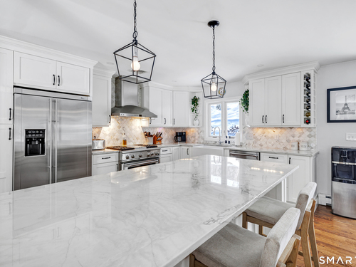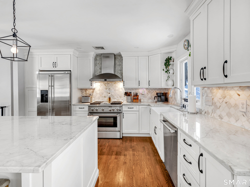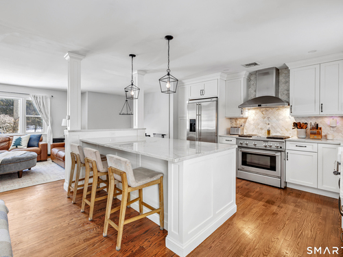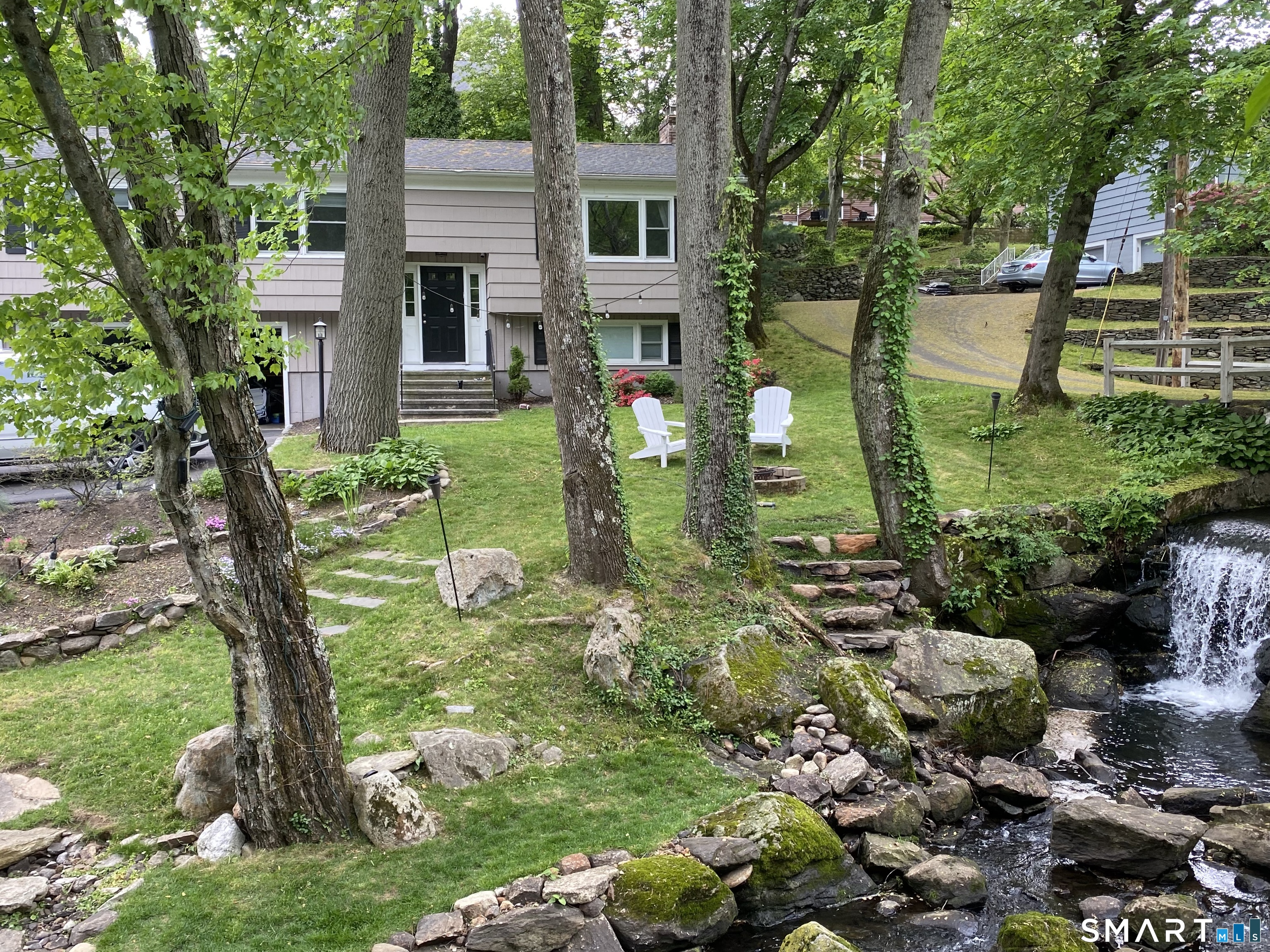 Private, peaceful, and perfectly located, this University-area home offers a serene natural setting just minutes from Fairfield's town center, train, and beaches. Set in Fairfield's highly sought-after University area, this beautifully updated 3-bedroom, 2.5-bath home offers two levels of living with a cozy fireplace and a rare connection to nature. Surrounded by mature trees, stone walls, a tranquil creek, and a waterfall, the setting feels private yet convenient. The main level features a light-filled open floor plan anchored by a stunning kitchen with quartzite island, Calacatta marble backsplash, farmhouse sink, custom built-in wine rack, and new dishwasher. Newly sanded and stained hardwood floors flow through the main living areas and bedrooms. Large windows frame views of natural stone and landscaping, with the soothing sound of water just outside. Step from the kitchen to a private backyard and deck with custom pergola-ideal for outdoor dining or relaxing. The finished lower level offers flexible living space with new premium Italian luxury vinyl flooring and a fireplace, perfect for a family room, rec room, or home office. Custom laundry cabinetry with butcher block counter and a new smart washer and dryer complete the lower level. Major improvements include a new high-efficiency boiler, water tank, updated piping, zone system, and upgraded 200-amp electrical with generator hookup. Exterior upgrades include a newly paved driveway with Belgian block, freshly painted..