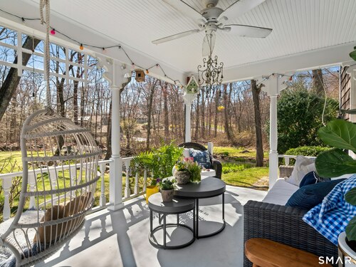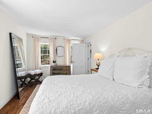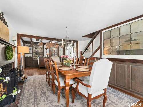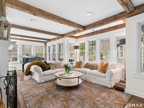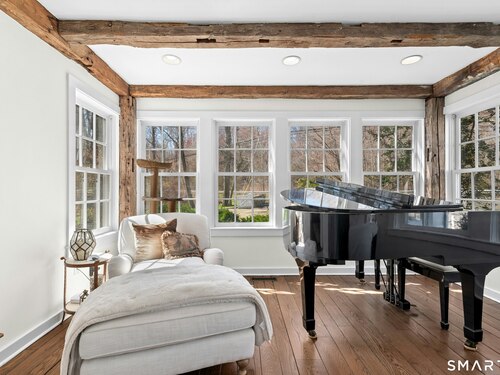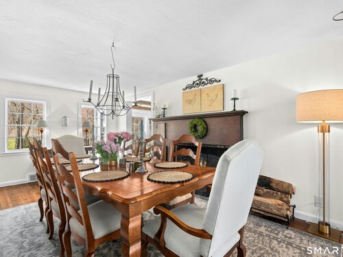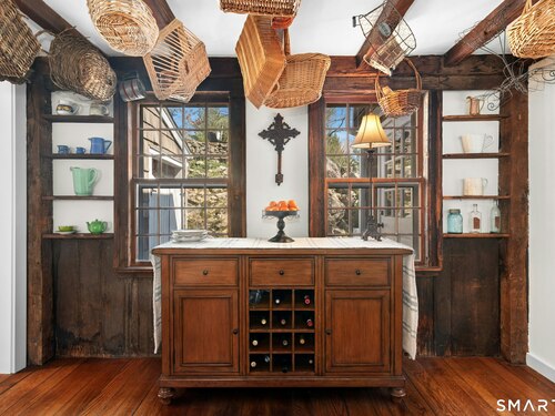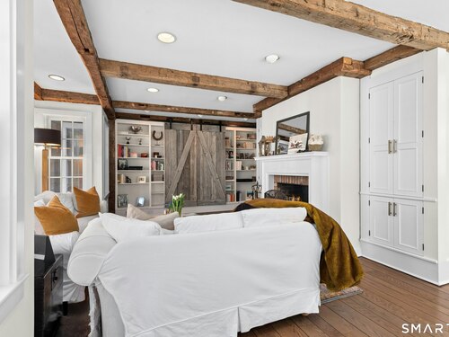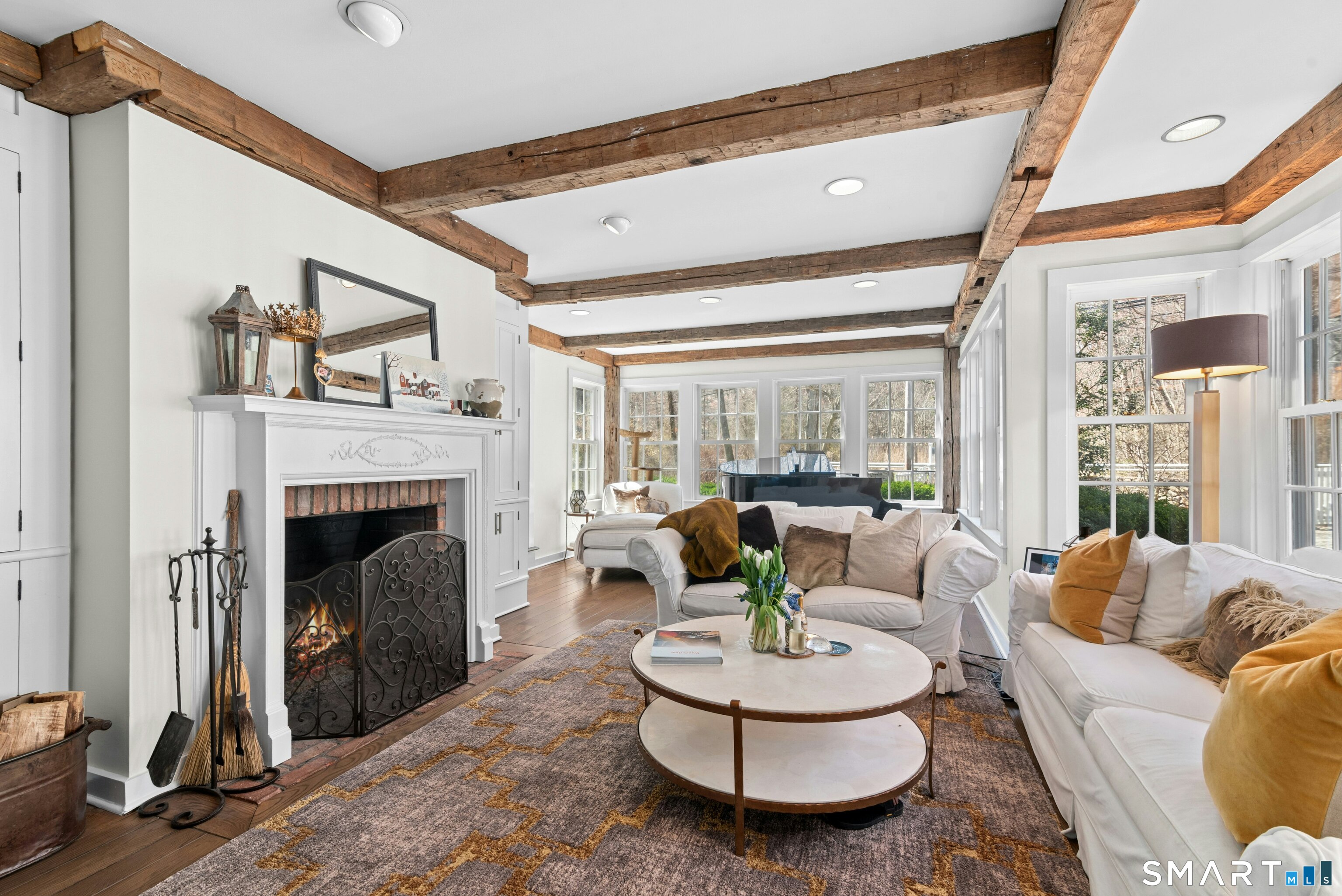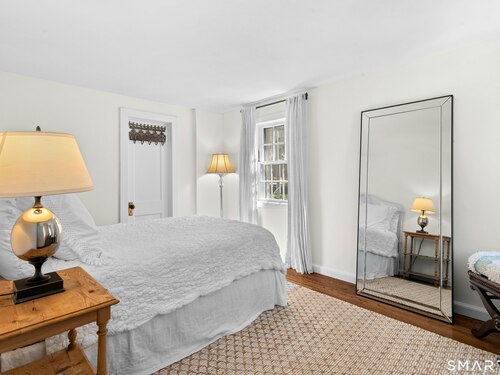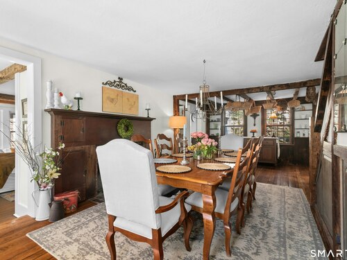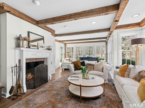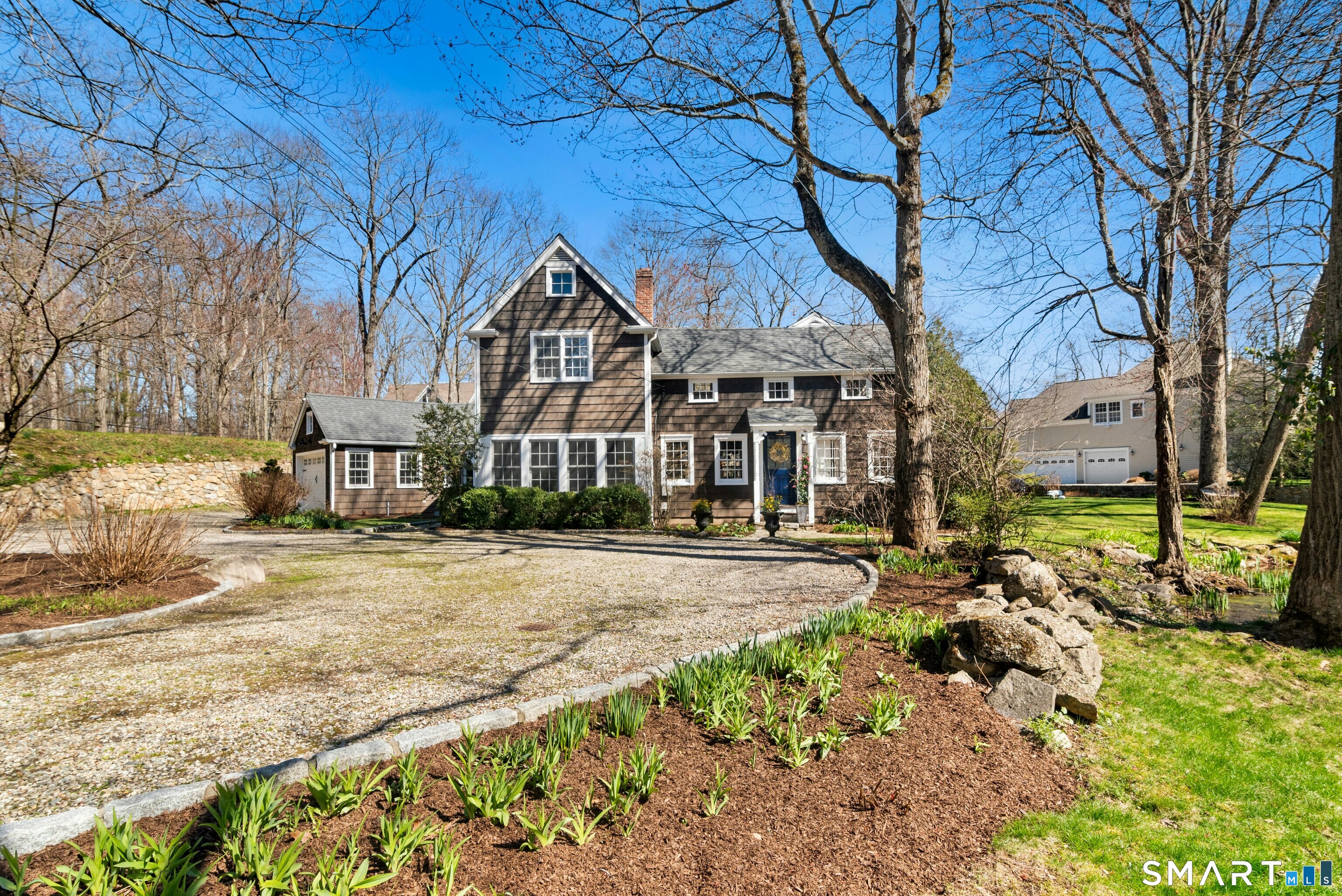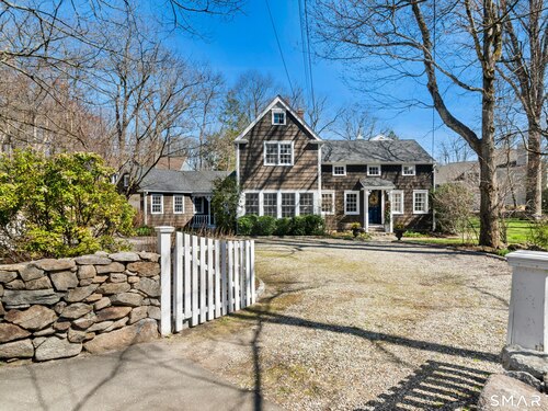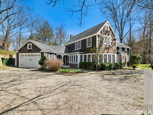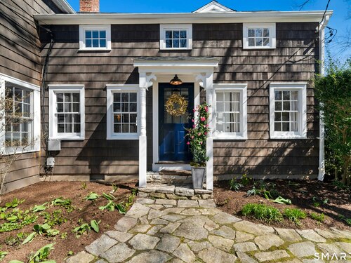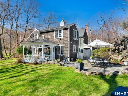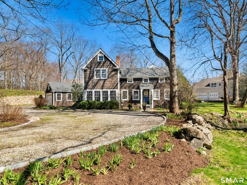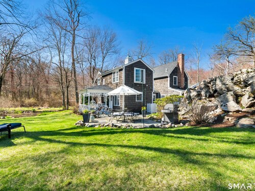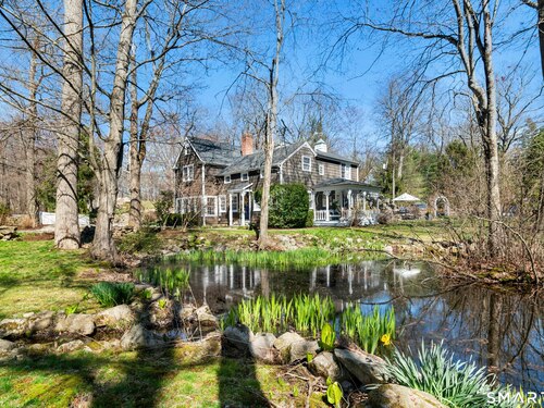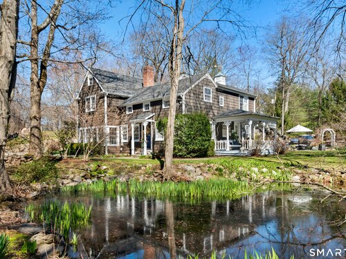 Filled with natural light from large, plentiful windows and featuring two fireplaces, this lovely 3-5 bedroom, 2-bath home blends authentic New England character with thoughtful updates in a peaceful pondside setting close to town and schools. Originally an 1800s home that was carefully deconstructed and rebuilt at its current location in 1952, the property retains beautiful antique details, including historic wood paneling and charming architectural elements. Inviting living spaces include a spacious family room addition and a second-floor sitting area. Flexible bonus rooms offer options for a nursery, home office, guest or au pair space, or potential primary-suite expansion. Main-level laundry, mudroom/office, attached garage, and central A/C provide everyday convenience. Set on a serene 0.80-acre lot, the property features multiple outdoor living areas for entertaining and relaxing, including a welcoming front porch, a firepit gathering space, and seating areas overlooking the picturesque pond and seasonal brook. Spring brings blooming daffodils and irises along the water's edge, enhancing the natural beauty of the setting. Backing to a private lane with a warm neighborhood feel and located close to Wilton's town center, schools, and the Norwalk River walking trail, this home offers a rare combination of historic charm, natural beauty, and convenience.