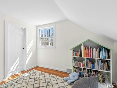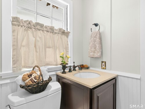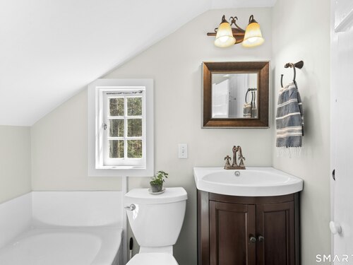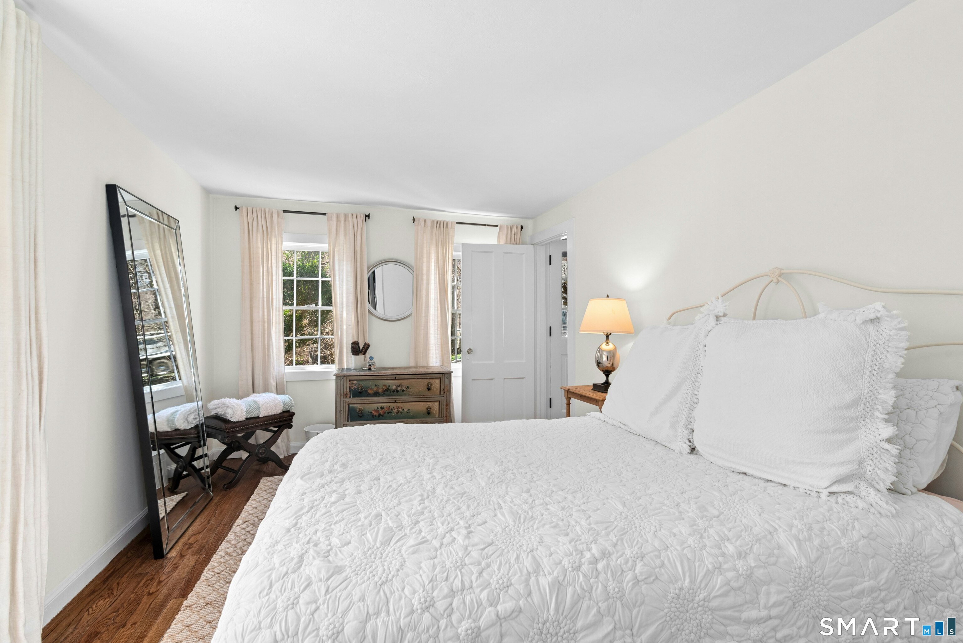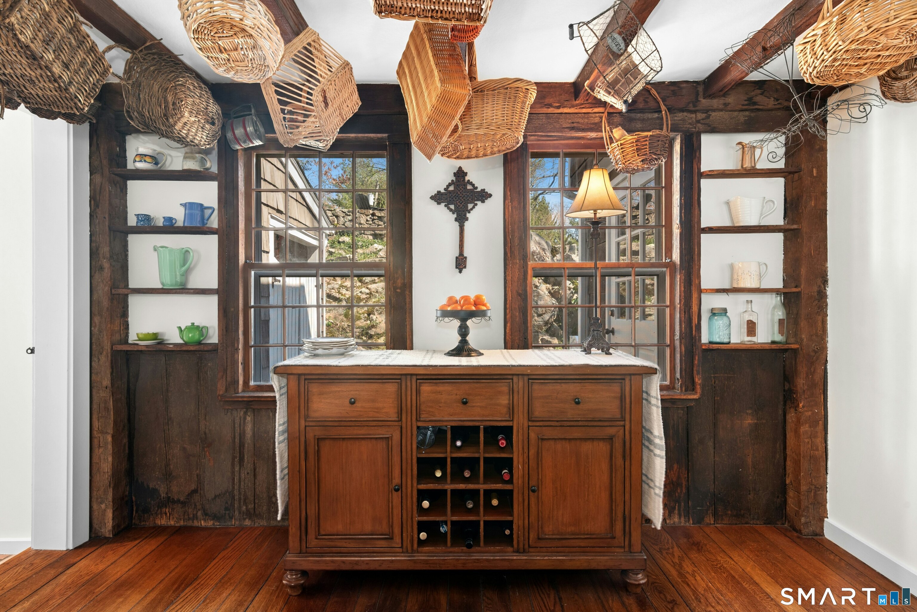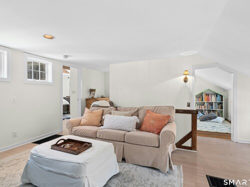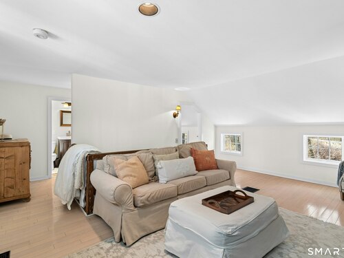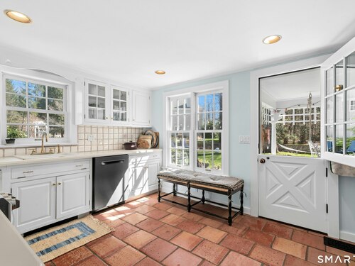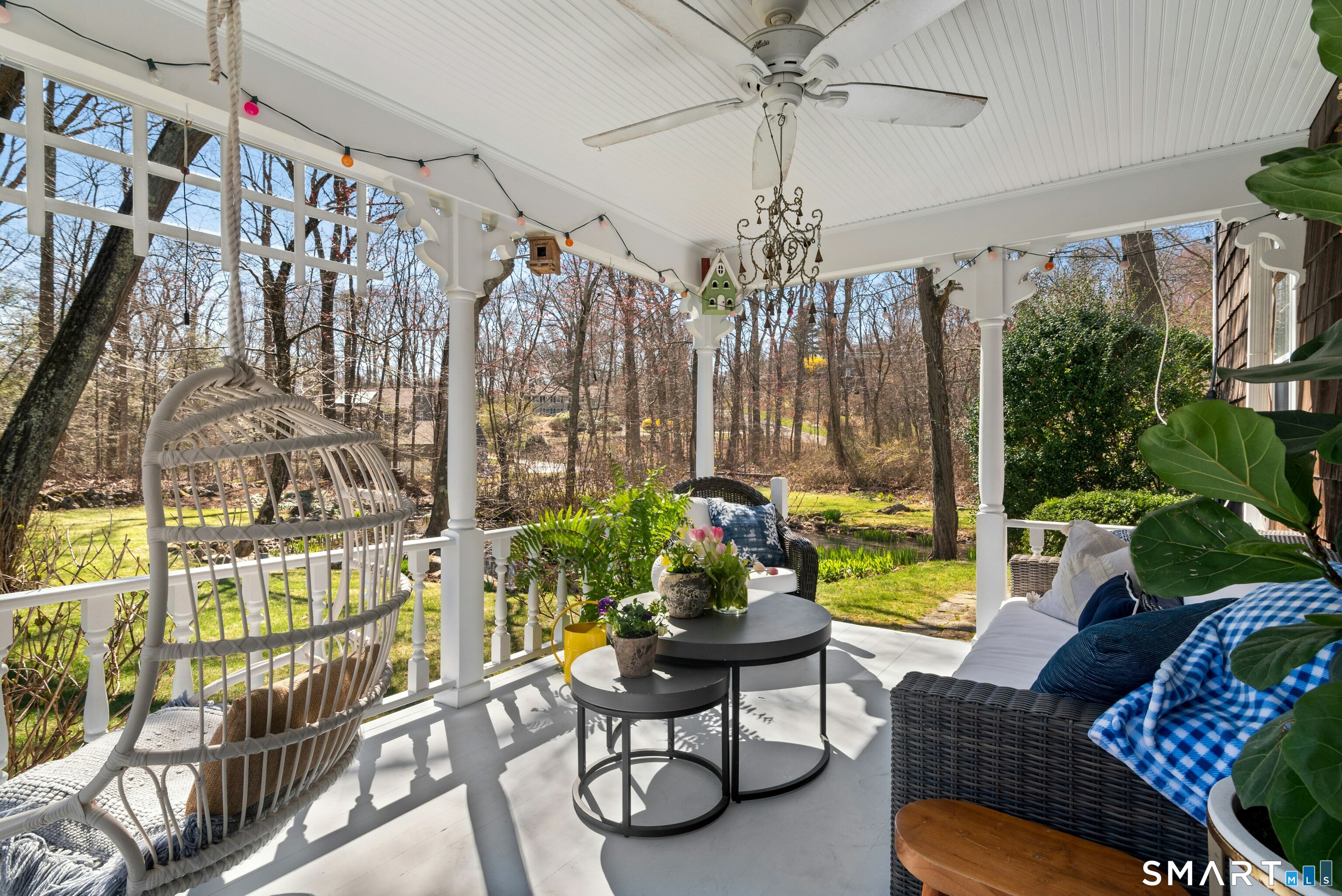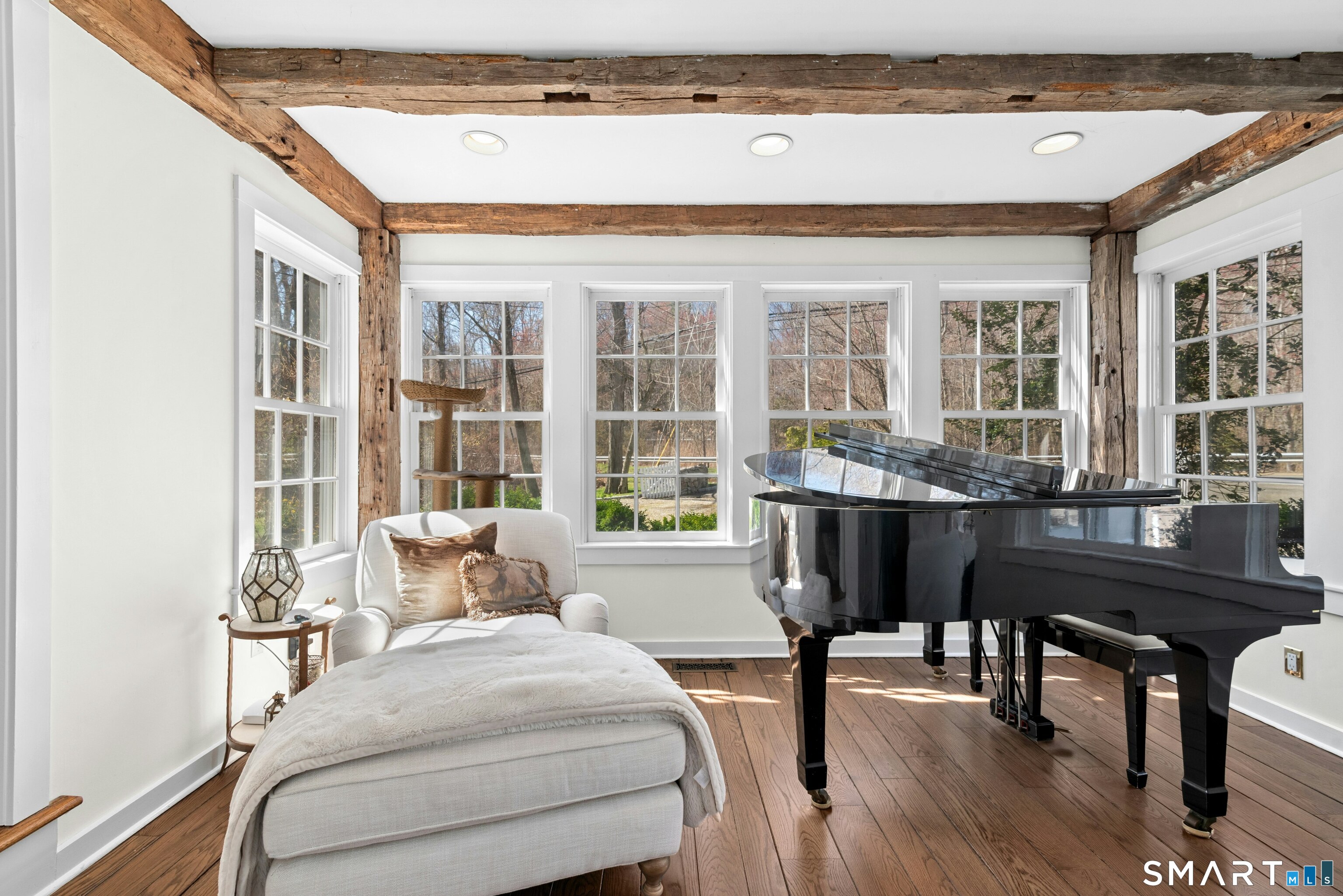 Filled with natural light from large, plentiful windows and featuring two fireplaces, this lovely 3-5 bedroom, 2-bath home blends authentic New England character with thoughtful updates in a peaceful pondside setting close to town and schools. Originally an 1800s home that was carefully deconstructed and rebuilt at its current location in 1952, the property retains beautiful antique details, including historic wood paneling and charming architectural elements. Inviting living spaces include a spacious family room addition and a second-floor sitting area. Flexible bonus rooms offer options for a nursery, home office, guest or au pair space, or potential primary-suite expansion. Main-level laundry, mudroom/office, attached garage, and central A/C provide everyday convenience. Set on a serene 0.80-acre lot, the property features multiple outdoor living areas for entertaining and relaxing, including a welcoming front porch, a firepit gathering space, and seating areas overlooking the picturesque pond and seasonal brook. Spring brings blooming daffodils and irises along the water's edge, enhancing the natural beauty of the setting. Backing to a private lane with a warm neighborhood feel and located close to Wilton's town center, schools, and the Norwalk River walking trail, this home offers a rare combination of historic charm, natural beauty, and convenience.