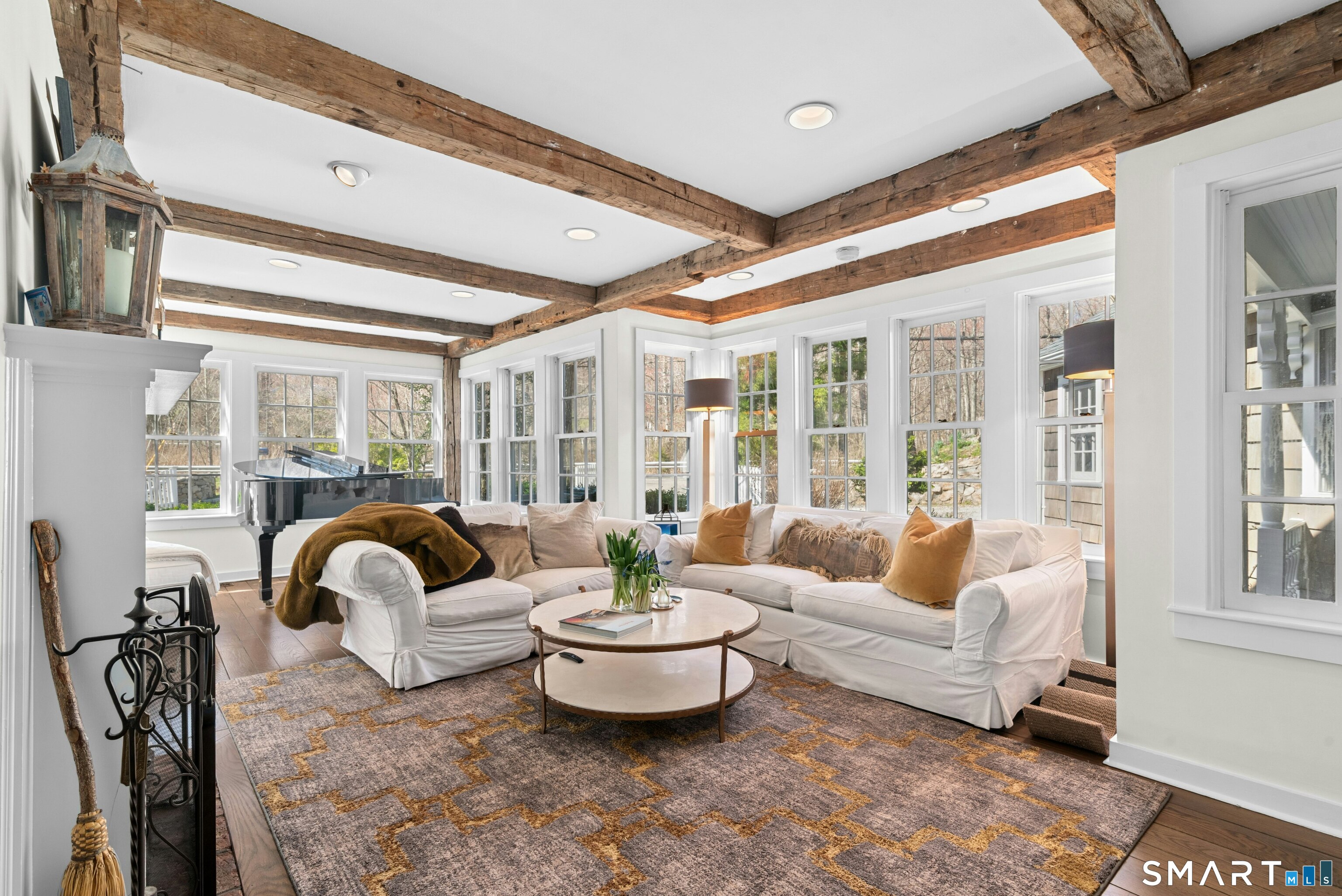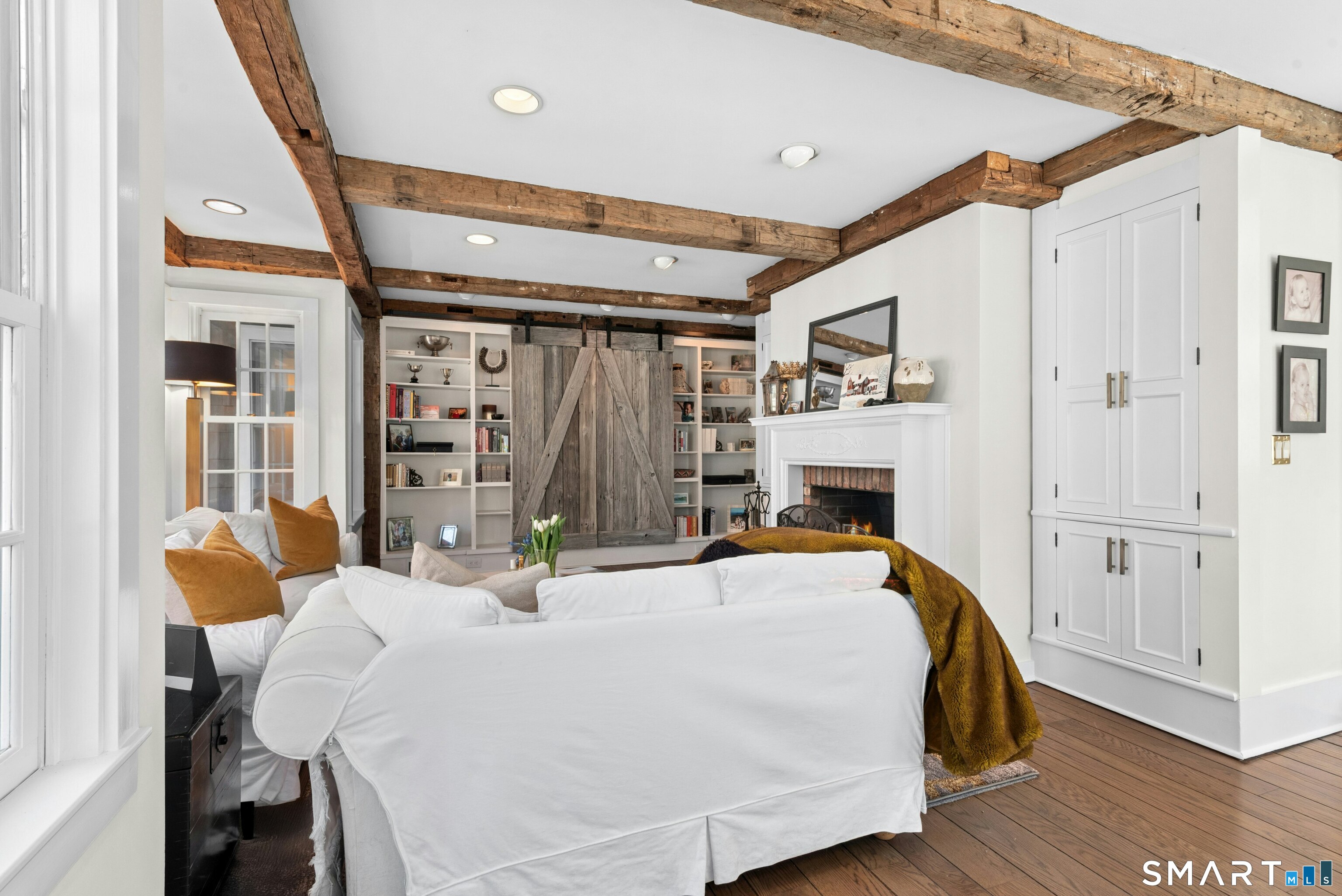Living Room (Main Level)Beams, Book Shelves, Built-Ins, Fireplace, Hardwood Floor