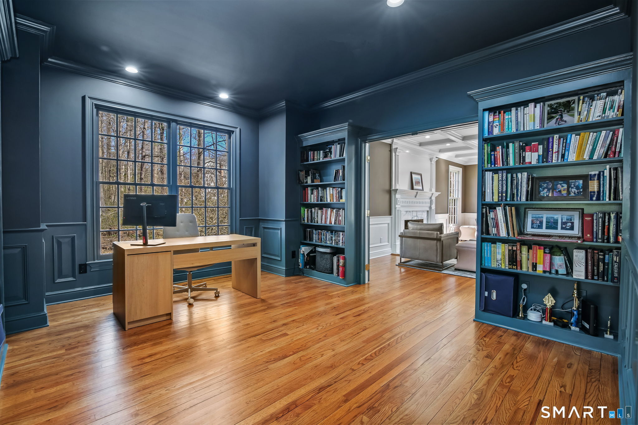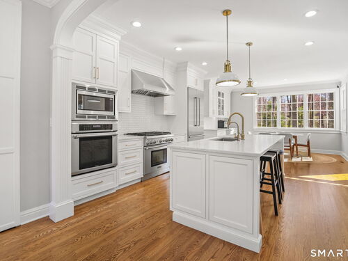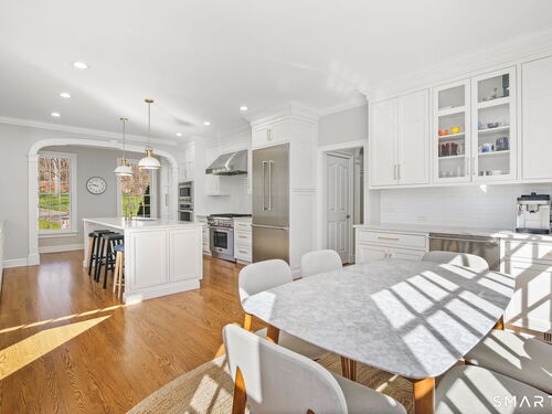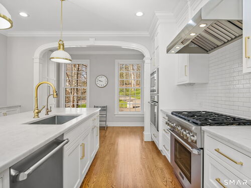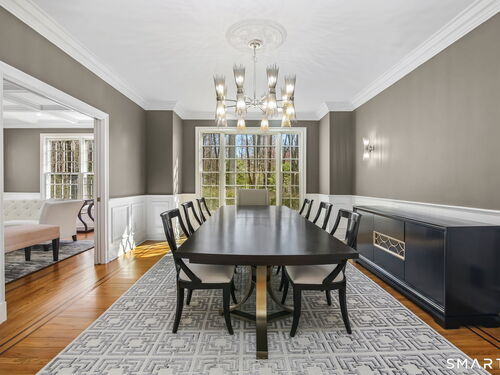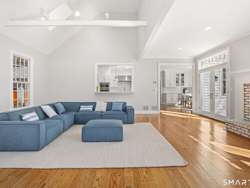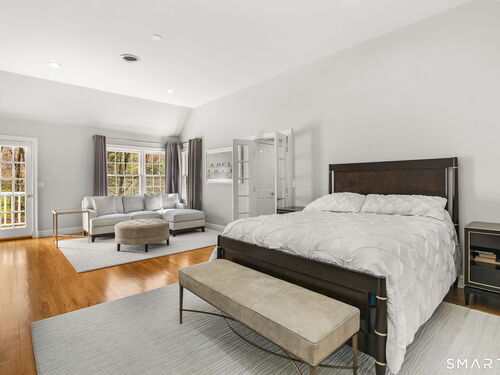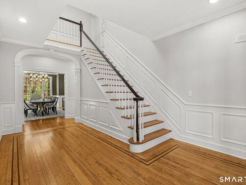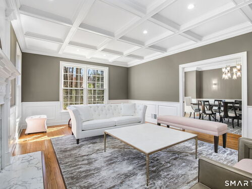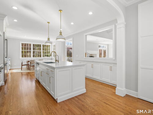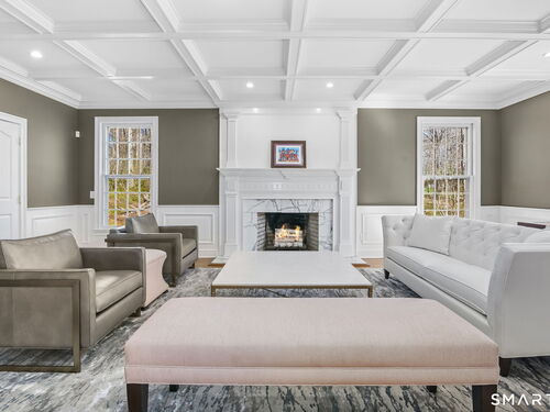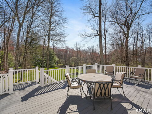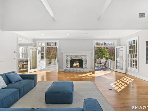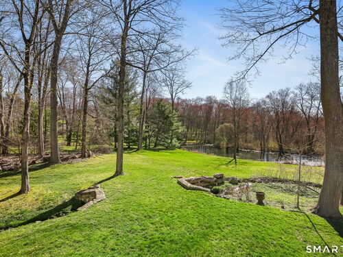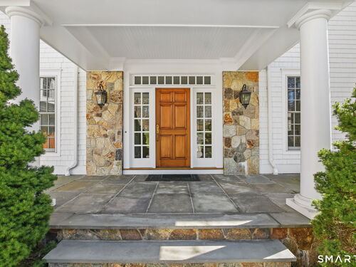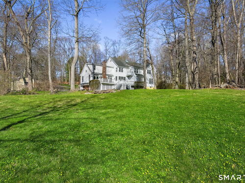 Pristine move in ready five-bedroom Colonial residence situated on 2.9 acres of parklike grounds. Spanning over 6,000 square feet, this home features an open floor plan with formal rooms, elegant moldings, graceful archways and French doors. The interior includes a gourmet kitchen with high-end appliances, a marble center seating island, breakfast room with coffee bar, all which open into a family room with vaulted ceilings and a fireplace. Additional highlights include a library/office with built-ins, and a primary suite featuring a private balcony overlooking the pond, a sitting area, and a marble bathroom. The property also includes a separate-entry apt. equipped with a kitchenette, a large living and dining area, a bedroom, and a full bath. The home is finished with hardwood flooring, custom millwork, and three fireplaces. Exterior amenities include a spacious deck and room for 5 cars, a heated main level 3 car garage, large mudroom, and an additional two-car garage on the lower level. The residence is conveniently located near local schools, the village center, Metro-North New Canaan station, The Field Club, and the Merritt Parkway.