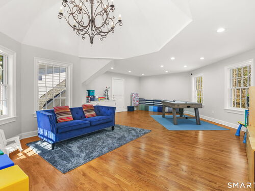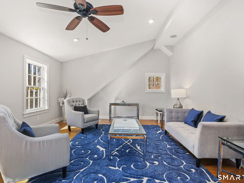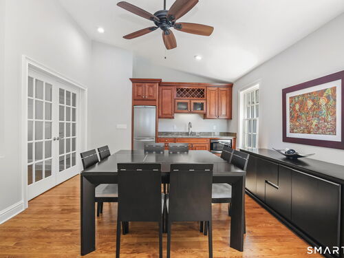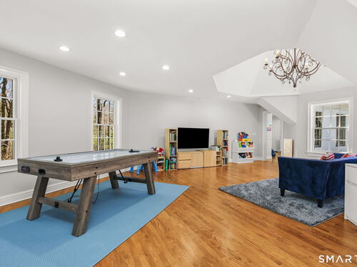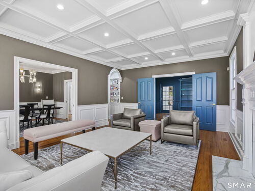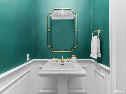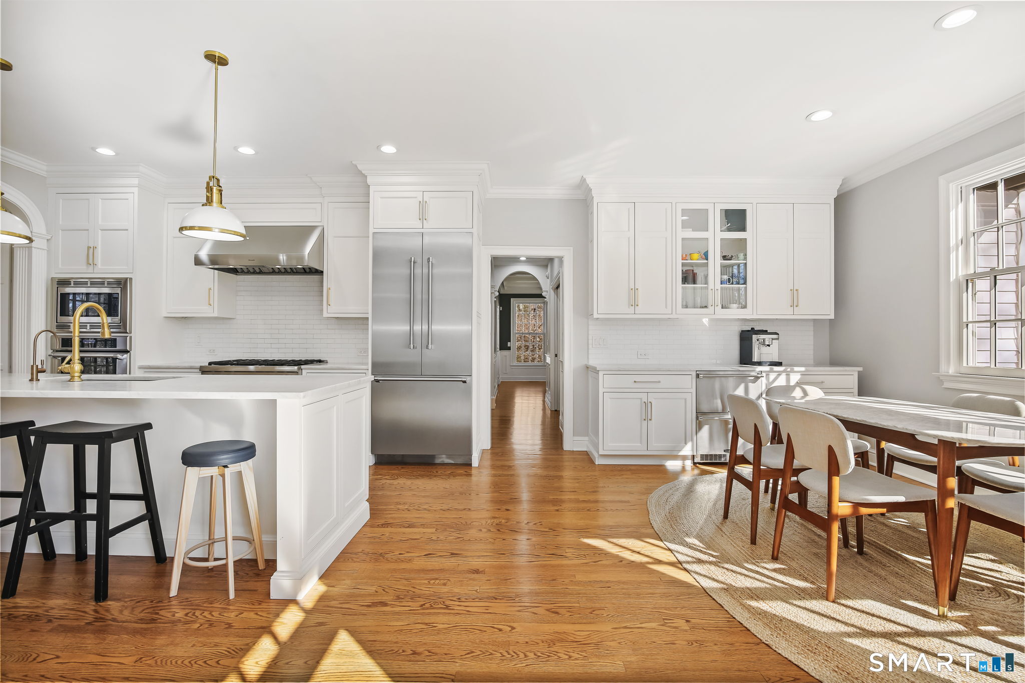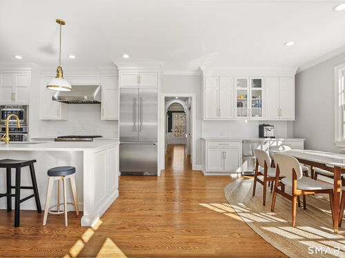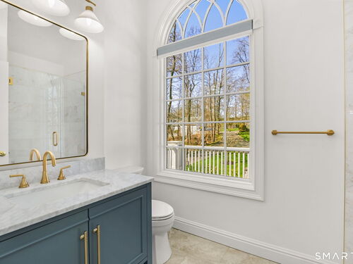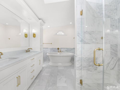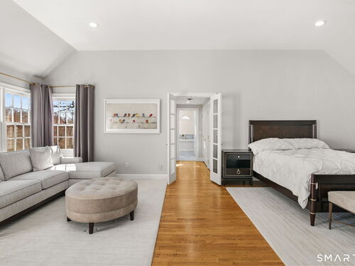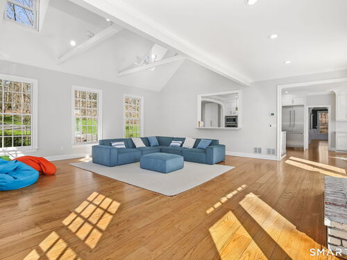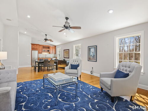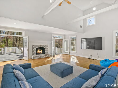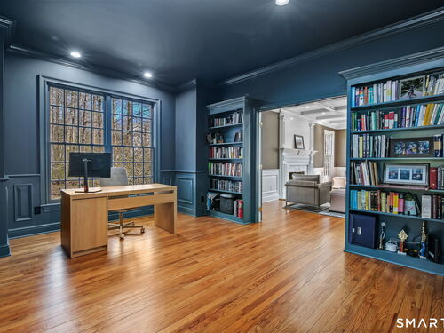 Pristine move in ready five-bedroom Colonial residence situated on 2.9 acres of parklike grounds. Spanning over 6,000 square feet, this home features an open floor plan with formal rooms, elegant moldings, graceful archways and French doors. The interior includes a gourmet kitchen with high-end appliances, a marble center seating island, breakfast room with coffee bar, all which open into a family room with vaulted ceilings and a fireplace. Additional highlights include a library/office with built-ins, and a primary suite featuring a private balcony overlooking the pond, a sitting area, and a marble bathroom. The property also includes a separate-entry apt. equipped with a kitchenette, a large living and dining area, a bedroom, and a full bath. The home is finished with hardwood flooring, custom millwork, and three fireplaces. Exterior amenities include a spacious deck and room for 5 cars, a heated main level 3 car garage, large mudroom, and an additional two-car garage on the lower level. The residence is conveniently located near local schools, the village center, Metro-North New Canaan station, The Field Club, and the Merritt Parkway.