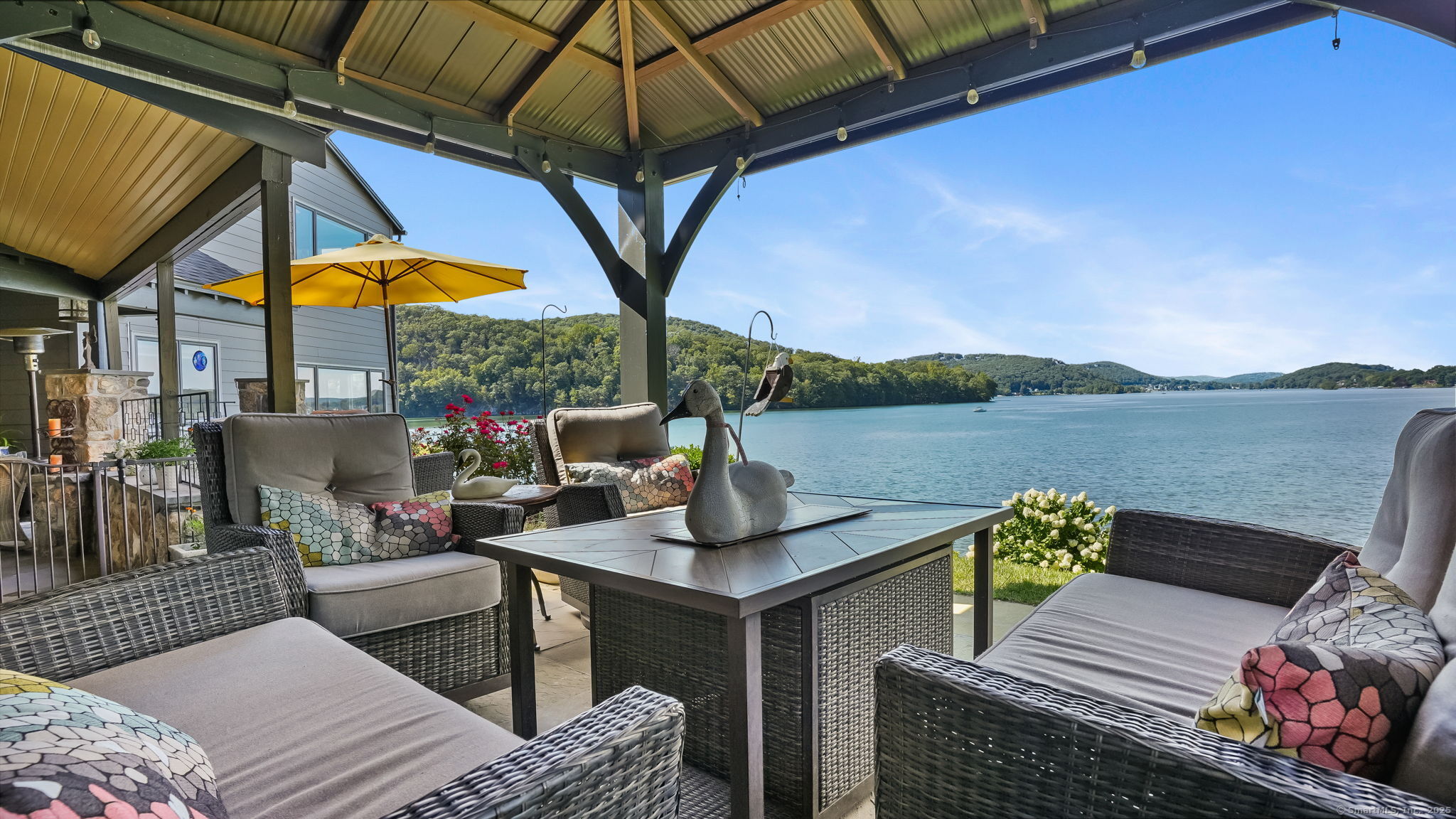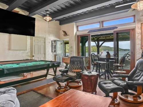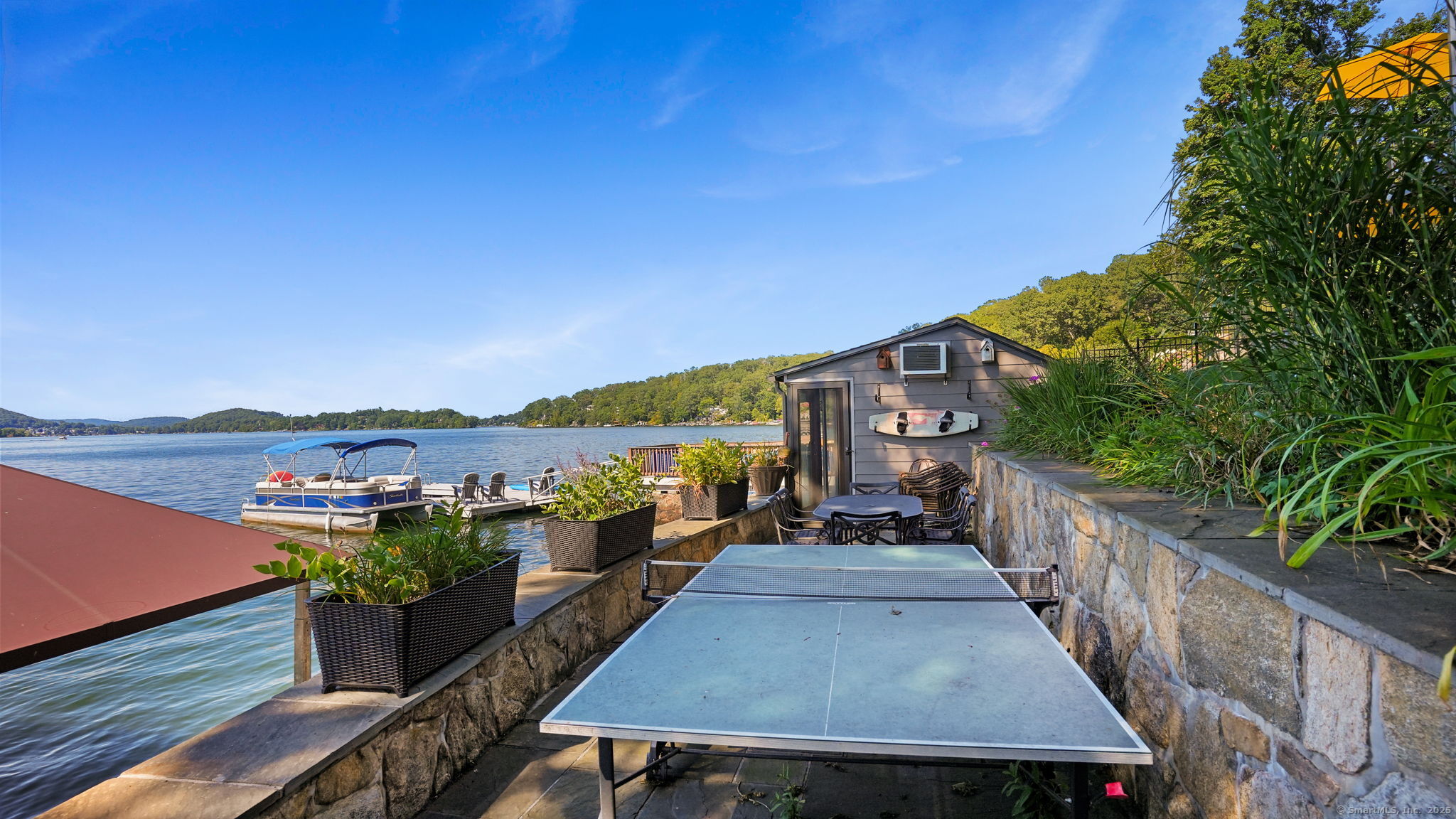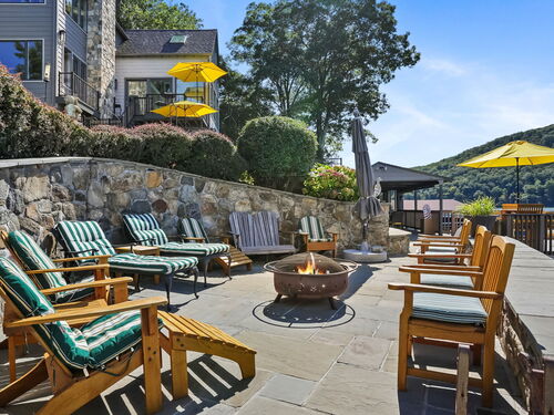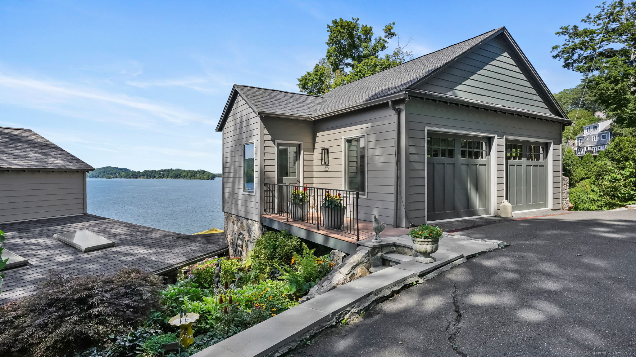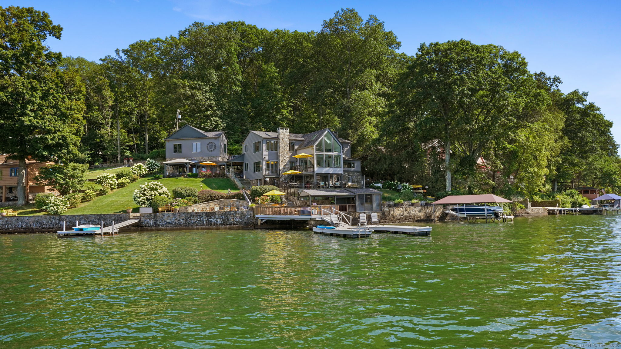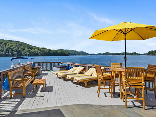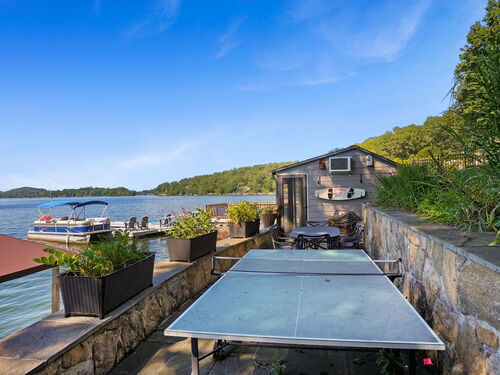 Imagine waking up to the best view of beautiful Candlewood Lake. This exceptional property offers 200 ft of direct waterfront, just steps from the water's edge. Enjoy stunning western sunsets with a panoramic view of scenic Bear Mountain Park. Endless outdoor entertainment awaits with a meticulously designed, multi-tiered landscape featuring a rare-grandfathered in waterfront cabana bar, several patios, a garden veranda, game room gazebo and a regulation-size shuffleboard court. The newly added two-story sunroom with a loft offers year-round, sweeping views that will take your breath away. The two-car garage includes a full-sized elevator, providing convenient access to the main level's Garden Veranda. A full bath and guest sleeping quarters on the main level ensure easy accessibility for all guests. The garage is also home to a modern game room with additional sleeping space for weekend visitors, complete with a slate patio and a cozy fire pit. The walk-out basement features a brand-new sauna, a second kitchen, and a guest suite, offering privacy and access to the second-tier patio. Five-zone heating & cooling, as well as a new 26 KW whole-home generator, maintenance-free Hardy Board siding and a brand-new roof. A full irrigation system ensures the property stays lush and green year-round. For boating enthusiasts, the property includes a fully covered hydraulic boat lift and two additional docks that can accommodate up to five vessels. It's amazing!