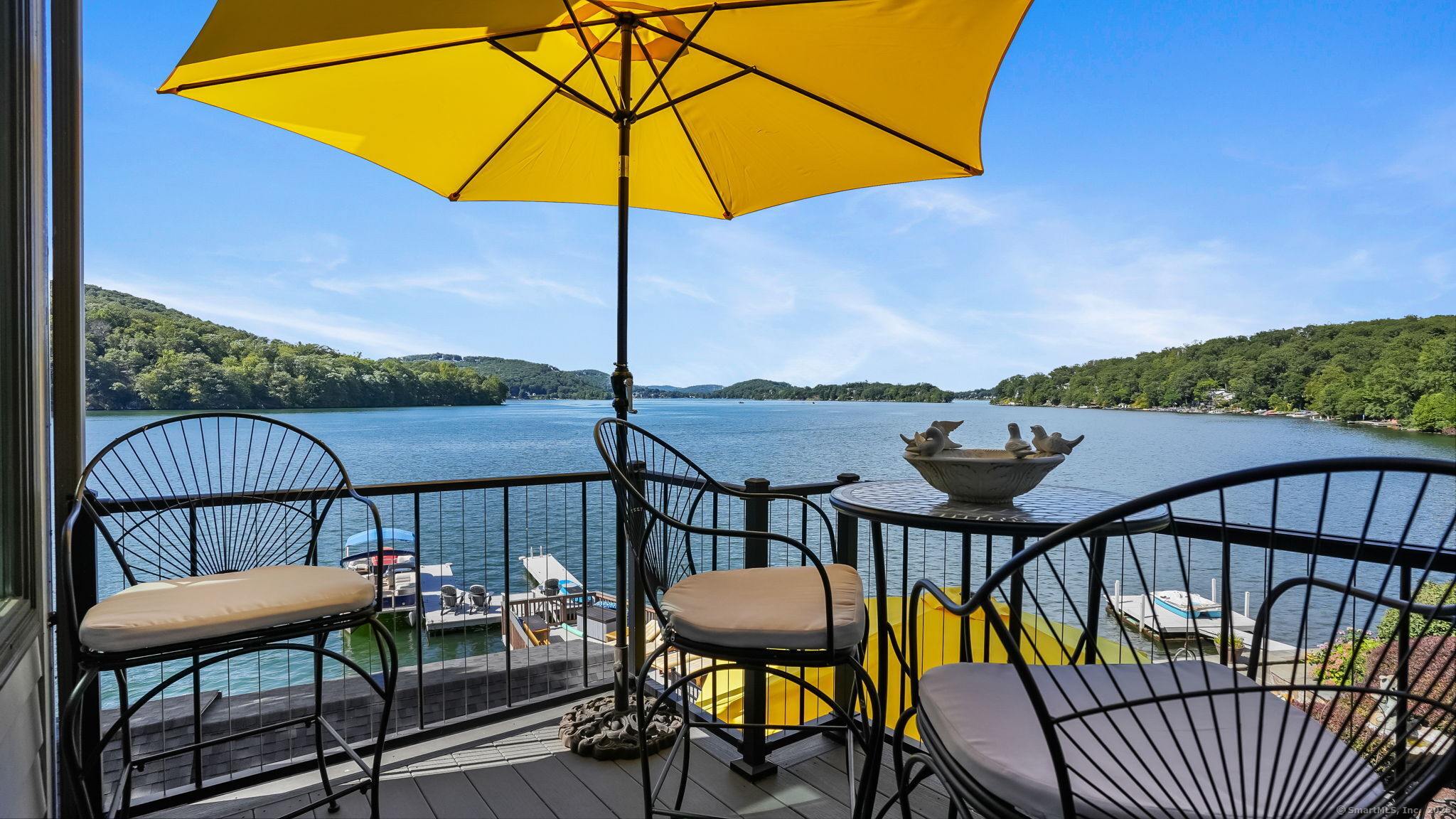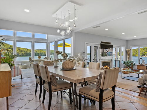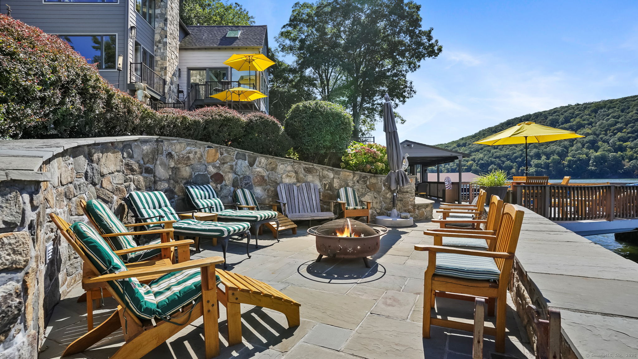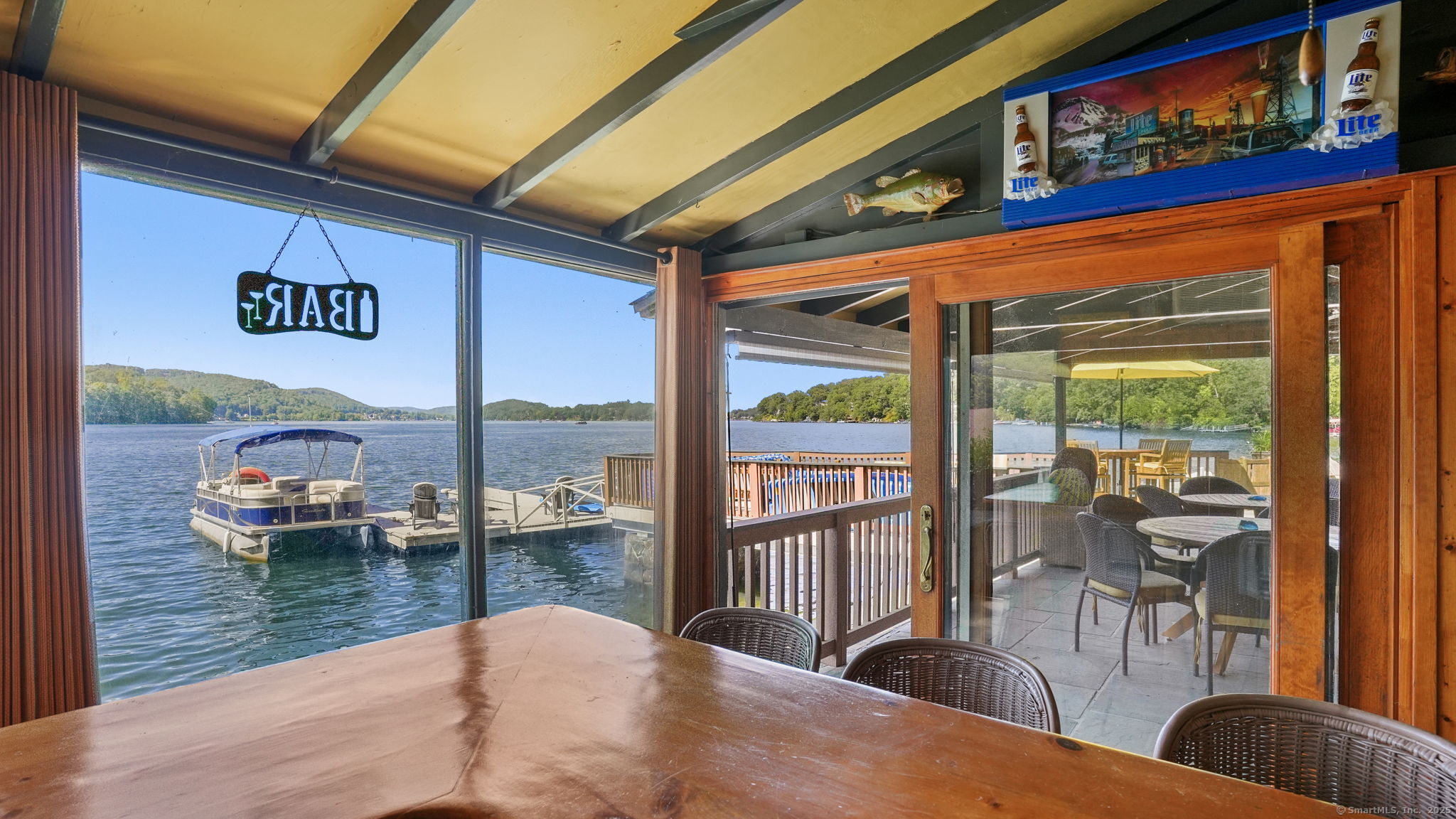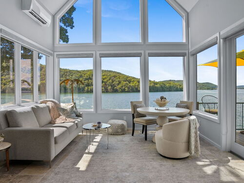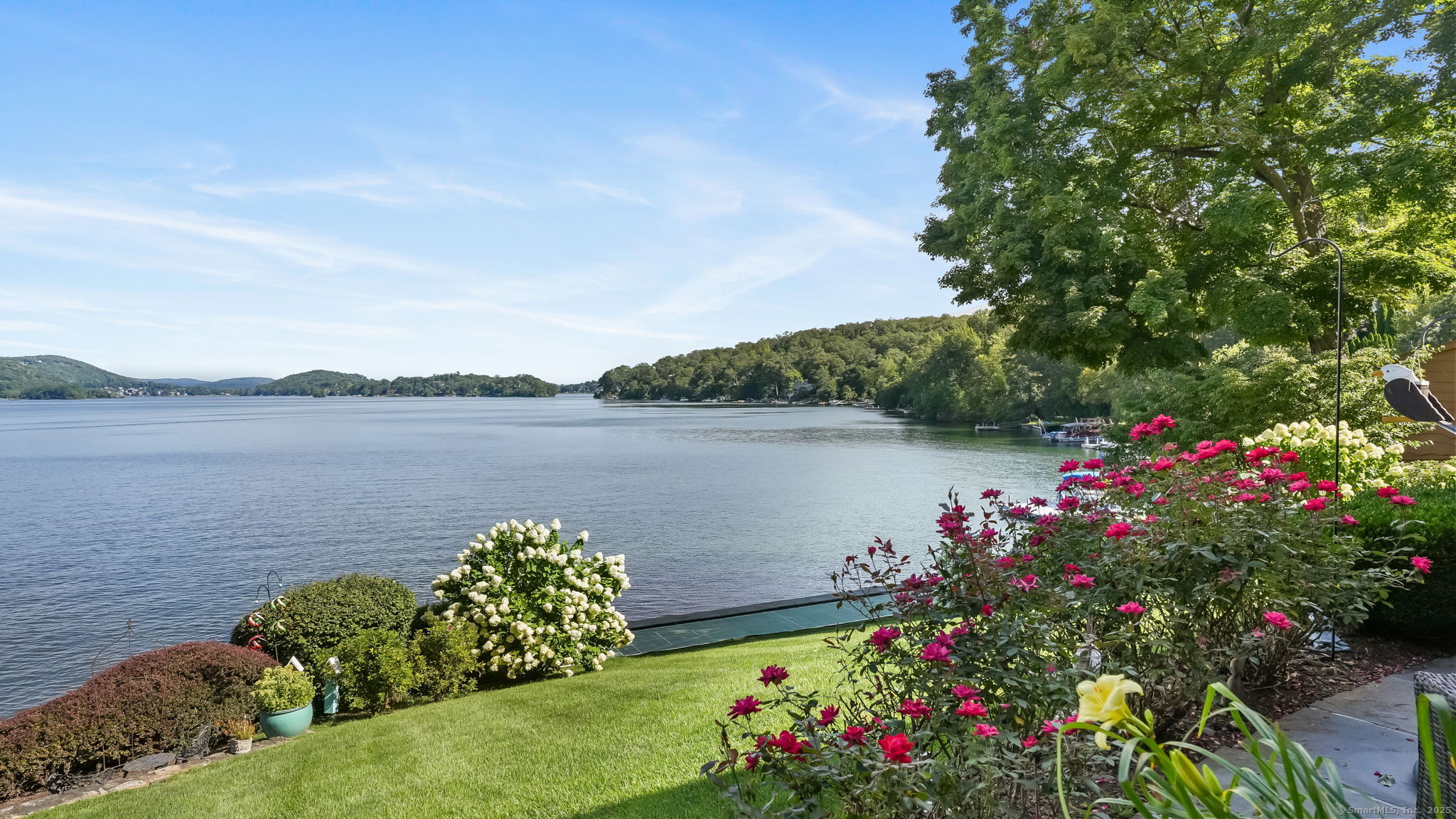 Imagine waking up to the best view of beautiful Candlewood Lake. This exceptional property offers 200 ft of direct waterfront, just steps from the water's edge. Enjoy stunning western sunsets with a panoramic view of scenic Bear Mountain Park. Endless outdoor entertainment awaits with a meticulously designed, multi-tiered landscape featuring a rare-grandfathered in waterfront cabana bar, several patios, a garden veranda, game room gazebo and a regulation-size shuffleboard court. The newly added two-story sunroom with a loft offers year-round, sweeping views that will take your breath away. The two-car garage includes a full-sized elevator, providing convenient access to the main level's Garden Veranda. A full bath and guest sleeping quarters on the main level ensure easy accessibility for all guests. The garage is also home to a modern game room with additional sleeping space for weekend visitors, complete with a slate patio and a cozy fire pit. The walk-out basement features a brand-new sauna, a second kitchen, and a guest suite, offering privacy and access to the second-tier patio. Five-zone heating & cooling, as well as a new 26 KW whole-home generator, maintenance-free Hardy Board siding and a brand-new roof. A full irrigation system ensures the property stays lush and green year-round. For boating enthusiasts, the property includes a fully covered hydraulic boat lift and two additional docks that can accommodate up to five vessels. It's amazing!