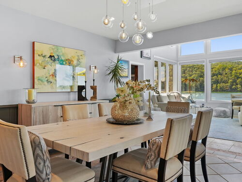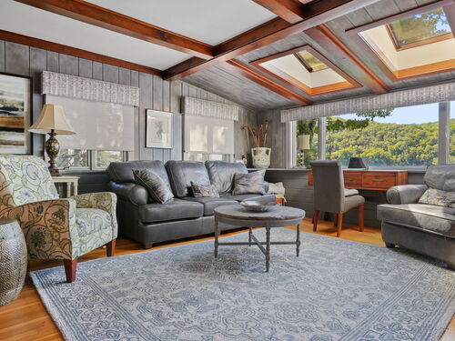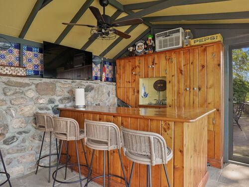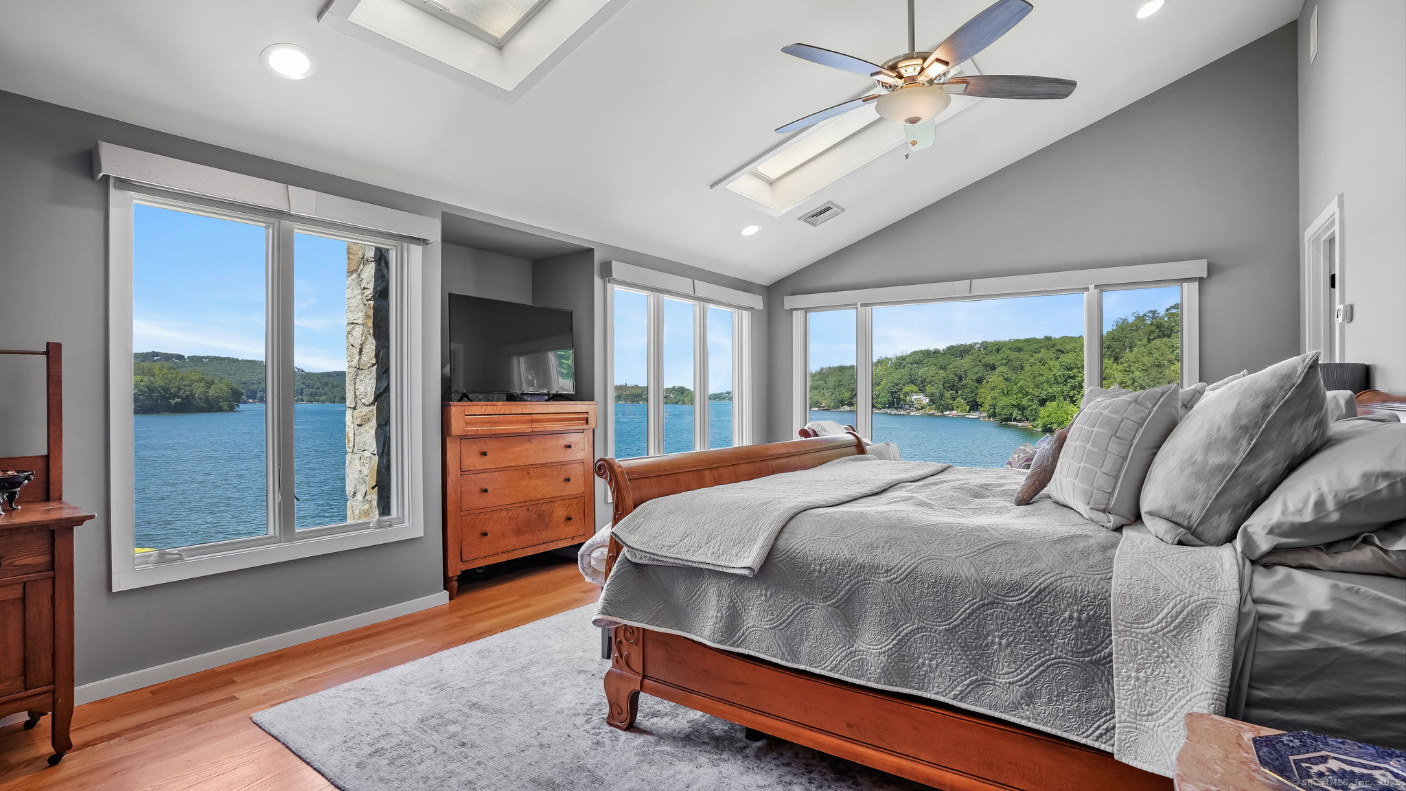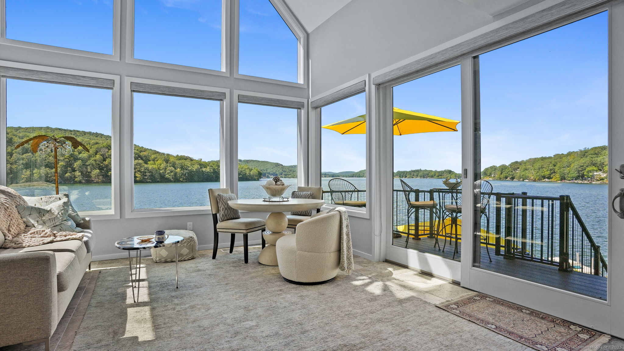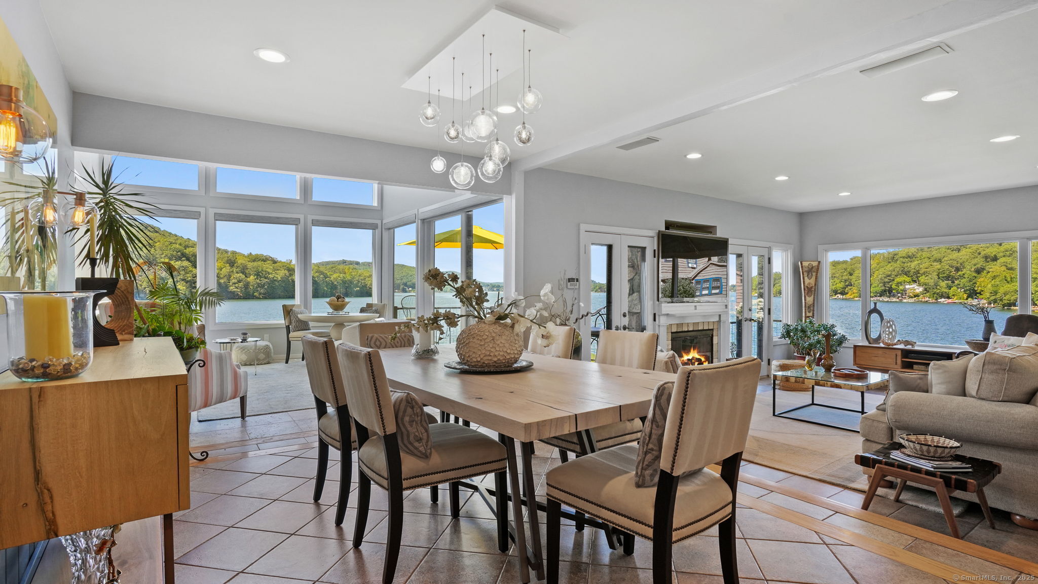 Imagine waking up to the best view of beautiful Candlewood Lake. This exceptional property offers 200 ft of direct waterfront, just steps from the water's edge. Enjoy stunning western sunsets with a panoramic view of scenic Bear Mountain Park. Endless outdoor entertainment awaits with a meticulously designed, multi-tiered landscape featuring a rare-grandfathered in waterfront cabana bar, several patios, a garden veranda, game room gazebo and a regulation-size shuffleboard court. The newly added two-story sunroom with a loft offers year-round, sweeping views that will take your breath away. The two-car garage includes a full-sized elevator, providing convenient access to the main level's Garden Veranda. A full bath and guest sleeping quarters on the main level ensure easy accessibility for all guests. The garage is also home to a modern game room with additional sleeping space for weekend visitors, complete with a slate patio and a cozy fire pit. The walk-out basement features a brand-new sauna, a second kitchen, and a guest suite, offering privacy and access to the second-tier patio. Five-zone heating & cooling, as well as a new 26 KW whole-home generator, maintenance-free Hardy Board siding and a brand-new roof. A full irrigation system ensures the property stays lush and green year-round. For boating enthusiasts, the property includes a fully covered hydraulic boat lift and two additional docks that can accommodate up to five vessels. It's amazing!