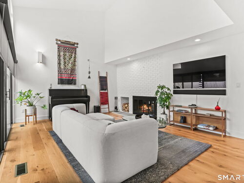 Vaulted Ceiling, Fireplace, Patio/Terrace, Sliders, Engineered Wood Floor, Wide Board Floor