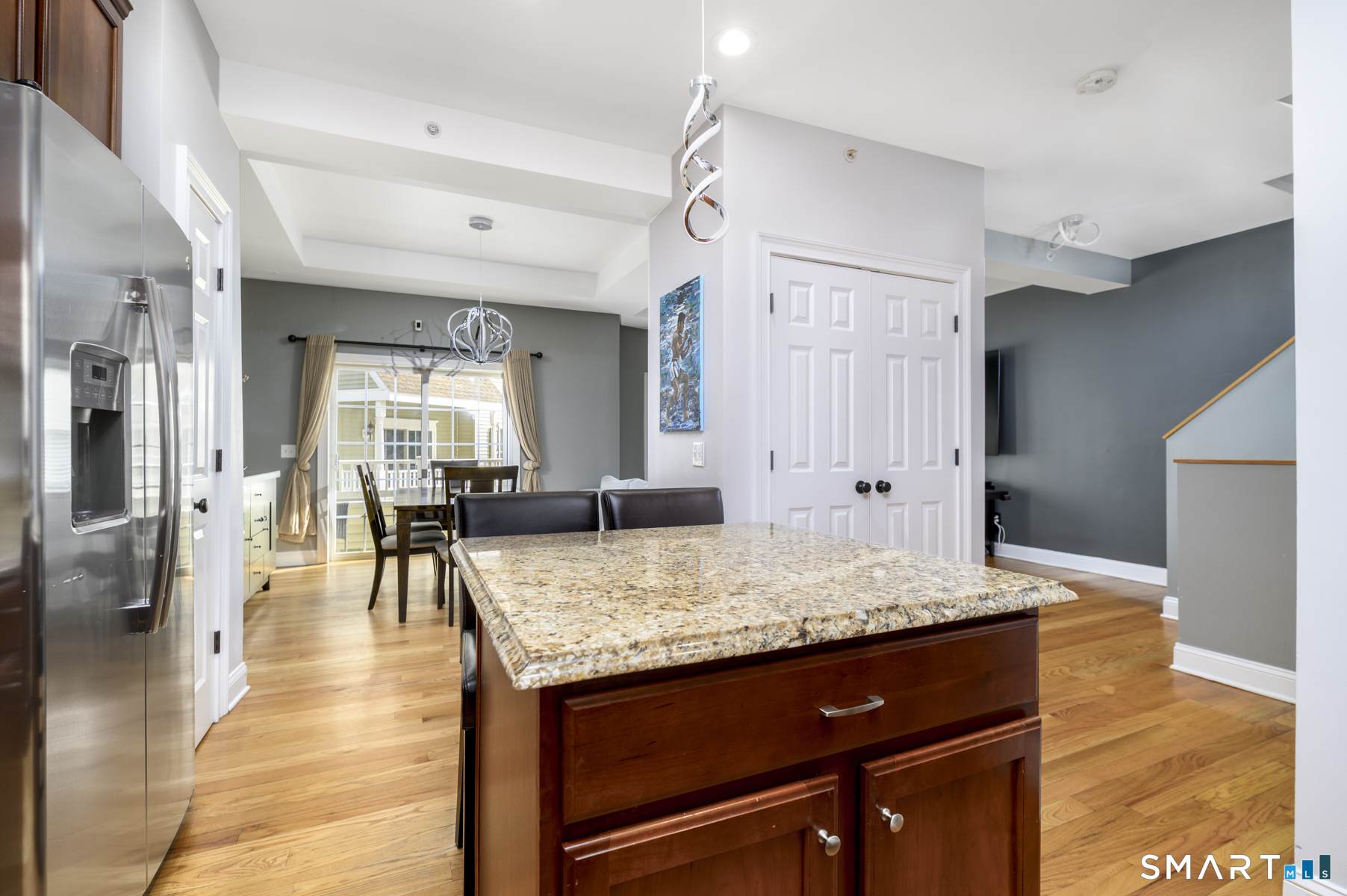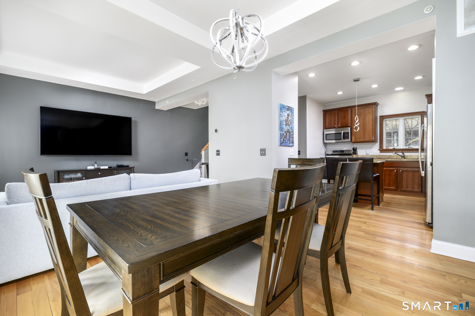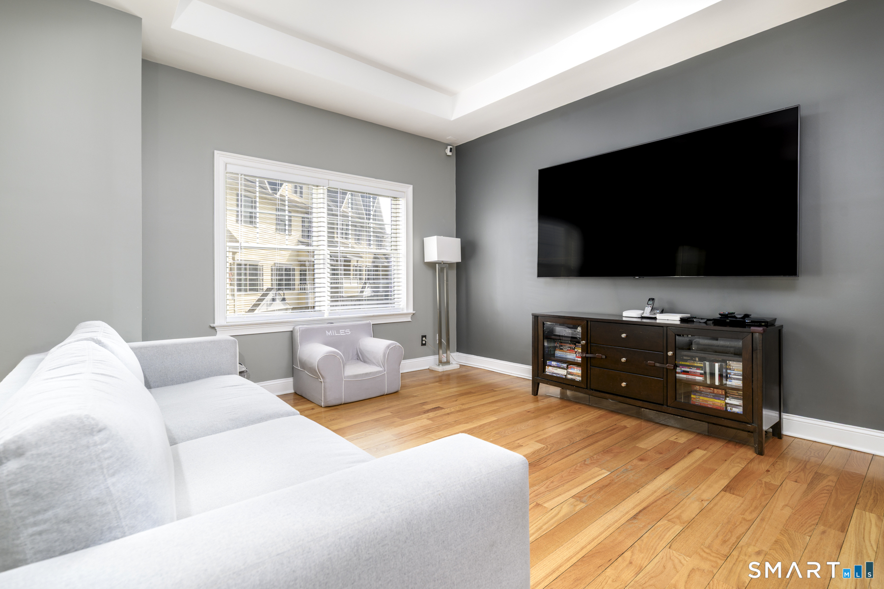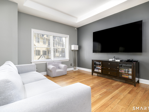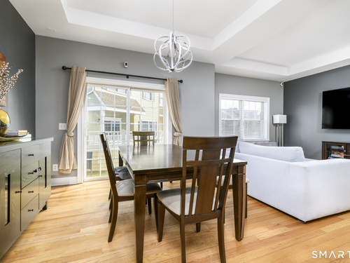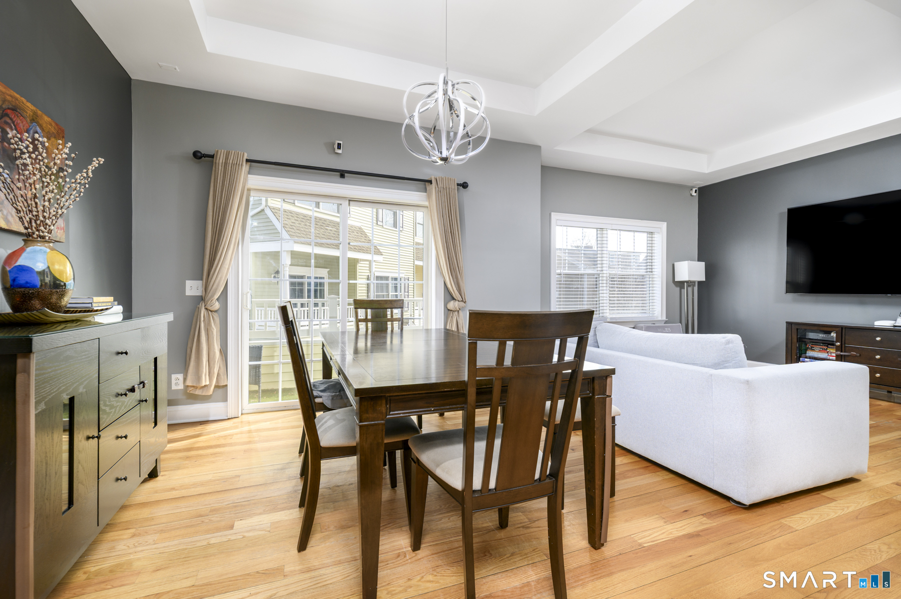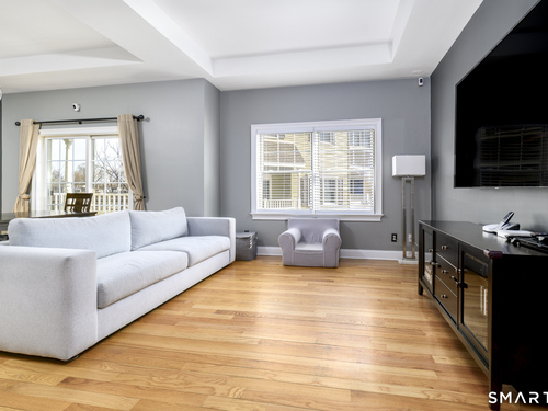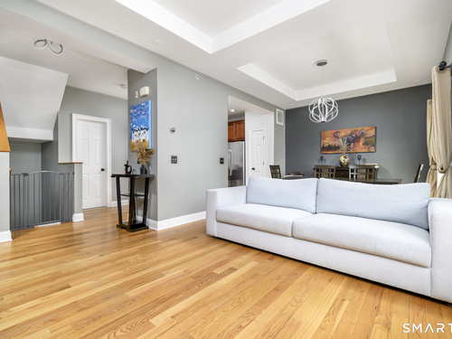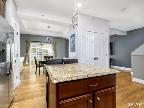 Freshly painted and move-in ready, this beautifully maintained 2-bedroom, 2.5-bath townhouse with a two-car garage offers the perfect blend of comfort, style, and convenience. The main level features gleaming hardwood floors and an inviting, open flow ideal for both everyday living and entertaining. The kitchen is equipped with a center island and seamlessly connects to the dining area, complete with sliders leading to a private balcony-perfect for enjoying fresh air. The living room is enhanced by elegant coffered ceilings, adding a touch of sophistication.Upstairs, the spacious primary suite includes a walk-in closet and a full bath with a shower stall. A second bedroom, full hallway bath with tub/shower combination, and convenient in-unit laundry complete the second level. The expansive third floor level functions as a private retreat with the scale and flexibility to serve as a guest suite, home office, or additional sleeping quarters. Its separation from the main living areas creates a quiet, versatile space well-suited for today's flexible living arrangements. Designed with efficiency in mind, the home features a 3-zone HVAC system for optimal comfort. Ideally located with easy access to I-95, the Merritt Parkway, and nearby train stations, this home is perfect for commuters and those seeking a central location close to everything.