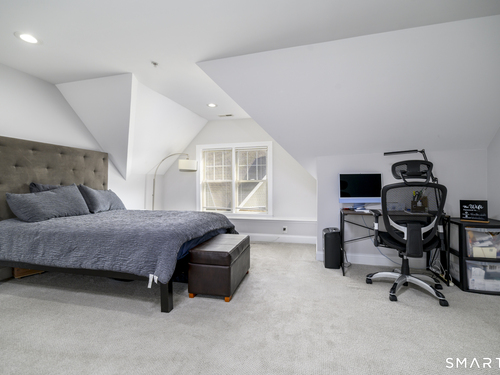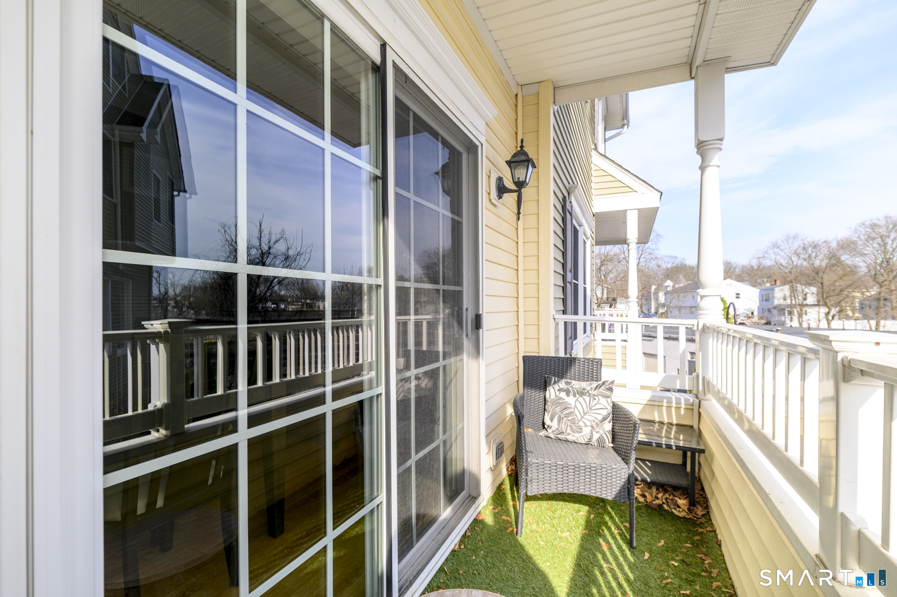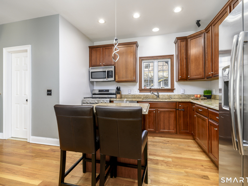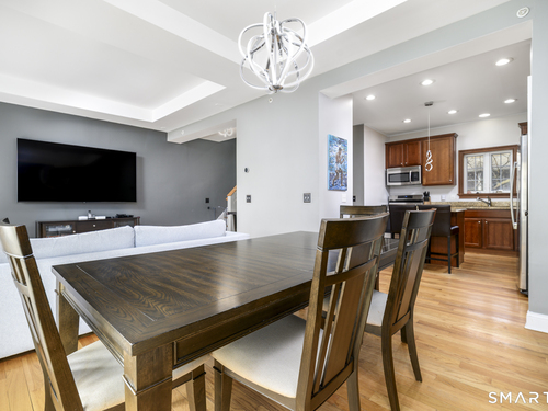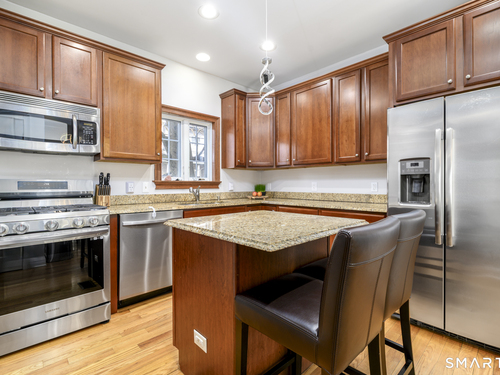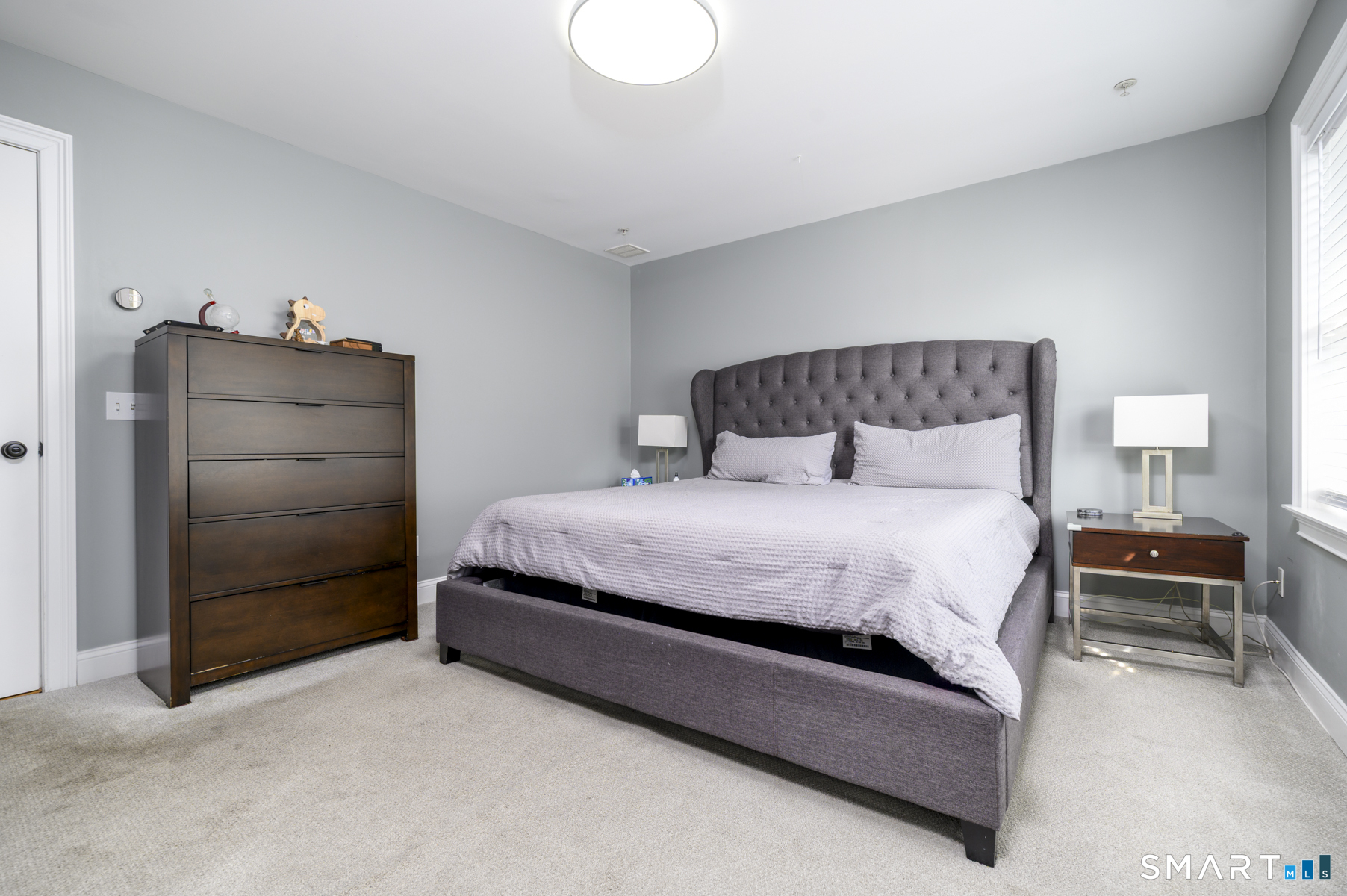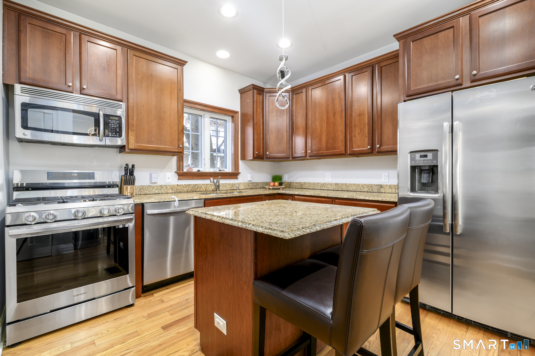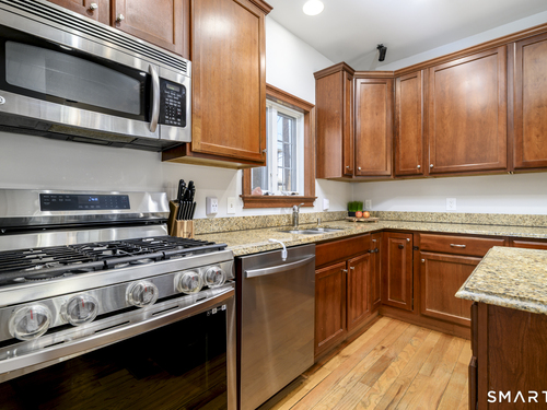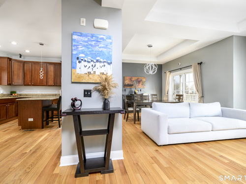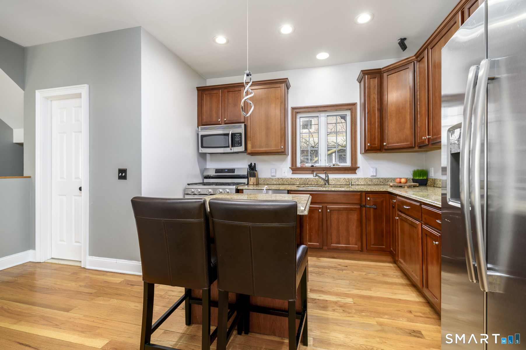 Freshly painted and move-in ready, this beautifully maintained 2-bedroom, 2.5-bath townhouse with a two-car garage offers the perfect blend of comfort, style, and convenience. The main level features gleaming hardwood floors and an inviting, open flow ideal for both everyday living and entertaining. The kitchen is equipped with a center island and seamlessly connects to the dining area, complete with sliders leading to a private balcony-perfect for enjoying fresh air. The living room is enhanced by elegant coffered ceilings, adding a touch of sophistication.Upstairs, the spacious primary suite includes a walk-in closet and a full bath with a shower stall. A second bedroom, full hallway bath with tub/shower combination, and convenient in-unit laundry complete the second level. The expansive third floor level functions as a private retreat with the scale and flexibility to serve as a guest suite, home office, or additional sleeping quarters. Its separation from the main living areas creates a quiet, versatile space well-suited for today's flexible living arrangements. Designed with efficiency in mind, the home features a 3-zone HVAC system for optimal comfort. Ideally located with easy access to I-95, the Merritt Parkway, and nearby train stations, this home is perfect for commuters and those seeking a central location close to everything.
