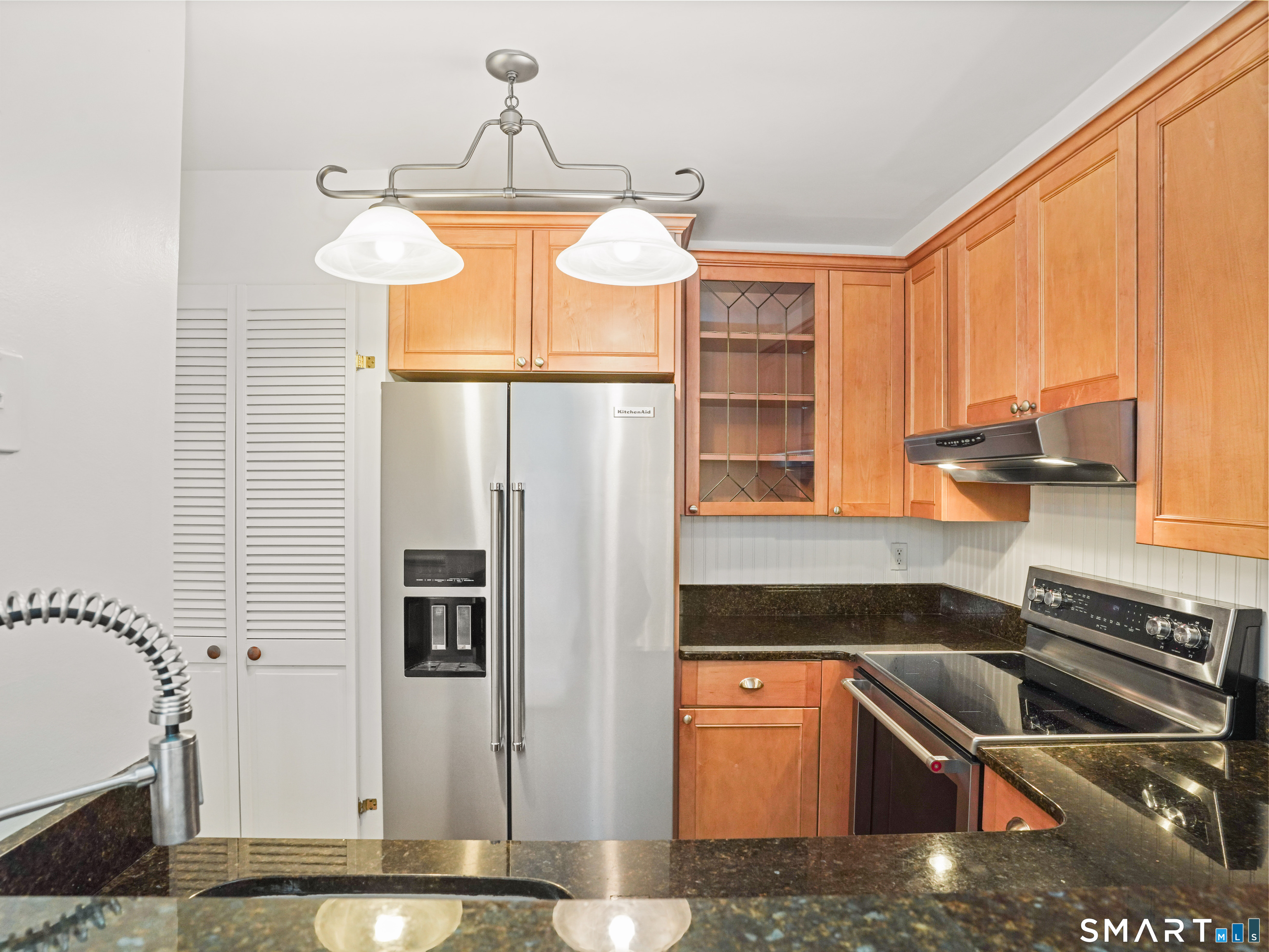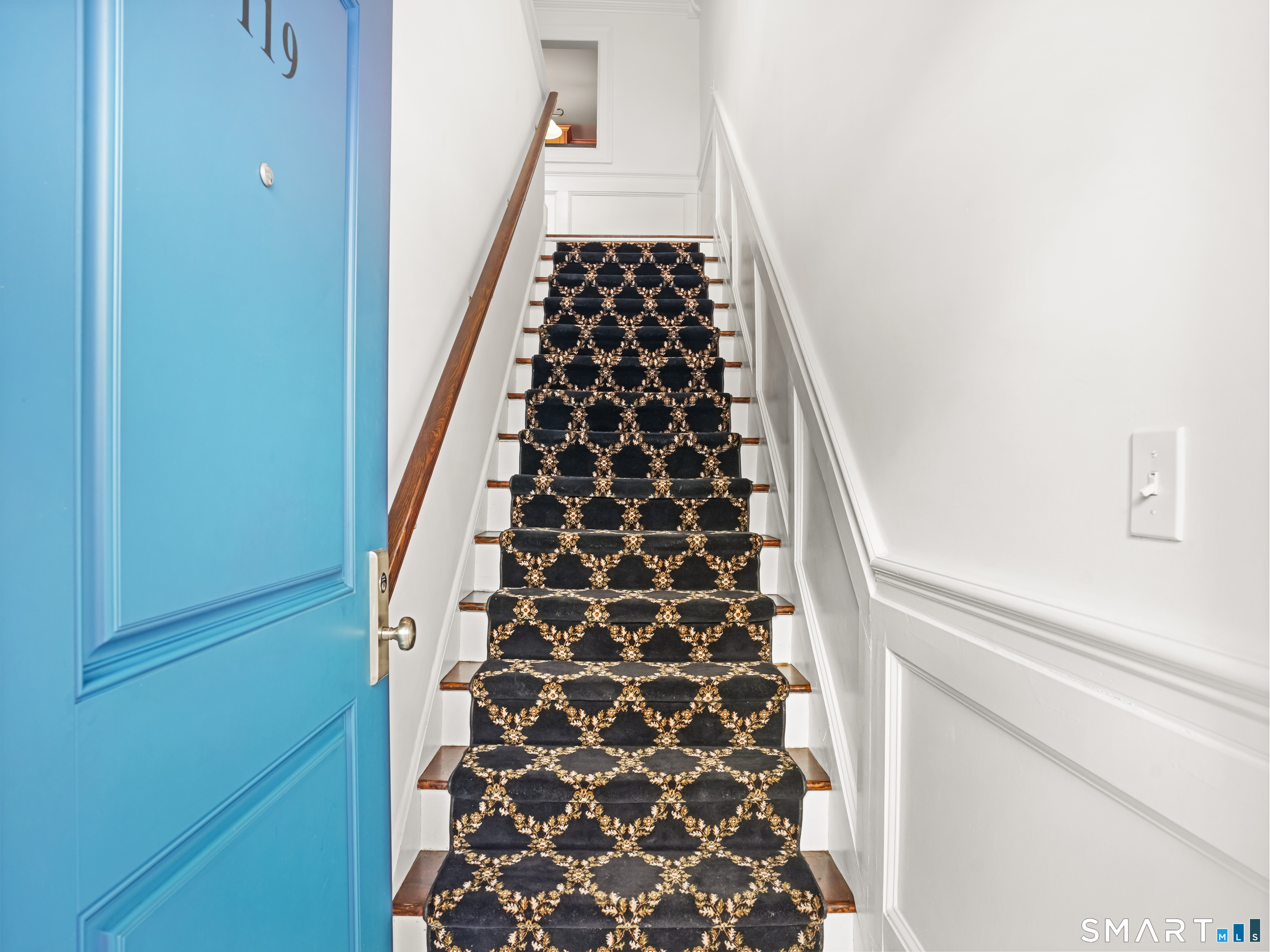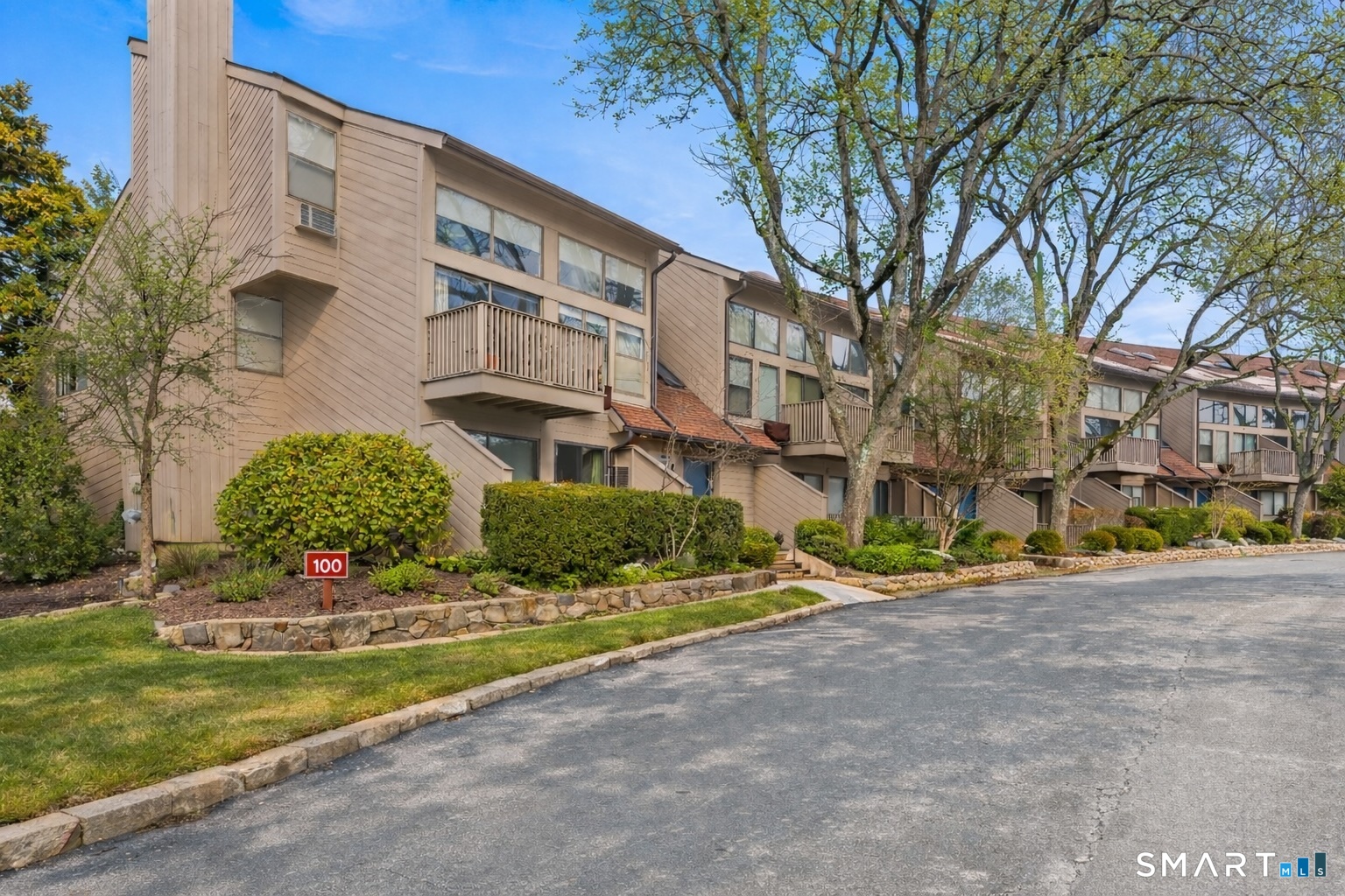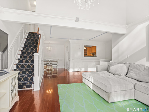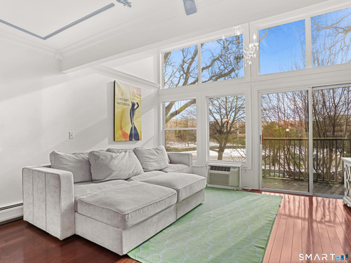 Fabulous duplex one-bedroom condominium located at The Common in Old Greenwich. This sun-filled residence features soaring cathedral ceilings and a private foyer entrance updated in 2019. The open living and dining floor plan showcases hardwood floors throughout, crown moldings, and abundant natural light. The well-appointed kitchen is equipped with luxury appliances, while California Closets provide exceptional storage throughout the home. Enjoy outdoor living from your private balcony, plus the convenience of an additional private storage unit. Start 2026 right!