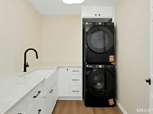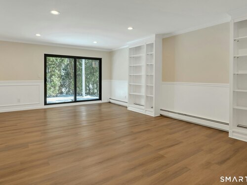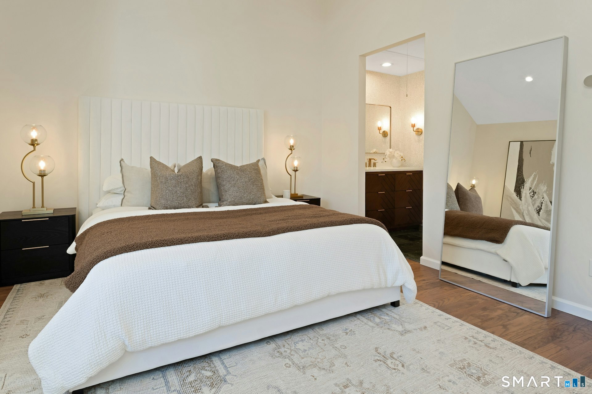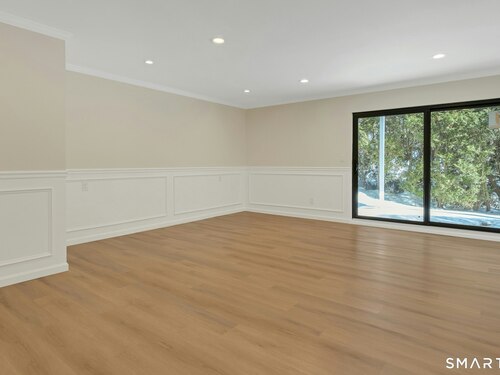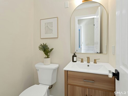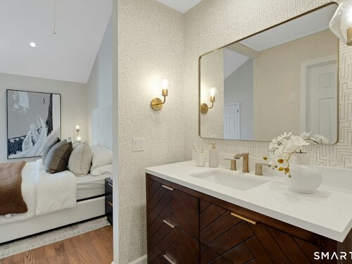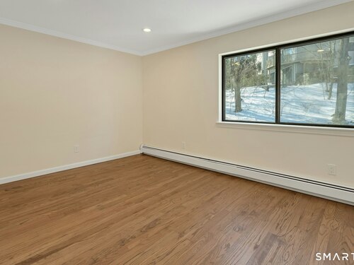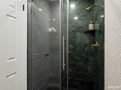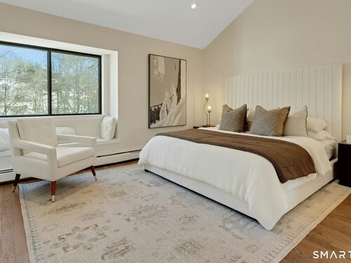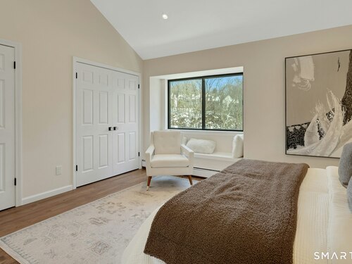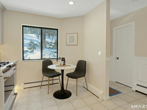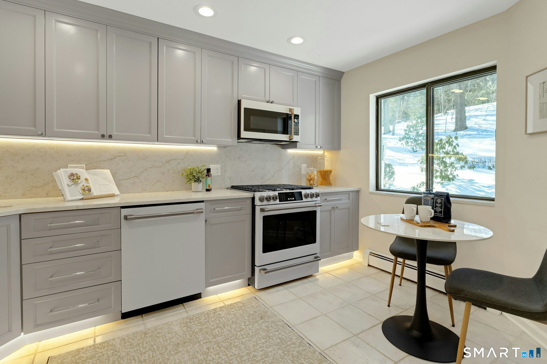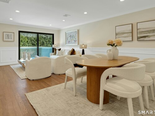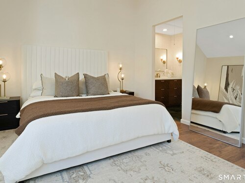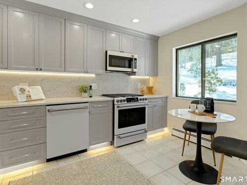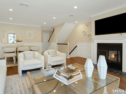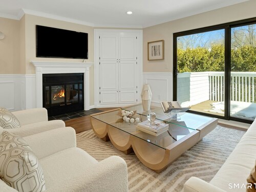 Fully reimagined luxury 2-bedroom, 2.5-bath townhouse elegantly positioned at the end of a private cul-de-sac in highly sought-after Glenville, offering a sophisticated blend of refined design, exceptional craftsmanship, and turnkey living. The main level showcases an expansive open-concept living and dining area centered around a stylish wood buring fireplace with custom built-ins and sliding glass doors leading to a private deck with serene woodland views. The designer kitchen features top-of-the-line appliances, sleek cabinetry, quartz countertops that extend seamlessly to the backsplash, and elegant under-cabinet lighting. The tastefully updated powder room is conveniently located just off the kitchen. Upstairs, the stunning primary suite offers vaulted ceilings, a custom walk-in closet, and a beautifully appointed en-suite bath. A spacious second bedroom and a fully renovated hall bath featuring designer textured wallpaper and a beautifully tiled tub/shower combination complete the upper level. The finished lower level provides exceptional versatility with a spacious family room ideal for a media room, home office, or additional living space, along with a dedicated laundry area and abundant storage. Additional highlights include a detached garage, assigned parking space, and a peaceful setting surrounded by nature. This exceptional residence offers luxury, privacy, and convenience in one of the most desirable locations in Greenwich.