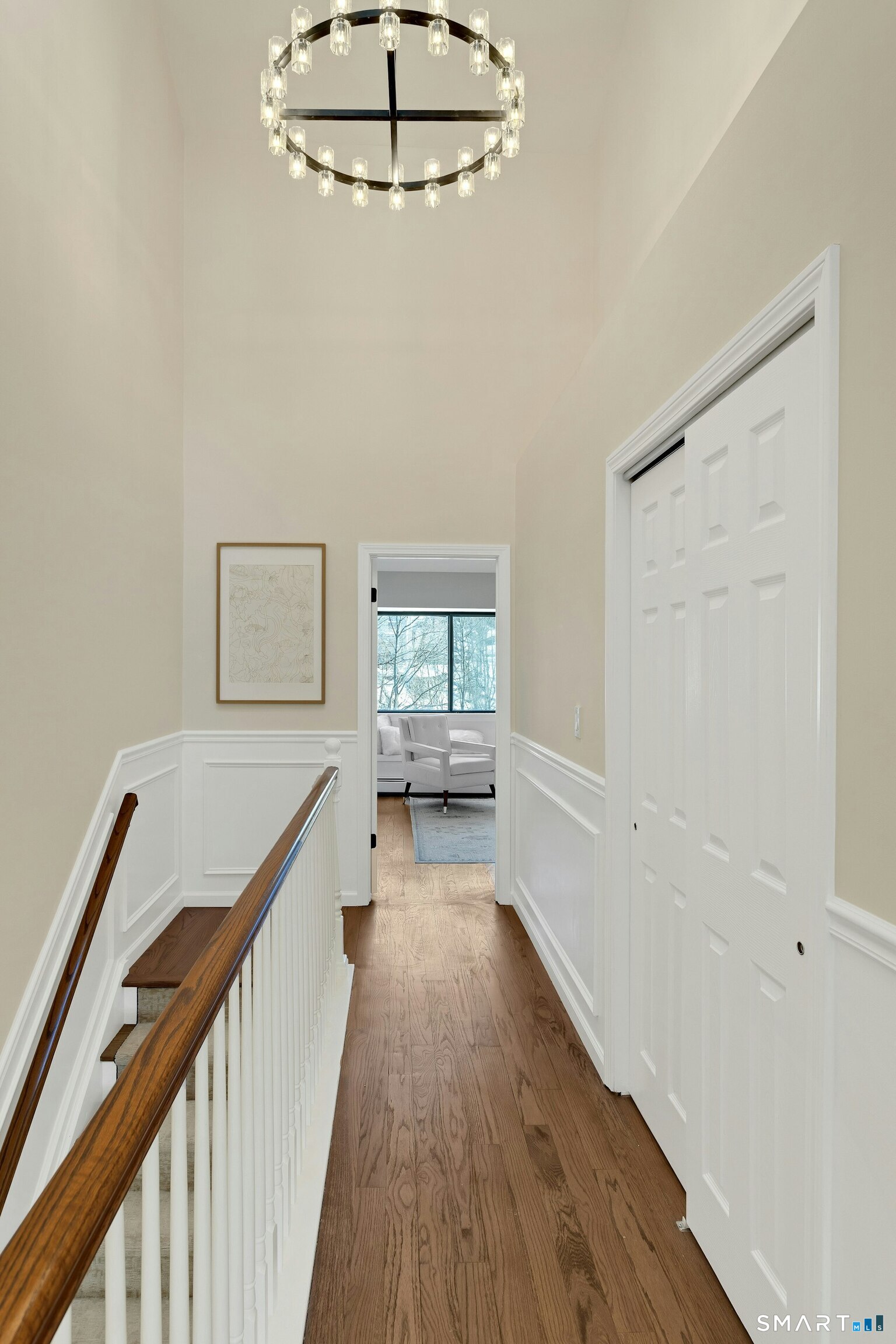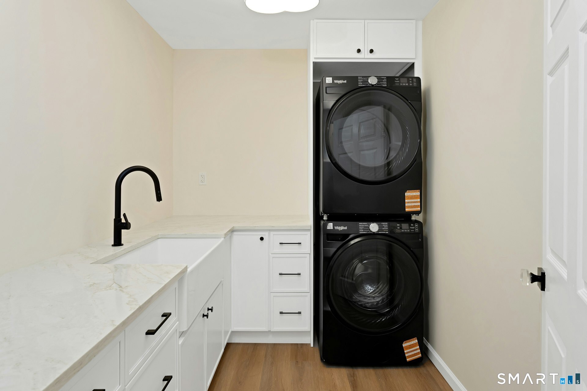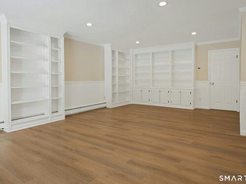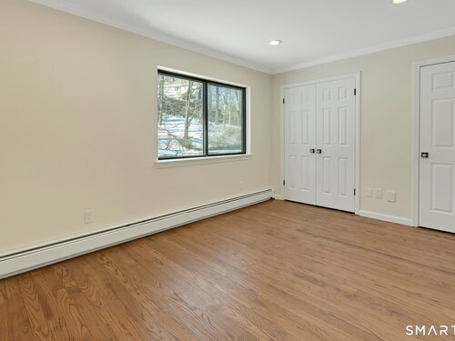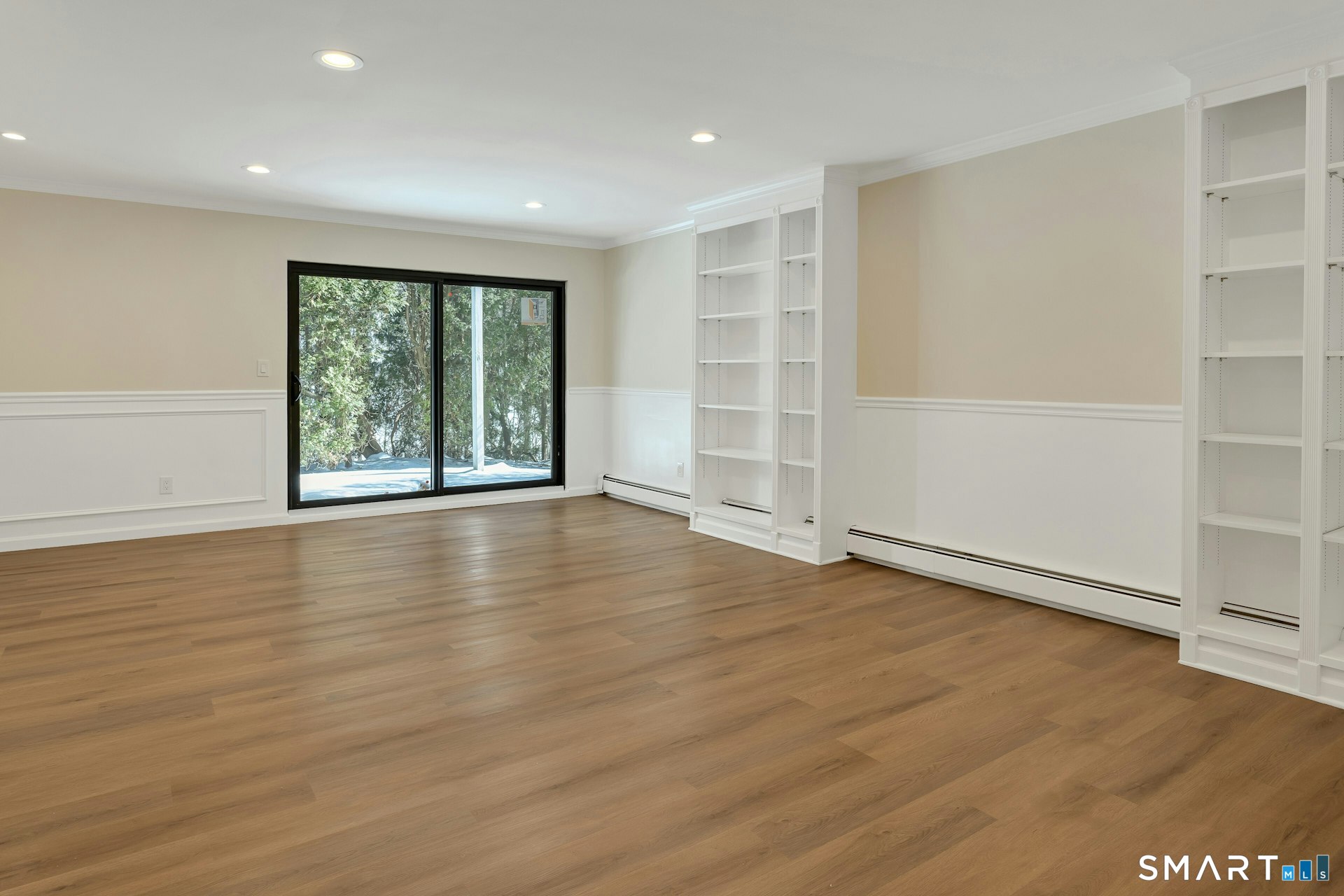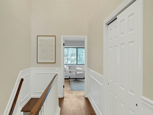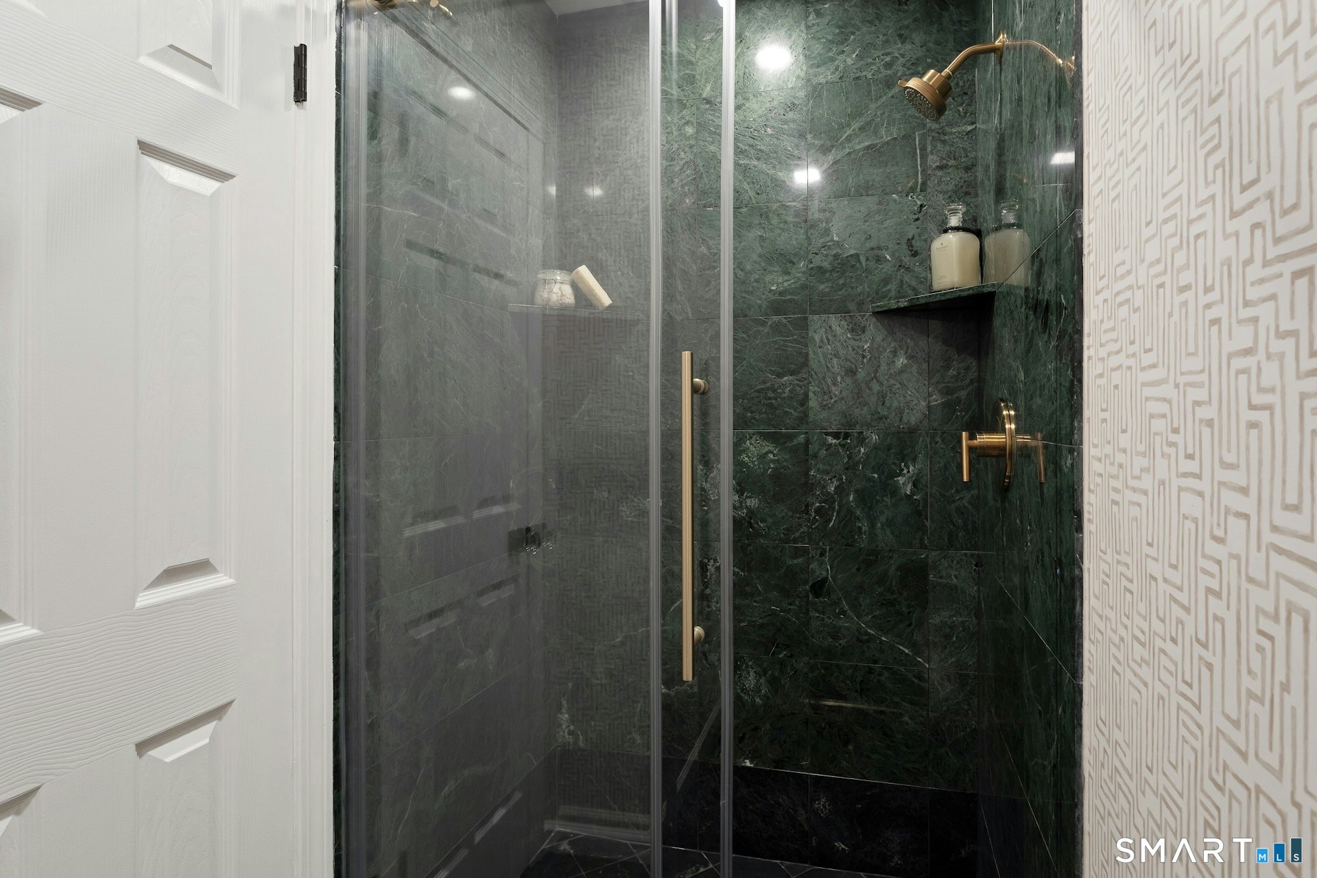 Fully reimagined luxury 2-bedroom, 2.5-bath townhouse elegantly positioned at the end of a private cul-de-sac in highly sought-after Glenville, offering a sophisticated blend of refined design, exceptional craftsmanship, and turnkey living. The main level showcases an expansive open-concept living and dining area centered around a stylish wood buring fireplace with custom built-ins and sliding glass doors leading to a private deck with serene woodland views. The designer kitchen features top-of-the-line appliances, sleek cabinetry, quartz countertops that extend seamlessly to the backsplash, and elegant under-cabinet lighting. The tastefully updated powder room is conveniently located just off the kitchen. Upstairs, the stunning primary suite offers vaulted ceilings, a custom walk-in closet, and a beautifully appointed en-suite bath. A spacious second bedroom and a fully renovated hall bath featuring designer textured wallpaper and a beautifully tiled tub/shower combination complete the upper level. The finished lower level provides exceptional versatility with a spacious family room ideal for a media room, home office, or additional living space, along with a dedicated laundry area and abundant storage. Additional highlights include a detached garage, assigned parking space, and a peaceful setting surrounded by nature. This exceptional residence offers luxury, privacy, and convenience in one of the most desirable locations in Greenwich.