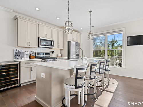 Welcome to this beautifully upgraded townhome offering luxury resort-style living in one of Danbury's most sought-after communities. This exceptional 3-bed, 3 bath residence spans 2,120 square feet of thoughtfully designed living space, showcasing refined finishes and meticulous attention to detail throughout including extensive professionally designed custom-built storage solutions rarely found in townhome living. The open-concept main level serves as the heart of the home, anchored by a stunning designer kitchen equipped with high-end appliances, an oversized island and sliding doors open to a private deck overlooking peaceful wooded views. Rich hardwood floors extend throughout the home, complemented by elegant crown molding, upgraded lighting fixtures, statement chandeliers, and high-end ceiling fans in every bedroom. The generously sized bedrooms feature vaulted ceilings while all bathrooms have been tastefully updated with modern finishes and contemporary design elements. The finished lower level adds versatile living space with a custom built in desk area, making it ideal for a home office, media room, gym, or guest retreat. Enjoy maintenance-free living with access to Rivington's premier resort-style amenities, including a clubhouse, indoor lap pool, two outdoor pools, fitness center, pickleball and tennis courts, billiards room, movie theater, sauna, playground, and more. All within minutes to dining, shopping and I-84, this home offers both luxury and convenience.